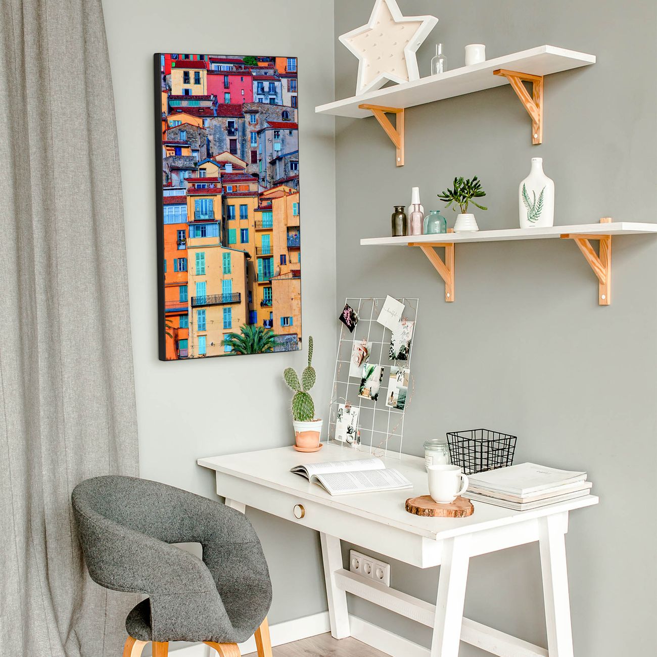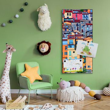 FUNKTION:  Die banjado Magnettafel mit Motiv Häuserberg Motiv bringt Ordnung in Ihr Zettelchaos. Fotos, Termine, Notizen oder Rezepte lassen Sich hier stilvoll mit Magneten ordnen, Sie behalten alles im Blick. An der Design Magnettafel halten alle handesüblichen Magnete. DESIGN:  Die magnetische Pinnwand mit dem Motiv Motiv Häuserberg ist ein eleganter Begleiter im Alltag. Mit dieser Memotafel aus Metall haben Sie auch ohne Notizen und Magnete ein schönes Dekoelement. Das Format bietet Ihnen ausreichend Platz um alle wichtigen Informationen im Blick zu behalten. DETAILS:  Die Magnettafel besteht aus silber-grau, weiß oder schwarzlackiertem Stahl. Sie hat eine Größe von 37 x 78 x 2cm. Es befinden sich auf der Rückseite vorgefertigte Aufhängungen die eine schnelle und unkomplizierte Anbringung ermöglichen. Das Motiv ist mit einem seidenmatten Laminat versehen und schützt so zusätzlich vor Kratzern. NUTZEN:  Sie können dieses Memoboard groß als Wandbild nutzen, es halten alle handelsüblichen Magneten daran. Die Pinnwand ist mit einem feuchten Lappen oder Schwamm abwischbar. Sie finden bei uns eine große Auswahl an passenden Magneten. BANJADO:  Wir sind ein kleines Team aus dem Herzen von Sachsen. Wir fertigen alle Artikel von Hand für Sie an, Sie erhalten keine preiswerte Importware. Auf Wunsch können Sie auch Ihr eigenes Foto auf die Magnettafel aufbringen, schreiben Sie uns an. Herzlichst, Ihr banjado-Team