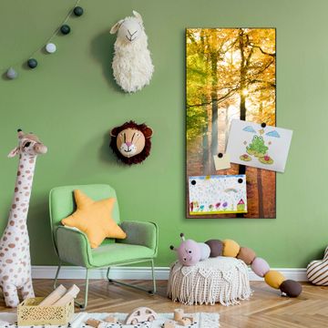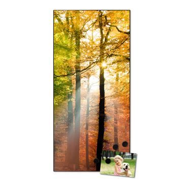 FUNKTION:  Die banjado Magnettafel mit Motiv Herbstwald Motiv bringt Ordnung in Ihr Zettelchaos. Fotos, Termine, Notizen oder Rezepte lassen Sich hier stilvoll mit Magneten ordnen, Sie behalten alles im Blick. An der Design Magnettafel halten alle handesüblichen Magnete. DESIGN:  Die magnetische Pinnwand mit dem Motiv Motiv Herbstwald ist ein eleganter Begleiter im Alltag. Mit dieser Memotafel aus Metall haben Sie auch ohne Notizen und Magnete ein schönes Dekoelement. Das Format bietet Ihnen ausreichend Platz um alle wichtigen Informationen im Blick zu behalten. DETAILS:  Die Magnettafel besteht aus silber-grau, weiß oder schwarzlackiertem Stahl. Sie hat eine Größe von 37 x 78 x 2cm. Es befinden sich auf der Rückseite vorgefertigte Aufhängungen die eine schnelle und unkomplizierte Anbringung ermöglichen. Das Motiv ist mit einem seidenmatten Laminat versehen und schützt so zusätzlich vor Kratzern. NUTZEN:  Sie können dieses Memoboard groß als Wandbild nutzen, es halten alle handelsüblichen Magneten daran. Die Pinnwand ist mit einem feuchten Lappen oder Schwamm abwischbar. Sie finden bei uns eine große Auswahl an passenden Magneten. BANJADO:  Wir sind ein kleines Team aus dem Herzen von Sachsen. Wir fertigen alle Artikel von Hand für Sie an, Sie erhalten keine preiswerte Importware. Auf Wunsch können Sie auch Ihr eigenes Foto auf die Magnettafel aufbringen, schreiben Sie uns an. Herzlichst, Ihr banjado-Team