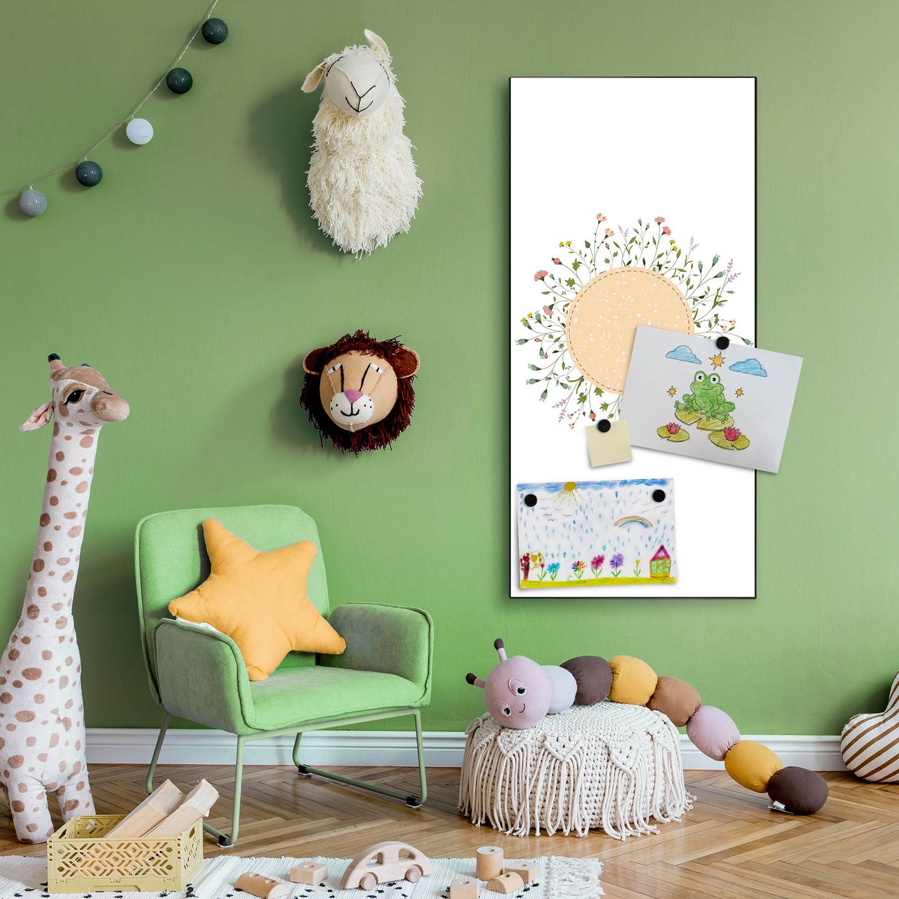 FUNKTION:  Die banjado Magnettafel mit Motiv Hibiskus Kreis Motiv bringt Ordnung in Ihr Zettelchaos. Fotos, Termine, Notizen oder Rezepte lassen Sich hier stilvoll mit Magneten ordnen, Sie behalten alles im Blick. An der Design Magnettafel halten alle handesüblichen Magnete. DESIGN:  Die magnetische Pinnwand mit dem Motiv Motiv Hibiskus Kreis ist ein eleganter Begleiter im Alltag. Mit dieser Memotafel aus Metall haben Sie auch ohne Notizen und Magnete ein schönes Dekoelement. Das Format bietet Ihnen ausreichend Platz um alle wichtigen Informationen im Blick zu behalten. DETAILS:  Die Magnettafel besteht aus silber-grau, weiß oder schwarzlackiertem Stahl. Sie hat eine Größe von 37 x 78 x 2cm. Es befinden sich auf der Rückseite vorgefertigte Aufhängungen die eine schnelle und unkomplizierte Anbringung ermöglichen. Das Motiv ist mit einem seidenmatten Laminat versehen und schützt so zusätzlich vor Kratzern. NUTZEN:  Sie können dieses Memoboard groß als Wandbild nutzen, es halten alle handelsüblichen Magneten daran. Die Pinnwand ist mit einem feuchten Lappen oder Schwamm abwischbar. Sie finden bei uns eine große Auswahl an passenden Magneten. BANJADO:  Wir sind ein kleines Team aus dem Herzen von Sachsen. Wir fertigen alle Artikel von Hand für Sie an, Sie erhalten keine preiswerte Importware. Auf Wunsch können Sie auch Ihr eigenes Foto auf die Magnettafel aufbringen, schreiben Sie uns an. Herzlichst, Ihr banjado-Team
