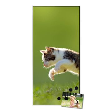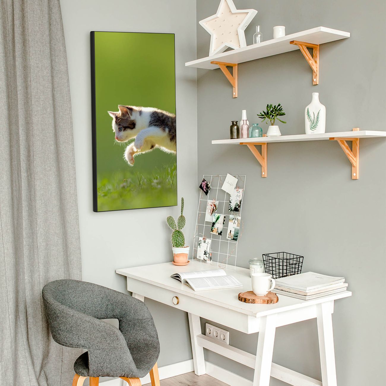 FUNKTION:  Die banjado Magnettafel mit Motiv Jagende Katze Motiv bringt Ordnung in Ihr Zettelchaos. Fotos, Termine, Notizen oder Rezepte lassen Sich hier stilvoll mit Magneten ordnen, Sie behalten alles im Blick. An der Design Magnettafel halten alle handesüblichen Magnete. DESIGN:  Die magnetische Pinnwand mit dem Motiv Motiv Jagende Katze ist ein eleganter Begleiter im Alltag. Mit dieser Memotafel aus Metall haben Sie auch ohne Notizen und Magnete ein schönes Dekoelement. Das Format bietet Ihnen ausreichend Platz um alle wichtigen Informationen im Blick zu behalten. DETAILS:  Die Magnettafel besteht aus silber-grau, weiß oder schwarzlackiertem Stahl. Sie hat eine Größe von 37 x 78 x 2cm. Es befinden sich auf der Rückseite vorgefertigte Aufhängungen die eine schnelle und unkomplizierte Anbringung ermöglichen. Das Motiv ist mit einem seidenmatten Laminat versehen und schützt so zusätzlich vor Kratzern. NUTZEN:  Sie können dieses Memoboard groß als Wandbild nutzen, es halten alle handelsüblichen Magneten daran. Die Pinnwand ist mit einem feuchten Lappen oder Schwamm abwischbar. Sie finden bei uns eine große Auswahl an passenden Magneten. BANJADO:  Wir sind ein kleines Team aus dem Herzen von Sachsen. Wir fertigen alle Artikel von Hand für Sie an, Sie erhalten keine preiswerte Importware. Auf Wunsch können Sie auch Ihr eigenes Foto auf die Magnettafel aufbringen, schreiben Sie uns an. Herzlichst, Ihr banjado-Team