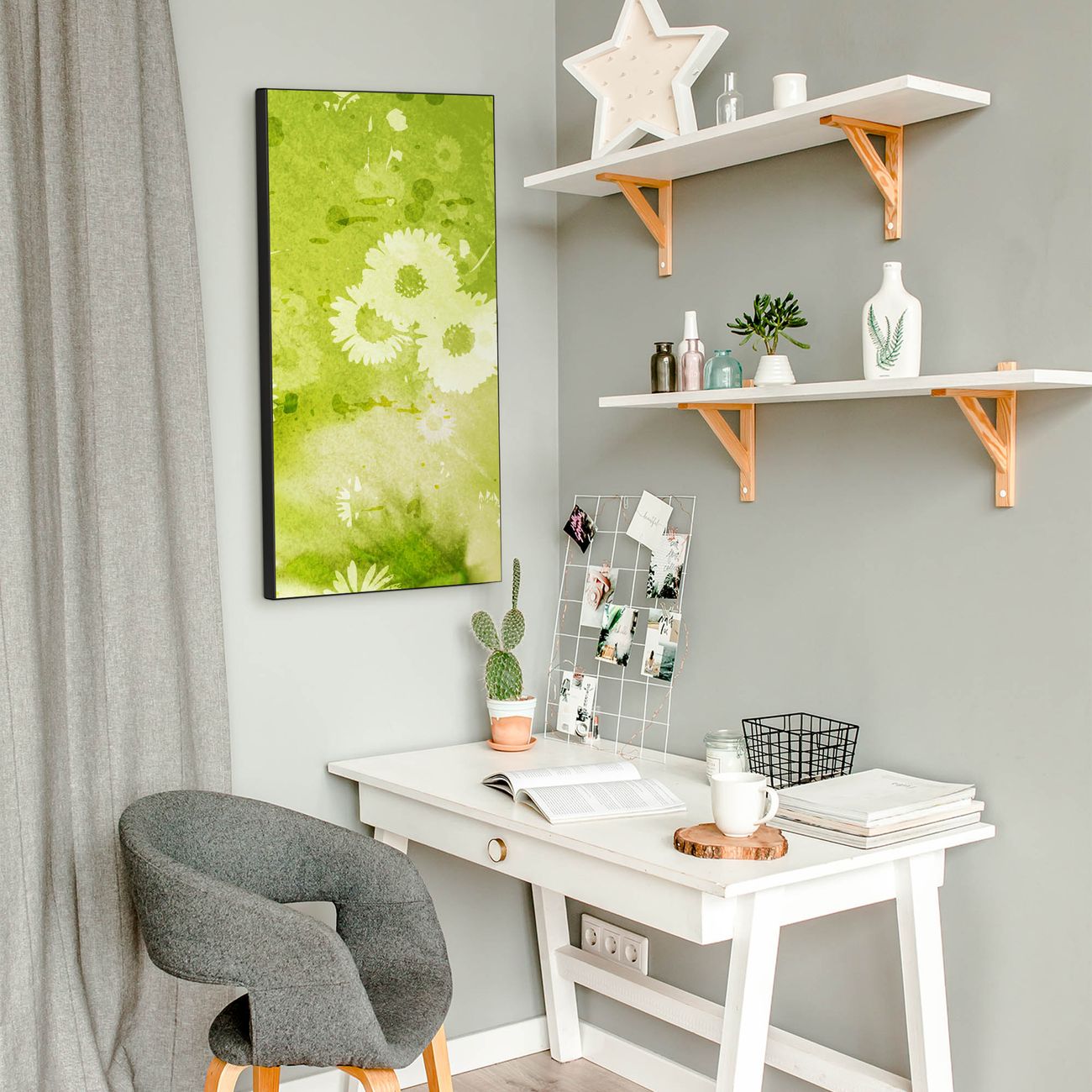 FUNKTION:  Die banjado Magnettafel mit Motiv Kamille Grün Motiv bringt Ordnung in Ihr Zettelchaos. Fotos, Termine, Notizen oder Rezepte lassen Sich hier stilvoll mit Magneten ordnen, Sie behalten alles im Blick. An der Design Magnettafel halten alle handesüblichen Magnete. DESIGN:  Die magnetische Pinnwand mit dem Motiv Motiv Kamille Grün ist ein eleganter Begleiter im Alltag. Mit dieser Memotafel aus Metall haben Sie auch ohne Notizen und Magnete ein schönes Dekoelement. Das Format bietet Ihnen ausreichend Platz um alle wichtigen Informationen im Blick zu behalten. DETAILS:  Die Magnettafel besteht aus silber-grau, weiß oder schwarzlackiertem Stahl. Sie hat eine Größe von 37 x 78 x 2cm. Es befinden sich auf der Rückseite vorgefertigte Aufhängungen die eine schnelle und unkomplizierte Anbringung ermöglichen. Das Motiv ist mit einem seidenmatten Laminat versehen und schützt so zusätzlich vor Kratzern. NUTZEN:  Sie können dieses Memoboard groß als Wandbild nutzen, es halten alle handelsüblichen Magneten daran. Die Pinnwand ist mit einem feuchten Lappen oder Schwamm abwischbar. Sie finden bei uns eine große Auswahl an passenden Magneten. BANJADO:  Wir sind ein kleines Team aus dem Herzen von Sachsen. Wir fertigen alle Artikel von Hand für Sie an, Sie erhalten keine preiswerte Importware. Auf Wunsch können Sie auch Ihr eigenes Foto auf die Magnettafel aufbringen, schreiben Sie uns an. Herzlichst, Ihr banjado-Team