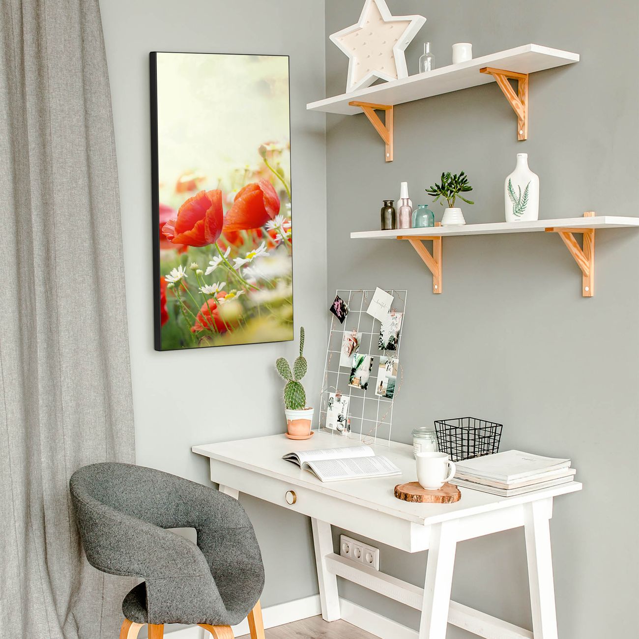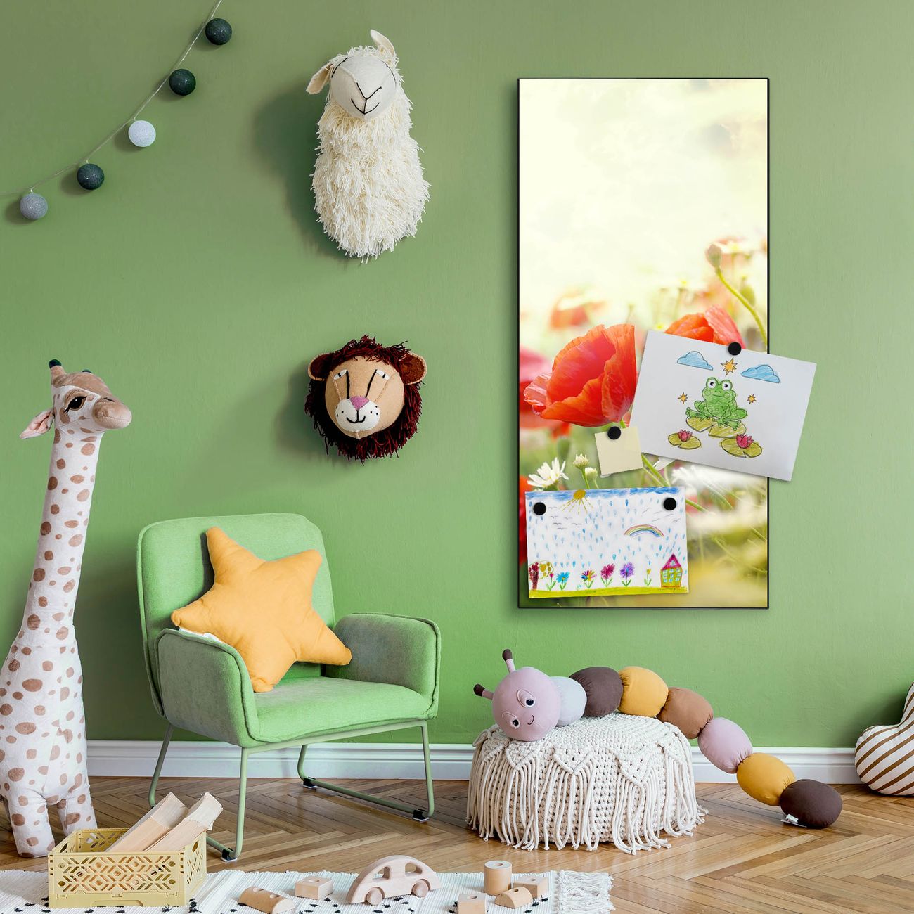 FUNKTION:  Die banjado Magnettafel mit Motiv Kamille Und Mohn Motiv bringt Ordnung in Ihr Zettelchaos. Fotos, Termine, Notizen oder Rezepte lassen Sich hier stilvoll mit Magneten ordnen, Sie behalten alles im Blick. An der Design Magnettafel halten alle handesüblichen Magnete. DESIGN:  Die magnetische Pinnwand mit dem Motiv Motiv Kamille Und Mohn ist ein eleganter Begleiter im Alltag. Mit dieser Memotafel aus Metall haben Sie auch ohne Notizen und Magnete ein schönes Dekoelement. Das Format bietet Ihnen ausreichend Platz um alle wichtigen Informationen im Blick zu behalten. DETAILS:  Die Magnettafel besteht aus silber-grau, weiß oder schwarzlackiertem Stahl. Sie hat eine Größe von 37 x 78 x 2cm. Es befinden sich auf der Rückseite vorgefertigte Aufhängungen die eine schnelle und unkomplizierte Anbringung ermöglichen. Das Motiv ist mit einem seidenmatten Laminat versehen und schützt so zusätzlich vor Kratzern. NUTZEN:  Sie können dieses Memoboard groß als Wandbild nutzen, es halten alle handelsüblichen Magneten daran. Die Pinnwand ist mit einem feuchten Lappen oder Schwamm abwischbar. Sie finden bei uns eine große Auswahl an passenden Magneten. BANJADO:  Wir sind ein kleines Team aus dem Herzen von Sachsen. Wir fertigen alle Artikel von Hand für Sie an, Sie erhalten keine preiswerte Importware. Auf Wunsch können Sie auch Ihr eigenes Foto auf die Magnettafel aufbringen, schreiben Sie uns an. Herzlichst, Ihr banjado-Team