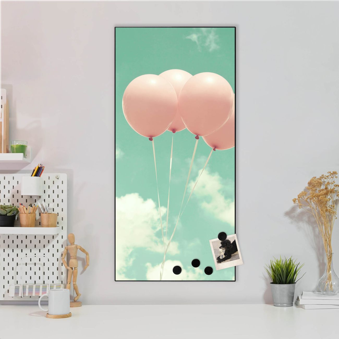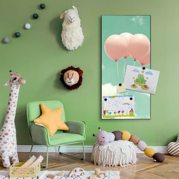 FUNKTION:  Die banjado Magnettafel mit Motiv Rosa Ballons Motiv bringt Ordnung in Ihr Zettelchaos. Fotos, Termine, Notizen oder Rezepte lassen Sich hier stilvoll mit Magneten ordnen, Sie behalten alles im Blick. An der Design Magnettafel halten alle handesüblichen Magnete. DESIGN:  Die magnetische Pinnwand mit dem Motiv Motiv Rosa Ballons ist ein eleganter Begleiter im Alltag. Mit dieser Memotafel aus Metall haben Sie auch ohne Notizen und Magnete ein schönes Dekoelement. Das Format bietet Ihnen ausreichend Platz um alle wichtigen Informationen im Blick zu behalten. DETAILS:  Die Magnettafel besteht aus silber-grau, weiß oder schwarzlackiertem Stahl. Sie hat eine Größe von 37 x 78 x 2cm. Es befinden sich auf der Rückseite vorgefertigte Aufhängungen die eine schnelle und unkomplizierte Anbringung ermöglichen. Das Motiv ist mit einem seidenmatten Laminat versehen und schützt so zusätzlich vor Kratzern. NUTZEN:  Sie können dieses Memoboard groß als Wandbild nutzen, es halten alle handelsüblichen Magneten daran. Die Pinnwand ist mit einem feuchten Lappen oder Schwamm abwischbar. Sie finden bei uns eine große Auswahl an passenden Magneten. BANJADO:  Wir sind ein kleines Team aus dem Herzen von Sachsen. Wir fertigen alle Artikel von Hand für Sie an, Sie erhalten keine preiswerte Importware. Auf Wunsch können Sie auch Ihr eigenes Foto auf die Magnettafel aufbringen, schreiben Sie uns an. Herzlichst, Ihr banjado-Team