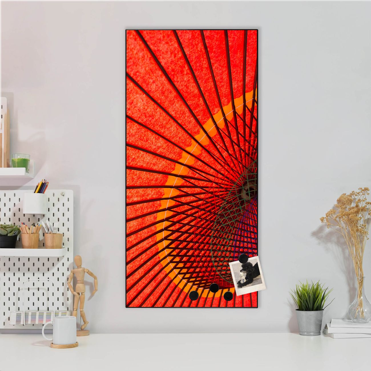 FUNKTION:  Die banjado Magnettafel mit Motiv Roter Schirm Motiv bringt Ordnung in Ihr Zettelchaos. Fotos, Termine, Notizen oder Rezepte lassen Sich hier stilvoll mit Magneten ordnen, Sie behalten alles im Blick. An der Design Magnettafel halten alle handesüblichen Magnete. DESIGN:  Die magnetische Pinnwand mit dem Motiv Motiv Roter Schirm ist ein eleganter Begleiter im Alltag. Mit dieser Memotafel aus Metall haben Sie auch ohne Notizen und Magnete ein schönes Dekoelement. Das Format bietet Ihnen ausreichend Platz um alle wichtigen Informationen im Blick zu behalten. DETAILS:  Die Magnettafel besteht aus silber-grau, weiß oder schwarzlackiertem Stahl. Sie hat eine Größe von 37 x 78 x 2cm. Es befinden sich auf der Rückseite vorgefertigte Aufhängungen die eine schnelle und unkomplizierte Anbringung ermöglichen. Das Motiv ist mit einem seidenmatten Laminat versehen und schützt so zusätzlich vor Kratzern. NUTZEN:  Sie können dieses Memoboard groß als Wandbild nutzen, es halten alle handelsüblichen Magneten daran. Die Pinnwand ist mit einem feuchten Lappen oder Schwamm abwischbar. Sie finden bei uns eine große Auswahl an passenden Magneten. BANJADO:  Wir sind ein kleines Team aus dem Herzen von Sachsen. Wir fertigen alle Artikel von Hand für Sie an, Sie erhalten keine preiswerte Importware. Auf Wunsch können Sie auch Ihr eigenes Foto auf die Magnettafel aufbringen, schreiben Sie uns an. Herzlichst, Ihr banjado-Team