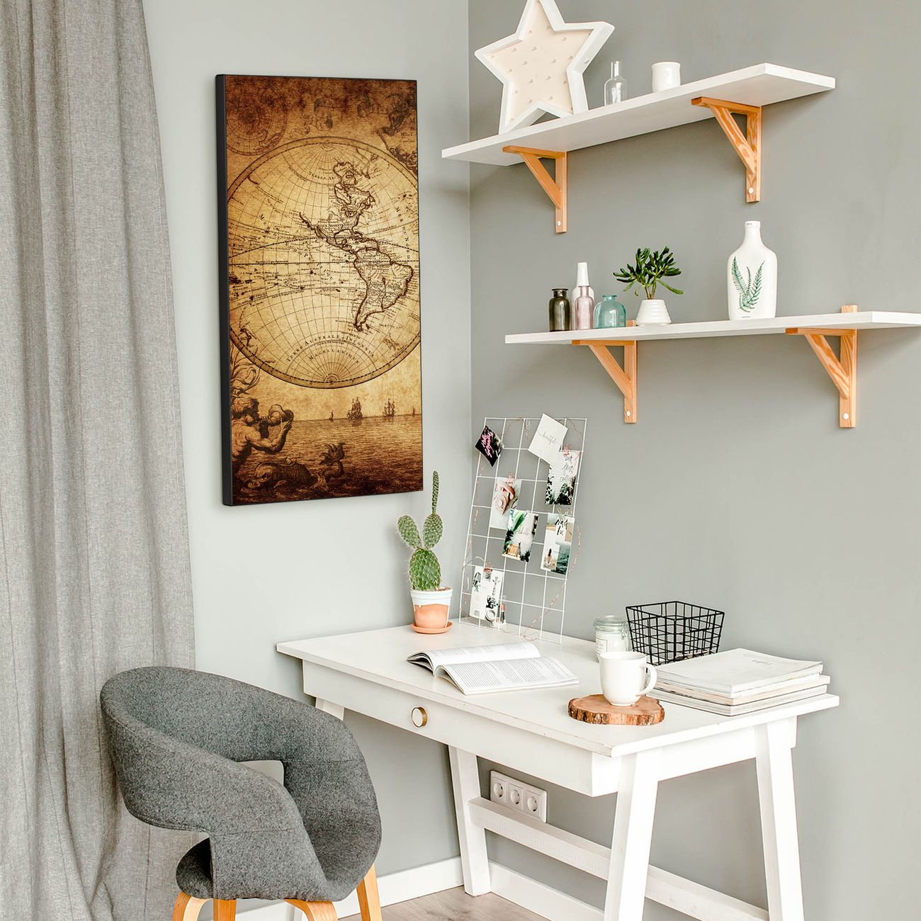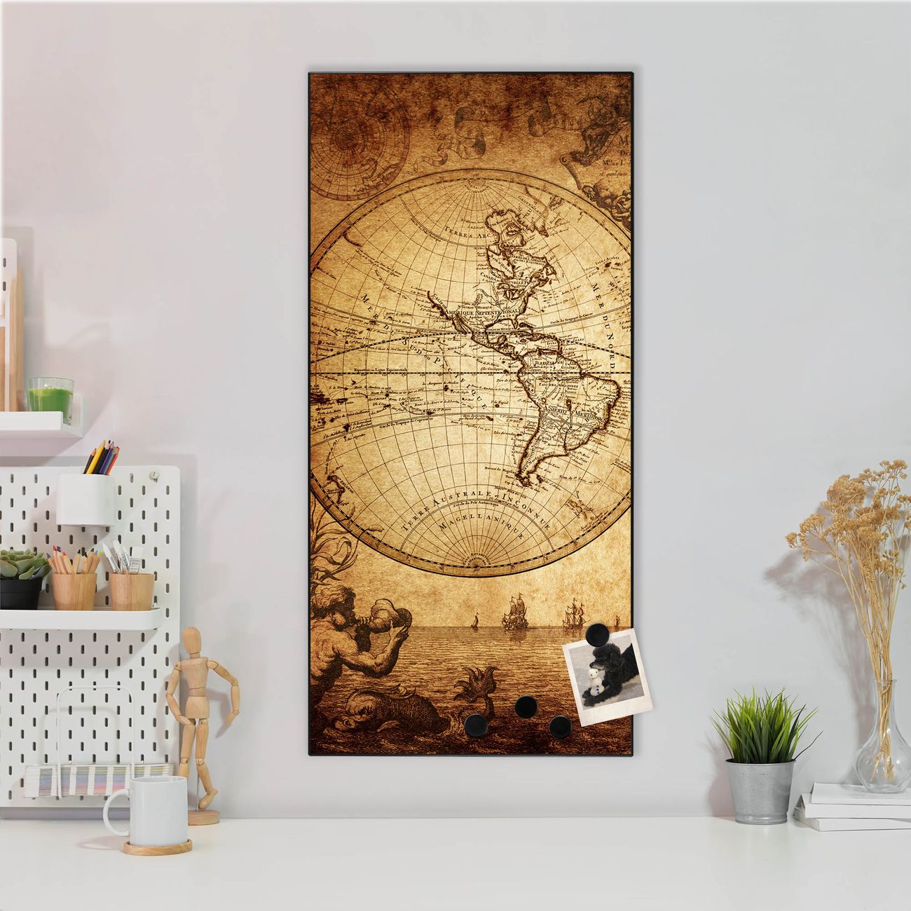 FUNKTION:  Die banjado Magnettafel mit Motiv Sieben Weltmeere Motiv bringt Ordnung in Ihr Zettelchaos. Fotos, Termine, Notizen oder Rezepte lassen Sich hier stilvoll mit Magneten ordnen, Sie behalten alles im Blick. An der Design Magnettafel halten alle handesüblichen Magnete. DESIGN:  Die magnetische Pinnwand mit dem Motiv Motiv Sieben Weltmeere ist ein eleganter Begleiter im Alltag. Mit dieser Memotafel aus Metall haben Sie auch ohne Notizen und Magnete ein schönes Dekoelement. Das Format bietet Ihnen ausreichend Platz um alle wichtigen Informationen im Blick zu behalten. DETAILS:  Die Magnettafel besteht aus silber-grau, weiß oder schwarzlackiertem Stahl. Sie hat eine Größe von 37 x 78 x 2cm. Es befinden sich auf der Rückseite vorgefertigte Aufhängungen die eine schnelle und unkomplizierte Anbringung ermöglichen. Das Motiv ist mit einem seidenmatten Laminat versehen und schützt so zusätzlich vor Kratzern. NUTZEN:  Sie können dieses Memoboard groß als Wandbild nutzen, es halten alle handelsüblichen Magneten daran. Die Pinnwand ist mit einem feuchten Lappen oder Schwamm abwischbar. Sie finden bei uns eine große Auswahl an passenden Magneten. BANJADO:  Wir sind ein kleines Team aus dem Herzen von Sachsen. Wir fertigen alle Artikel von Hand für Sie an, Sie erhalten keine preiswerte Importware. Auf Wunsch können Sie auch Ihr eigenes Foto auf die Magnettafel aufbringen, schreiben Sie uns an. Herzlichst, Ihr banjado-Team