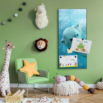 FUNKTION:  Die banjado Magnettafel mit Motiv Tauchender Eisbär Motiv bringt Ordnung in Ihr Zettelchaos. Fotos, Termine, Notizen oder Rezepte lassen Sich hier stilvoll mit Magneten ordnen, Sie behalten alles im Blick. An der Design Magnettafel halten alle handesüblichen Magnete. DESIGN:  Die magnetische Pinnwand mit dem Motiv Motiv Tauchender Eisbär ist ein eleganter Begleiter im Alltag. Mit dieser Memotafel aus Metall haben Sie auch ohne Notizen und Magnete ein schönes Dekoelement. Das Format bietet Ihnen ausreichend Platz um alle wichtigen Informationen im Blick zu behalten. DETAILS:  Die Magnettafel besteht aus silber-grau, weiß oder schwarzlackiertem Stahl. Sie hat eine Größe von 37 x 78 x 2cm. Es befinden sich auf der Rückseite vorgefertigte Aufhängungen die eine schnelle und unkomplizierte Anbringung ermöglichen. Das Motiv ist mit einem seidenmatten Laminat versehen und schützt so zusätzlich vor Kratzern. NUTZEN:  Sie können dieses Memoboard groß als Wandbild nutzen, es halten alle handelsüblichen Magneten daran. Die Pinnwand ist mit einem feuchten Lappen oder Schwamm abwischbar. Sie finden bei uns eine große Auswahl an passenden Magneten. BANJADO:  Wir sind ein kleines Team aus dem Herzen von Sachsen. Wir fertigen alle Artikel von Hand für Sie an, Sie erhalten keine preiswerte Importware. Auf Wunsch können Sie auch Ihr eigenes Foto auf die Magnettafel aufbringen, schreiben Sie uns an. Herzlichst, Ihr banjado-Team