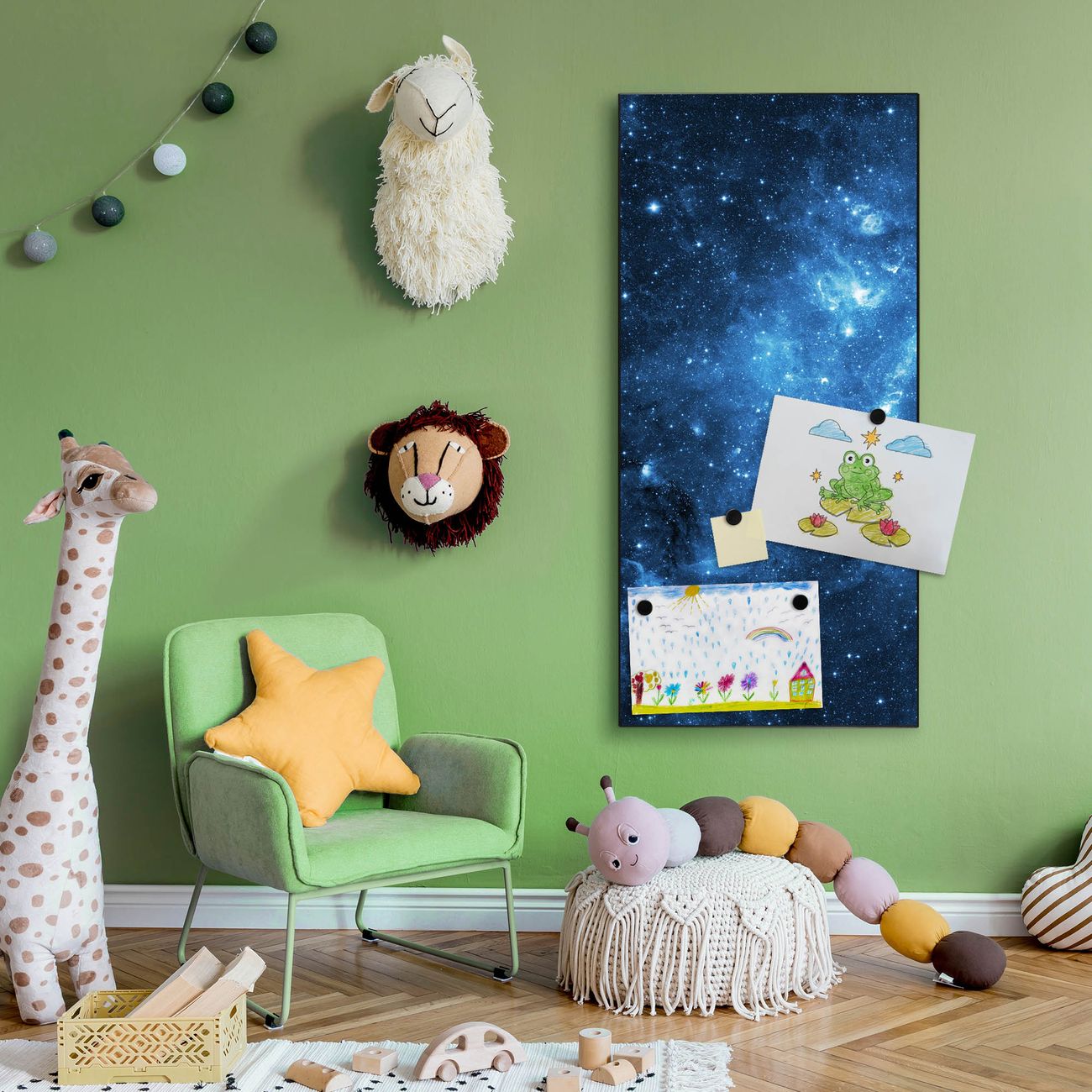FUNKTION:  Die banjado Magnettafel mit Motiv Universum Motiv bringt Ordnung in Ihr Zettelchaos. Fotos, Termine, Notizen oder Rezepte lassen Sich hier stilvoll mit Magneten ordnen, Sie behalten alles im Blick. An der Design Magnettafel halten alle handesüblichen Magnete. DESIGN:  Die magnetische Pinnwand mit dem Motiv Motiv Universum ist ein eleganter Begleiter im Alltag. Mit dieser Memotafel aus Metall haben Sie auch ohne Notizen und Magnete ein schönes Dekoelement. Das Format bietet Ihnen ausreichend Platz um alle wichtigen Informationen im Blick zu behalten. DETAILS:  Die Magnettafel besteht aus silber-grau, weiß oder schwarzlackiertem Stahl. Sie hat eine Größe von 37 x 78 x 2cm. Es befinden sich auf der Rückseite vorgefertigte Aufhängungen die eine schnelle und unkomplizierte Anbringung ermöglichen. Das Motiv ist mit einem seidenmatten Laminat versehen und schützt so zusätzlich vor Kratzern. NUTZEN:  Sie können dieses Memoboard groß als Wandbild nutzen, es halten alle handelsüblichen Magneten daran. Die Pinnwand ist mit einem feuchten Lappen oder Schwamm abwischbar. Sie finden bei uns eine große Auswahl an passenden Magneten. BANJADO:  Wir sind ein kleines Team aus dem Herzen von Sachsen. Wir fertigen alle Artikel von Hand für Sie an, Sie erhalten keine preiswerte Importware. Auf Wunsch können Sie auch Ihr eigenes Foto auf die Magnettafel aufbringen, schreiben Sie uns an. Herzlichst, Ihr banjado-Team