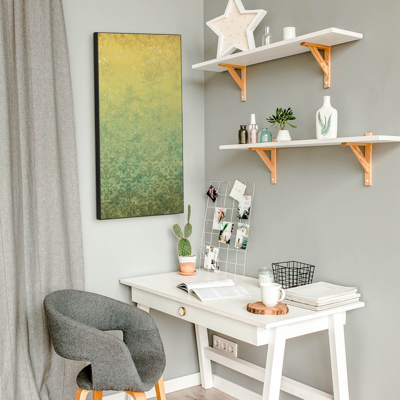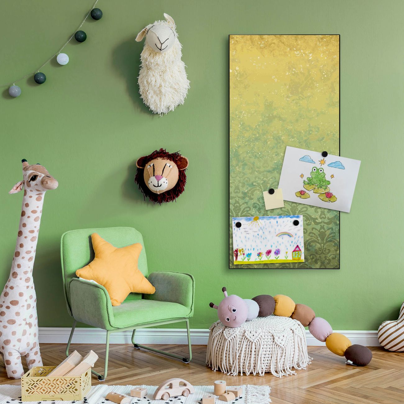 FUNKTION:  Die banjado Magnettafel mit Motiv Vintage Messing Motiv bringt Ordnung in Ihr Zettelchaos. Fotos, Termine, Notizen oder Rezepte lassen Sich hier stilvoll mit Magneten ordnen, Sie behalten alles im Blick. An der Design Magnettafel halten alle handesüblichen Magnete. DESIGN:  Die magnetische Pinnwand mit dem Motiv Motiv Vintage Messing ist ein eleganter Begleiter im Alltag. Mit dieser Memotafel aus Metall haben Sie auch ohne Notizen und Magnete ein schönes Dekoelement. Das Format bietet Ihnen ausreichend Platz um alle wichtigen Informationen im Blick zu behalten. DETAILS:  Die Magnettafel besteht aus silber-grau, weiß oder schwarzlackiertem Stahl. Sie hat eine Größe von 37 x 78 x 2cm. Es befinden sich auf der Rückseite vorgefertigte Aufhängungen die eine schnelle und unkomplizierte Anbringung ermöglichen. Das Motiv ist mit einem seidenmatten Laminat versehen und schützt so zusätzlich vor Kratzern. NUTZEN:  Sie können dieses Memoboard groß als Wandbild nutzen, es halten alle handelsüblichen Magneten daran. Die Pinnwand ist mit einem feuchten Lappen oder Schwamm abwischbar. Sie finden bei uns eine große Auswahl an passenden Magneten. BANJADO:  Wir sind ein kleines Team aus dem Herzen von Sachsen. Wir fertigen alle Artikel von Hand für Sie an, Sie erhalten keine preiswerte Importware. Auf Wunsch können Sie auch Ihr eigenes Foto auf die Magnettafel aufbringen, schreiben Sie uns an. Herzlichst, Ihr banjado-Team