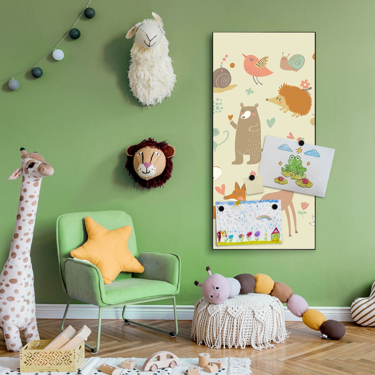 FUNKTION:  Die banjado Magnettafel mit Motiv Waldtiere Motiv bringt Ordnung in Ihr Zettelchaos. Fotos, Termine, Notizen oder Rezepte lassen Sich hier stilvoll mit Magneten ordnen, Sie behalten alles im Blick. An der Design Magnettafel halten alle handesüblichen Magnete. DESIGN:  Die magnetische Pinnwand mit dem Motiv Motiv Waldtiere ist ein eleganter Begleiter im Alltag. Mit dieser Memotafel aus Metall haben Sie auch ohne Notizen und Magnete ein schönes Dekoelement. Das Format bietet Ihnen ausreichend Platz um alle wichtigen Informationen im Blick zu behalten. DETAILS:  Die Magnettafel besteht aus silber-grau, weiß oder schwarzlackiertem Stahl. Sie hat eine Größe von 37 x 78 x 2cm. Es befinden sich auf der Rückseite vorgefertigte Aufhängungen die eine schnelle und unkomplizierte Anbringung ermöglichen. Das Motiv ist mit einem seidenmatten Laminat versehen und schützt so zusätzlich vor Kratzern. NUTZEN:  Sie können dieses Memoboard groß als Wandbild nutzen, es halten alle handelsüblichen Magneten daran. Die Pinnwand ist mit einem feuchten Lappen oder Schwamm abwischbar. Sie finden bei uns eine große Auswahl an passenden Magneten. BANJADO:  Wir sind ein kleines Team aus dem Herzen von Sachsen. Wir fertigen alle Artikel von Hand für Sie an, Sie erhalten keine preiswerte Importware. Auf Wunsch können Sie auch Ihr eigenes Foto auf die Magnettafel aufbringen, schreiben Sie uns an. Herzlichst, Ihr banjado-Team