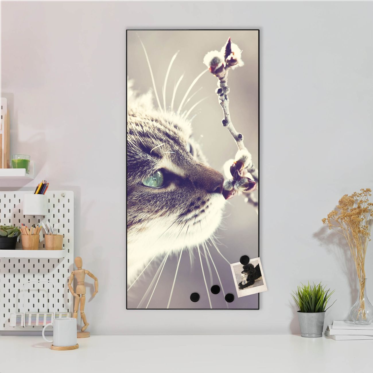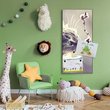 FUNKTION:  Die banjado Magnettafel mit Motiv Weidenkätzchen Motiv bringt Ordnung in Ihr Zettelchaos. Fotos, Termine, Notizen oder Rezepte lassen Sich hier stilvoll mit Magneten ordnen, Sie behalten alles im Blick. An der Design Magnettafel halten alle handesüblichen Magnete. DESIGN:  Die magnetische Pinnwand mit dem Motiv Motiv Weidenkätzchen ist ein eleganter Begleiter im Alltag. Mit dieser Memotafel aus Metall haben Sie auch ohne Notizen und Magnete ein schönes Dekoelement. Das Format bietet Ihnen ausreichend Platz um alle wichtigen Informationen im Blick zu behalten. DETAILS:  Die Magnettafel besteht aus silber-grau, weiß oder schwarzlackiertem Stahl. Sie hat eine Größe von 37 x 78 x 2cm. Es befinden sich auf der Rückseite vorgefertigte Aufhängungen die eine schnelle und unkomplizierte Anbringung ermöglichen. Das Motiv ist mit einem seidenmatten Laminat versehen und schützt so zusätzlich vor Kratzern. NUTZEN:  Sie können dieses Memoboard groß als Wandbild nutzen, es halten alle handelsüblichen Magneten daran. Die Pinnwand ist mit einem feuchten Lappen oder Schwamm abwischbar. Sie finden bei uns eine große Auswahl an passenden Magneten. BANJADO:  Wir sind ein kleines Team aus dem Herzen von Sachsen. Wir fertigen alle Artikel von Hand für Sie an, Sie erhalten keine preiswerte Importware. Auf Wunsch können Sie auch Ihr eigenes Foto auf die Magnettafel aufbringen, schreiben Sie uns an. Herzlichst, Ihr banjado-Team