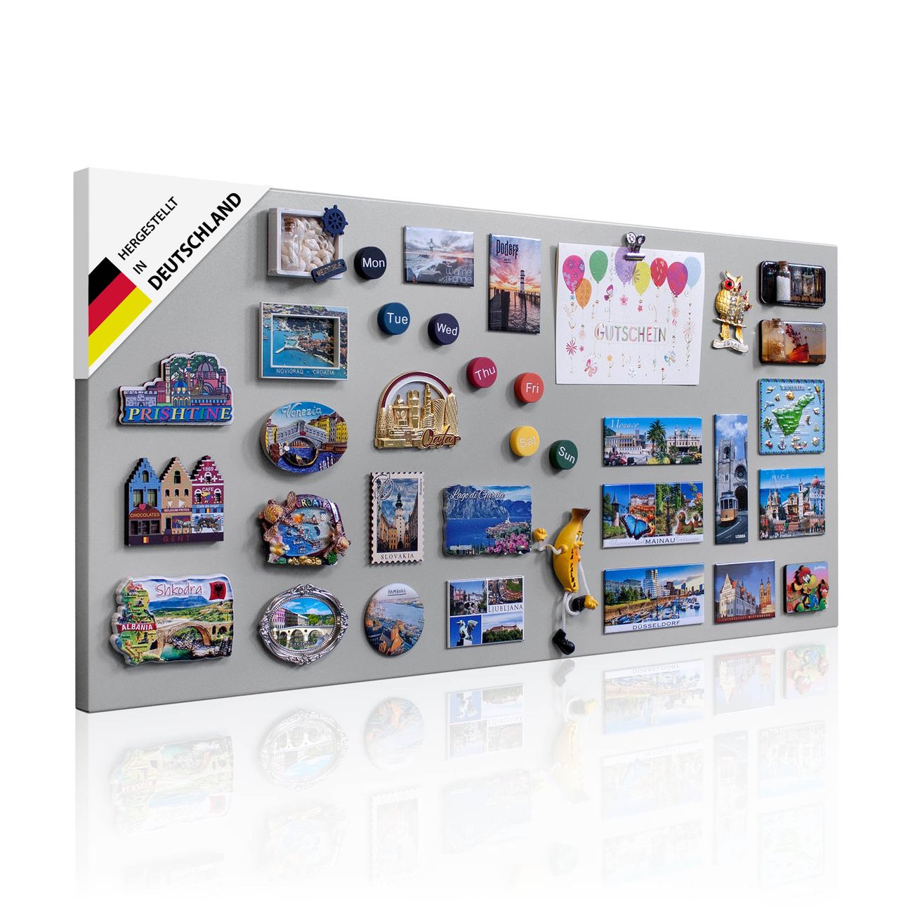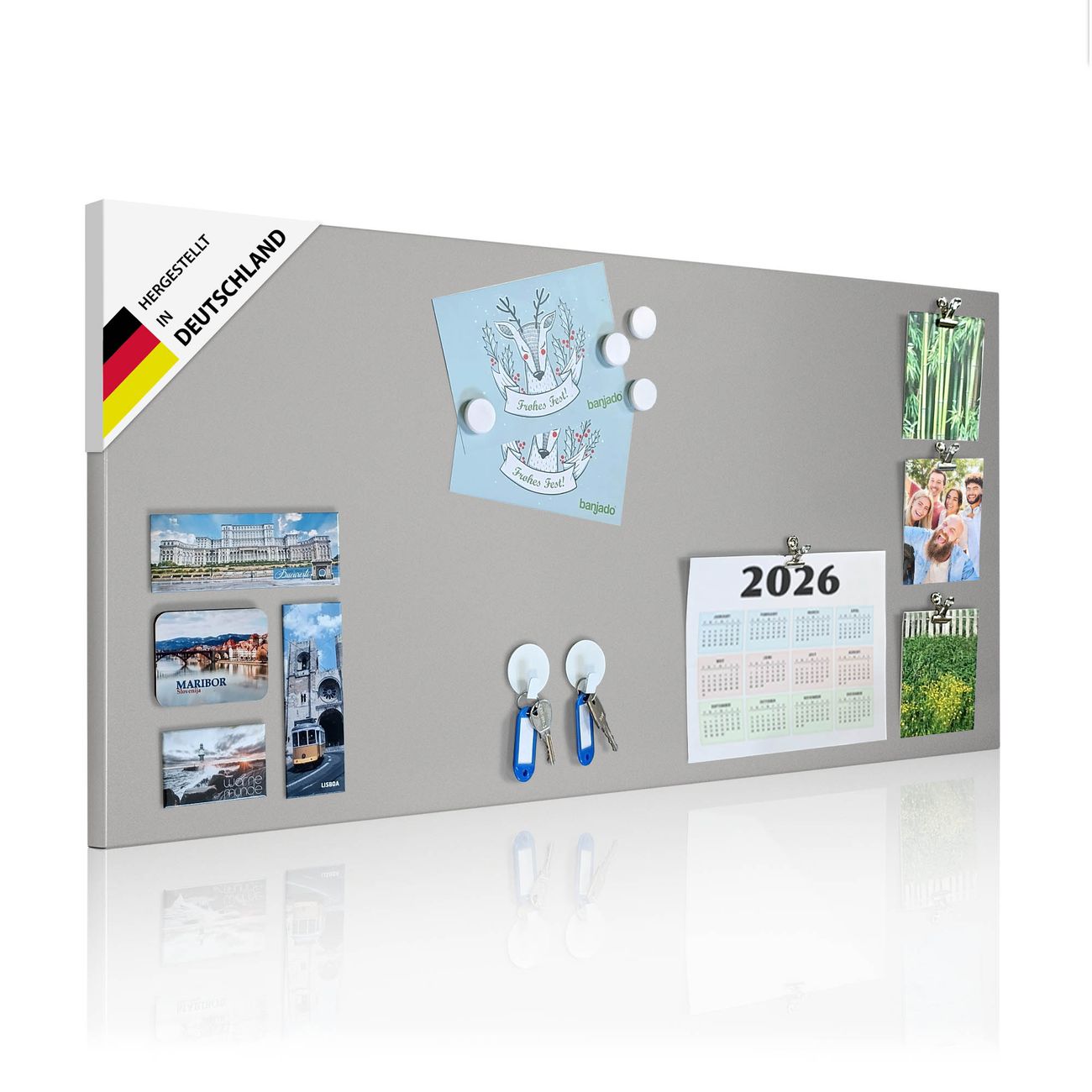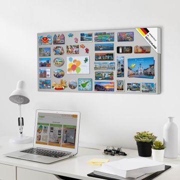 FUNKTION: Die banjado Magnettafel mit Motiv bringt Ordnung in Ihr Zettelchaos. Fotos, Termine, Notizen oder Rezepte lassen Sich hier stilvoll mit Magneten ordnen, Sie behalten alles im Blick. An der Design Magnettafel halten alle handesüblichen Magnete. DESIGN: Die magnetische Pinnwand mit dem Motiv ist ein eleganter Begleiter im Alltag. Mit dieser Memotafel aus Metall haben Sie auch ohne Notizen und Magnete ein schönes Dekoelement. Das Format bietet Ihnen ausreichend Platz um alle wichtigen Informationen im Blick zu behalten. DETAILS: Die Magnettafel besteht aus silber-grau, weiß oder schwarzlackiertem Stahl. Sie hat eine Größe von 37 x 78 x 2cm. Es befinden sich auf der Rückseite vorgefertigte Aufhängungen die eine schnelle und unkomplizierte Anbringung ermöglichen. Das Motiv ist mit einem seidenmatten Laminat versehen und schützt so zusätzlich vor Kratzern. NUTZEN: Sie können dieses Memoboard groß als Wandbild nutzen, es halten alle handelsüblichen Magneten daran. Die Pinnwand ist mit einem feuchten Lappen oder Schwamm abwischbar. Sie finden bei uns eine große Auswahl an passenden Magneten. BANJADO: Wir sind ein kleines Team aus dem Herzen von Sachsen. Wir fertigen alle Artikel von Hand für Sie an, Sie erhalten keine preiswerte Importware. Auf Wunsch können Sie auch Ihr eigenes Foto auf die Magnettafel aufbringen, schreiben Sie uns an. Herzlichst, Ihr banjado-Team