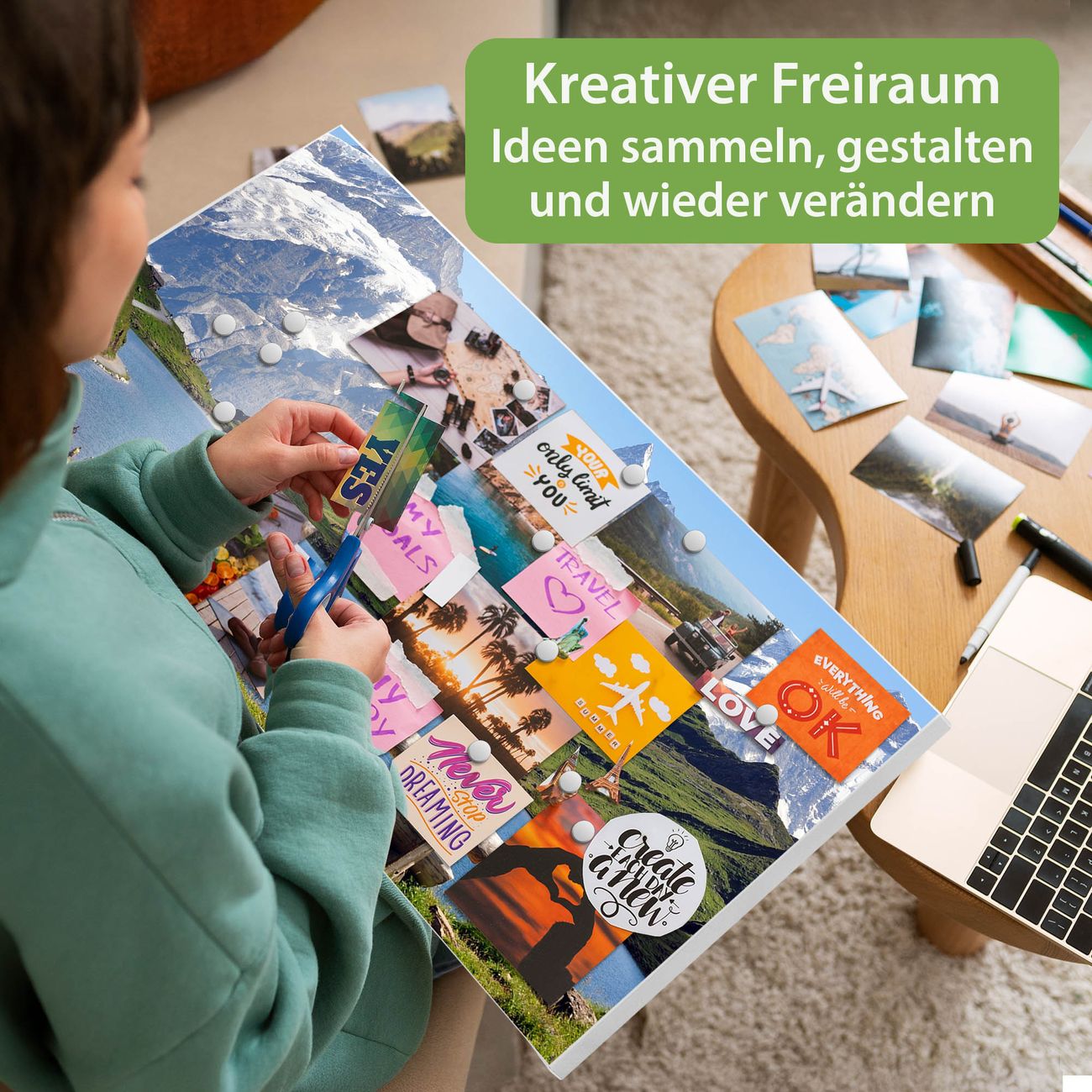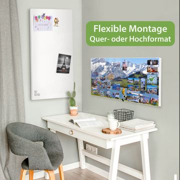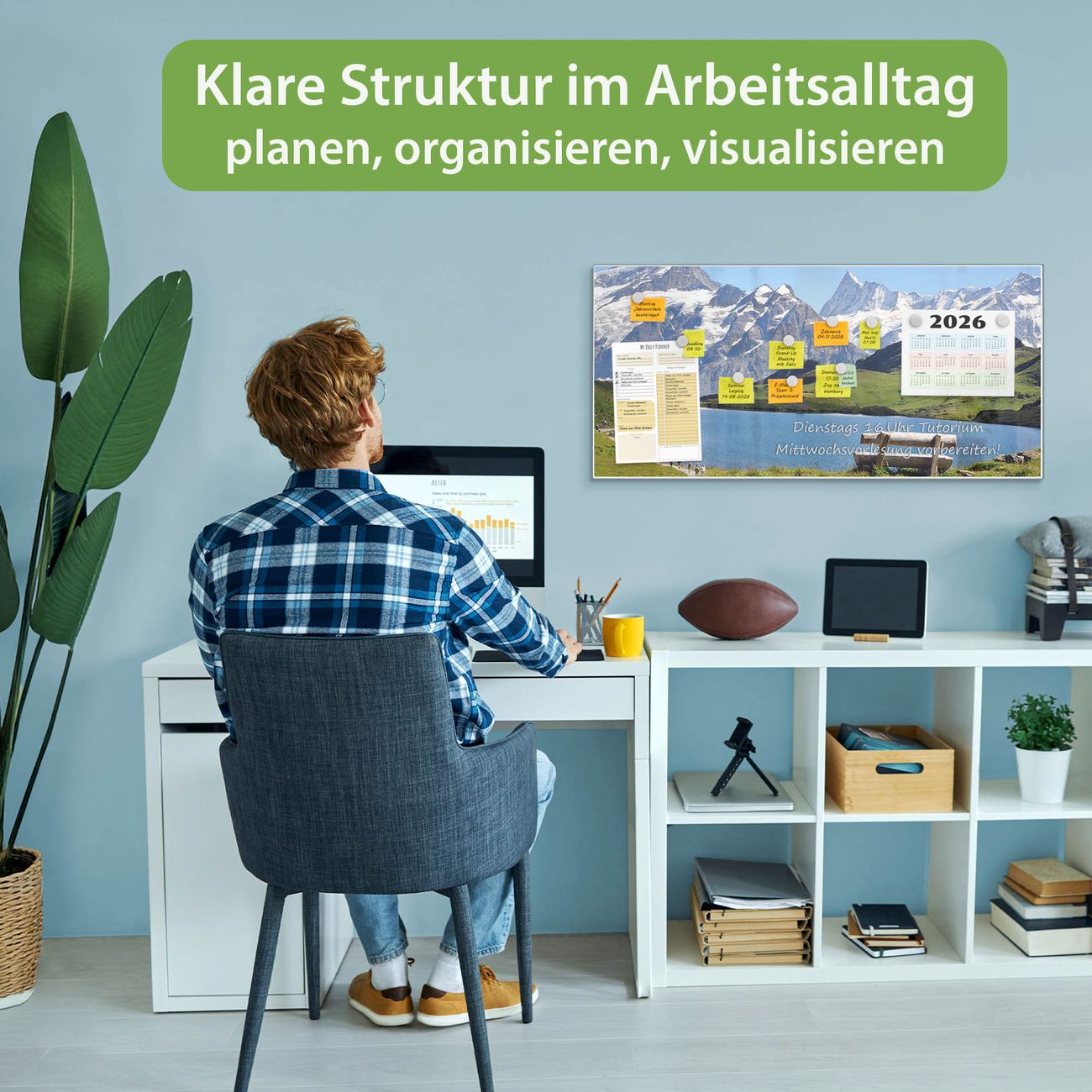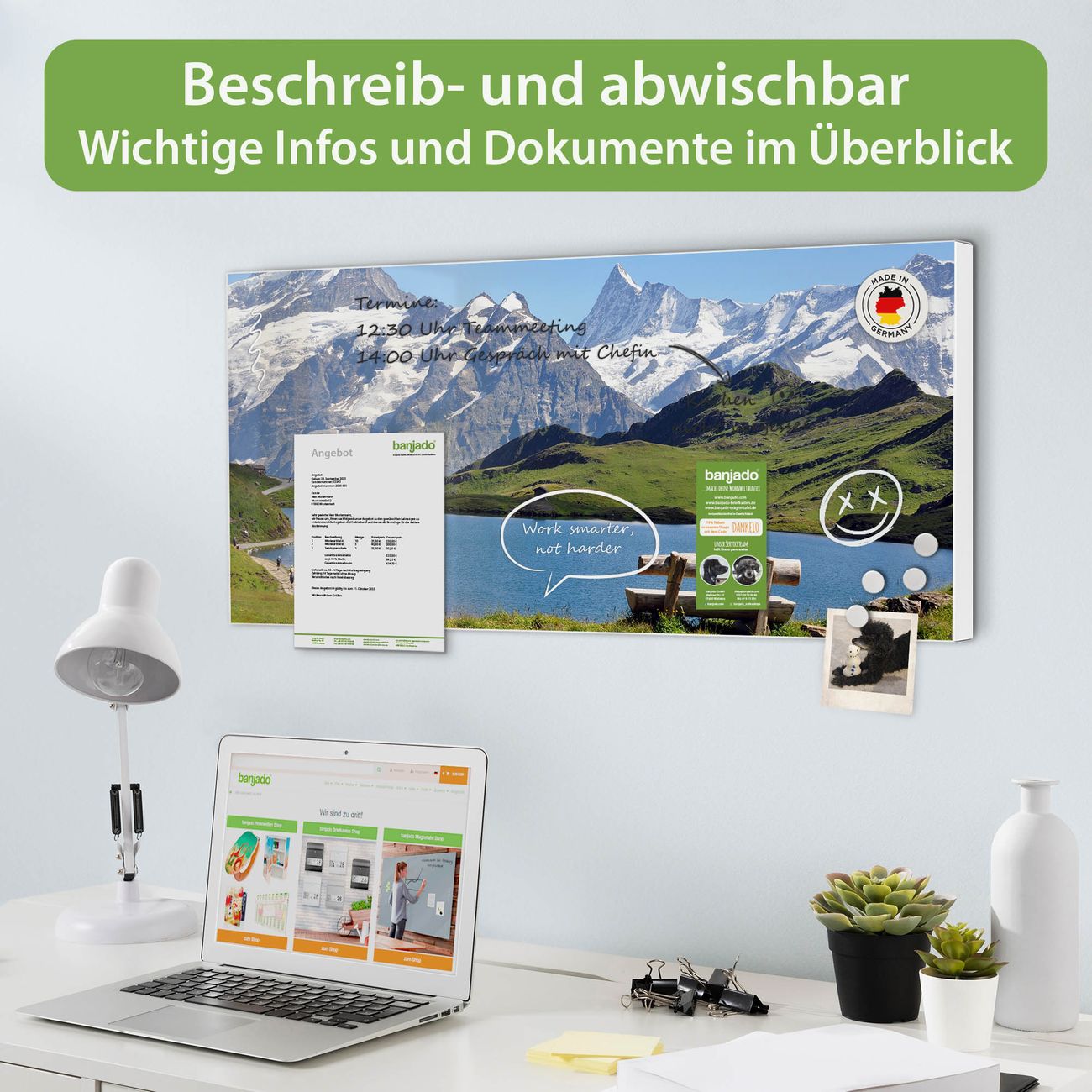 FUNKTION: Die banjado Magnettafel 78x37 cm im Design Motiv Alpen vereint Funktionalität und modernes Wohndesign auf stilvolle Weise. Diese hochwertige Magnetwand aus Metall hilft Ihnen dabei, Notizen, Fotos, Termine, Einkaufslisten oder Rezepte übersichtlich zu organisieren. Als praktisches Memoboard sorgt sie für Struktur im Alltag und setzt gleichzeitig einen dekorativen Akzent an Ihrer Wand. DESIGN: Die Metalltafel besteht aus robustem, lackiertem Stahl und ist mit allen handelsüblichen Magneten nutzbar. Besonders praktisch ist die beschreibbare Oberfläche. Sie können die Magnettafel ganz einfach mit Kreidestiften beschriften und die Inhalte bei Bedarf mit einem feuchten Tuch wieder entfernen. So eignet sich das Memoboard ideal für Wochenpläne, Menüpläne, To Do Listen oder kreative Botschaften. DETAILS: Mit ihrem großzügigen Querformat von 78x37 cm bietet die Magnettafel ausreichend Platz für Ihre Organisation. Das Motiv Motiv Alpen bringt eine warme, natürliche Optik in Küche, Flur, Büro oder Homeoffice und wirkt auch ohne Magnete oder Beschriftung wie ein modernes Wandbild. NUTZEN: Auf der Rückseite befinden sich vorgefertigte Löcher für eine schnelle und unkomplizierte Wandmontage. Jede banjado Magnettafel wird in Deutschland gefertigt und steht für Qualität, Langlebigkeit und liebevolle Verarbeitung. Dieses beschreibbare Memoboard ist die perfekte Kombination aus Metalltafel, Designobjekt und praktischer Magnetwand für Ihren Alltag. BANJADO: Wir sind ein kleines Team aus dem Herzen von Sachsen. Wir fertigen alle Artikel von Hand für Sie an, Sie erhalten keine preiswerte Importware. Auf Wunsch können Sie auch Ihr eigenes Foto auf die Magnettafel aufbringen, schreiben Sie uns an. Herzlichst, Ihr banjado-Team
