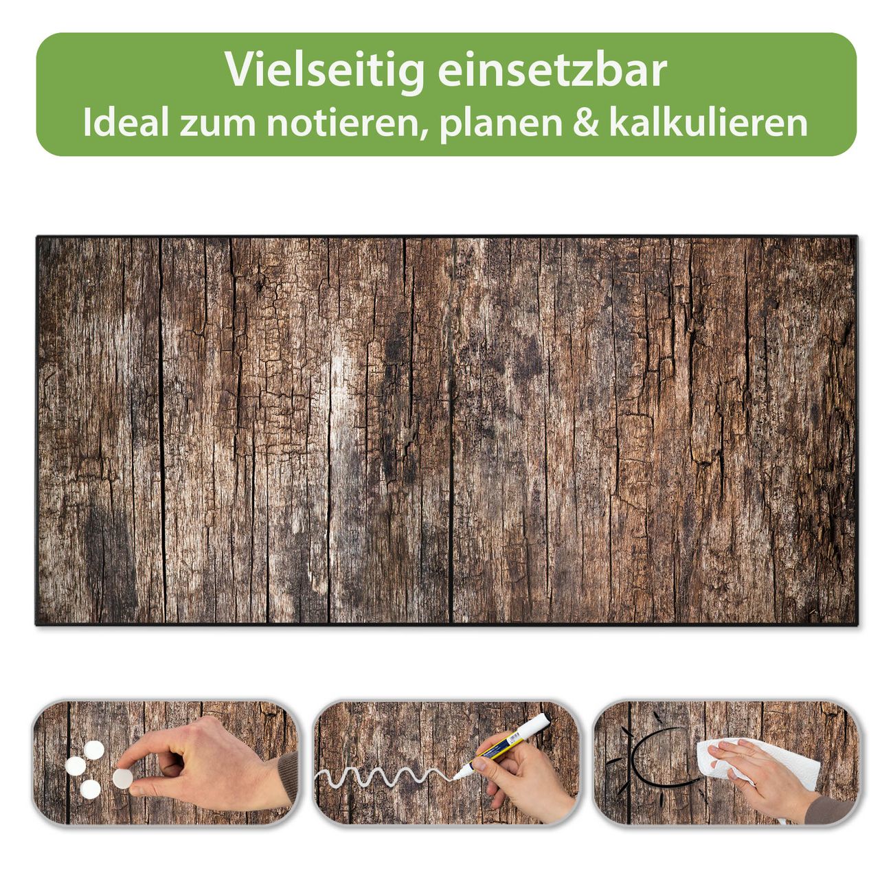 FUNKTION: Die banjado Magnettafel 78x37 cm im Design Motiv Altes Holz vereint Funktionalität und modernes Wohndesign auf stilvolle Weise. Diese hochwertige Magnetwand aus Metall hilft Ihnen dabei, Notizen, Fotos, Termine, Einkaufslisten oder Rezepte übersichtlich zu organisieren. Als praktisches Memoboard sorgt sie für Struktur im Alltag und setzt gleichzeitig einen dekorativen Akzent an Ihrer Wand. DESIGN: Die Metalltafel besteht aus robustem, lackiertem Stahl und ist mit allen handelsüblichen Magneten nutzbar. Besonders praktisch ist die beschreibbare Oberfläche. Sie können die Magnettafel ganz einfach mit Kreidestiften beschriften und die Inhalte bei Bedarf mit einem feuchten Tuch wieder entfernen. So eignet sich das Memoboard ideal für Wochenpläne, Menüpläne, To Do Listen oder kreative Botschaften. DETAILS: Mit ihrem großzügigen Querformat von 78x37 cm bietet die Magnettafel ausreichend Platz für Ihre Organisation. Das Motiv Motiv Altes Holz bringt eine warme, natürliche Optik in Küche, Flur, Büro oder Homeoffice und wirkt auch ohne Magnete oder Beschriftung wie ein modernes Wandbild. NUTZEN: Auf der Rückseite befinden sich vorgefertigte Löcher für eine schnelle und unkomplizierte Wandmontage. Jede banjado Magnettafel wird in Deutschland gefertigt und steht für Qualität, Langlebigkeit und liebevolle Verarbeitung. Dieses beschreibbare Memoboard ist die perfekte Kombination aus Metalltafel, Designobjekt und praktischer Magnetwand für Ihren Alltag. BANJADO: Wir sind ein kleines Team aus dem Herzen von Sachsen. Wir fertigen alle Artikel von Hand für Sie an, Sie erhalten keine preiswerte Importware. Auf Wunsch können Sie auch Ihr eigenes Foto auf die Magnettafel aufbringen, schreiben Sie uns an. Herzlichst, Ihr banjado-Team