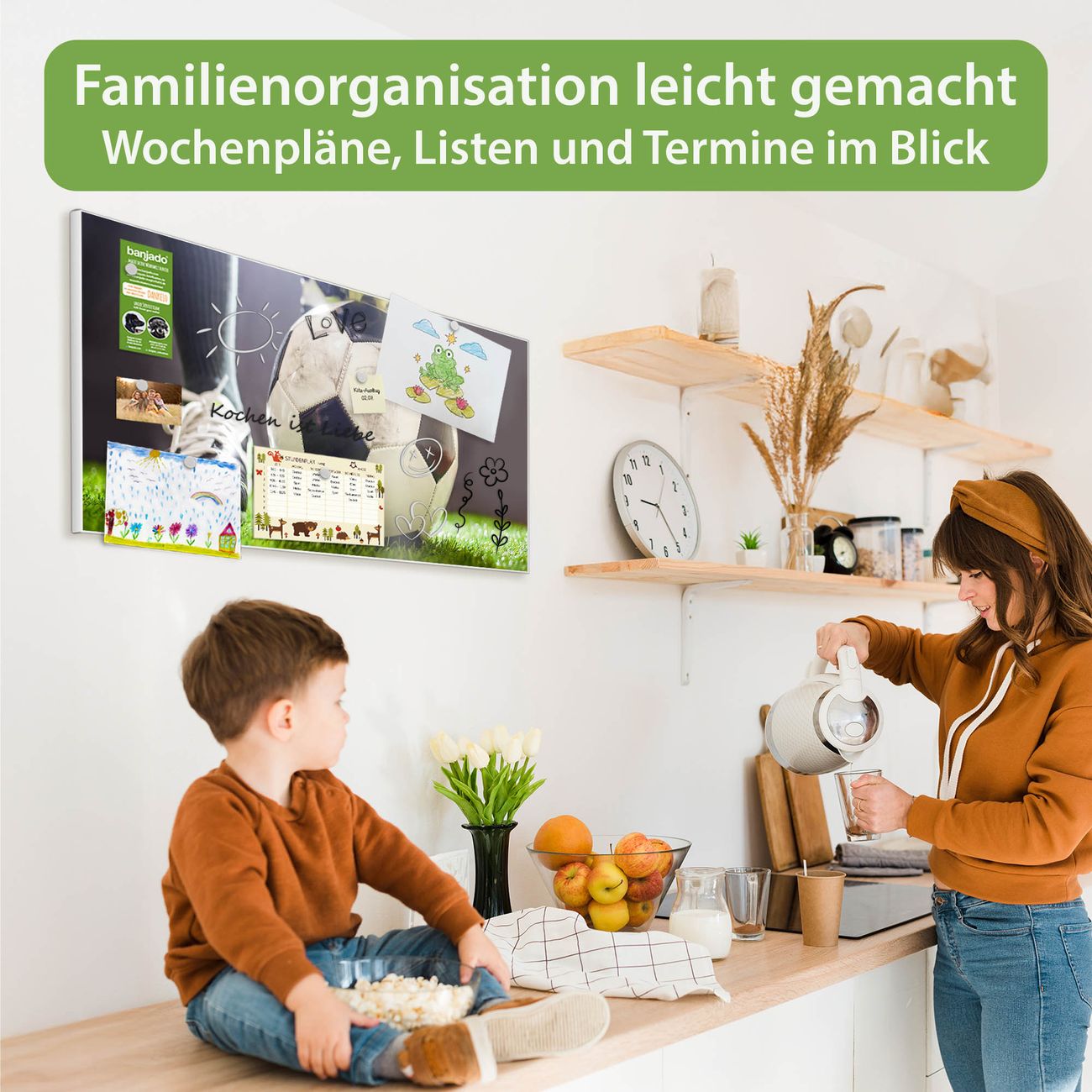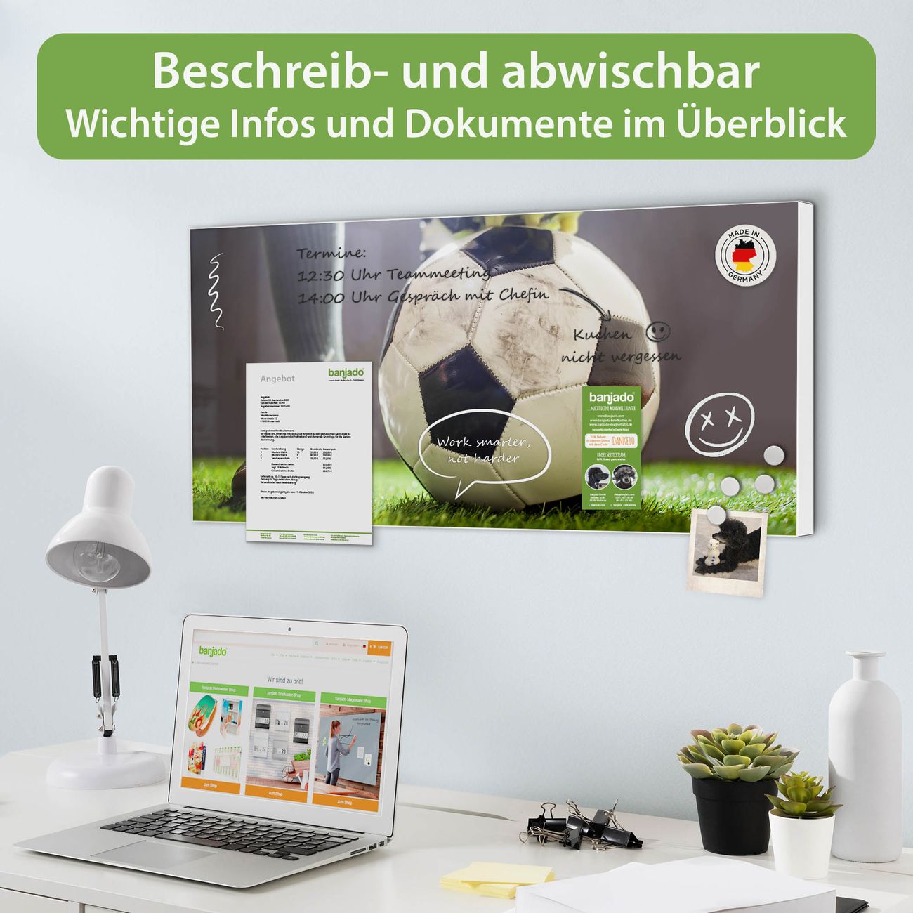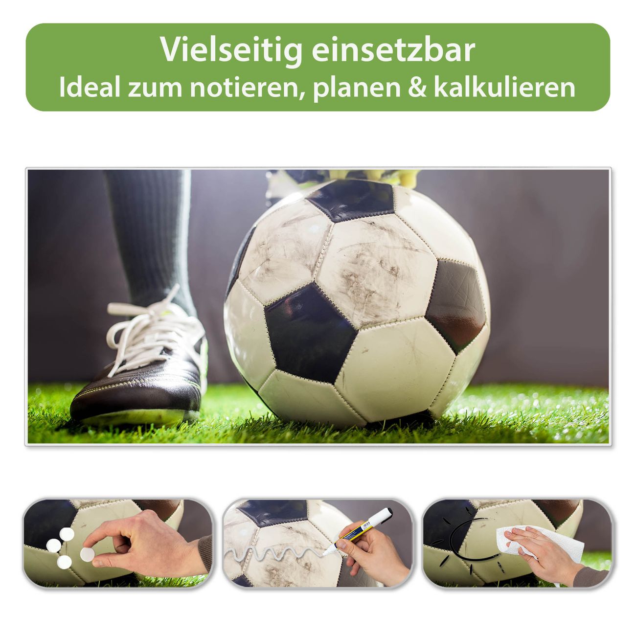 FUNKTION: Die banjado Magnettafel 78x37 cm im Design Motiv Anpfiff vereint Funktionalität und modernes Wohndesign auf stilvolle Weise. Diese hochwertige Magnetwand aus Metall hilft Ihnen dabei, Notizen, Fotos, Termine, Einkaufslisten oder Rezepte übersichtlich zu organisieren. Als praktisches Memoboard sorgt sie für Struktur im Alltag und setzt gleichzeitig einen dekorativen Akzent an Ihrer Wand. DESIGN: Die Metalltafel besteht aus robustem, lackiertem Stahl und ist mit allen handelsüblichen Magneten nutzbar. Besonders praktisch ist die beschreibbare Oberfläche. Sie können die Magnettafel ganz einfach mit Kreidestiften beschriften und die Inhalte bei Bedarf mit einem feuchten Tuch wieder entfernen. So eignet sich das Memoboard ideal für Wochenpläne, Menüpläne, To Do Listen oder kreative Botschaften. DETAILS: Mit ihrem großzügigen Querformat von 78x37 cm bietet die Magnettafel ausreichend Platz für Ihre Organisation. Das Motiv Motiv Anpfiff bringt eine warme, natürliche Optik in Küche, Flur, Büro oder Homeoffice und wirkt auch ohne Magnete oder Beschriftung wie ein modernes Wandbild. NUTZEN: Auf der Rückseite befinden sich vorgefertigte Löcher für eine schnelle und unkomplizierte Wandmontage. Jede banjado Magnettafel wird in Deutschland gefertigt und steht für Qualität, Langlebigkeit und liebevolle Verarbeitung. Dieses beschreibbare Memoboard ist die perfekte Kombination aus Metalltafel, Designobjekt und praktischer Magnetwand für Ihren Alltag. BANJADO: Wir sind ein kleines Team aus dem Herzen von Sachsen. Wir fertigen alle Artikel von Hand für Sie an, Sie erhalten keine preiswerte Importware. Auf Wunsch können Sie auch Ihr eigenes Foto auf die Magnettafel aufbringen, schreiben Sie uns an. Herzlichst, Ihr banjado-Team