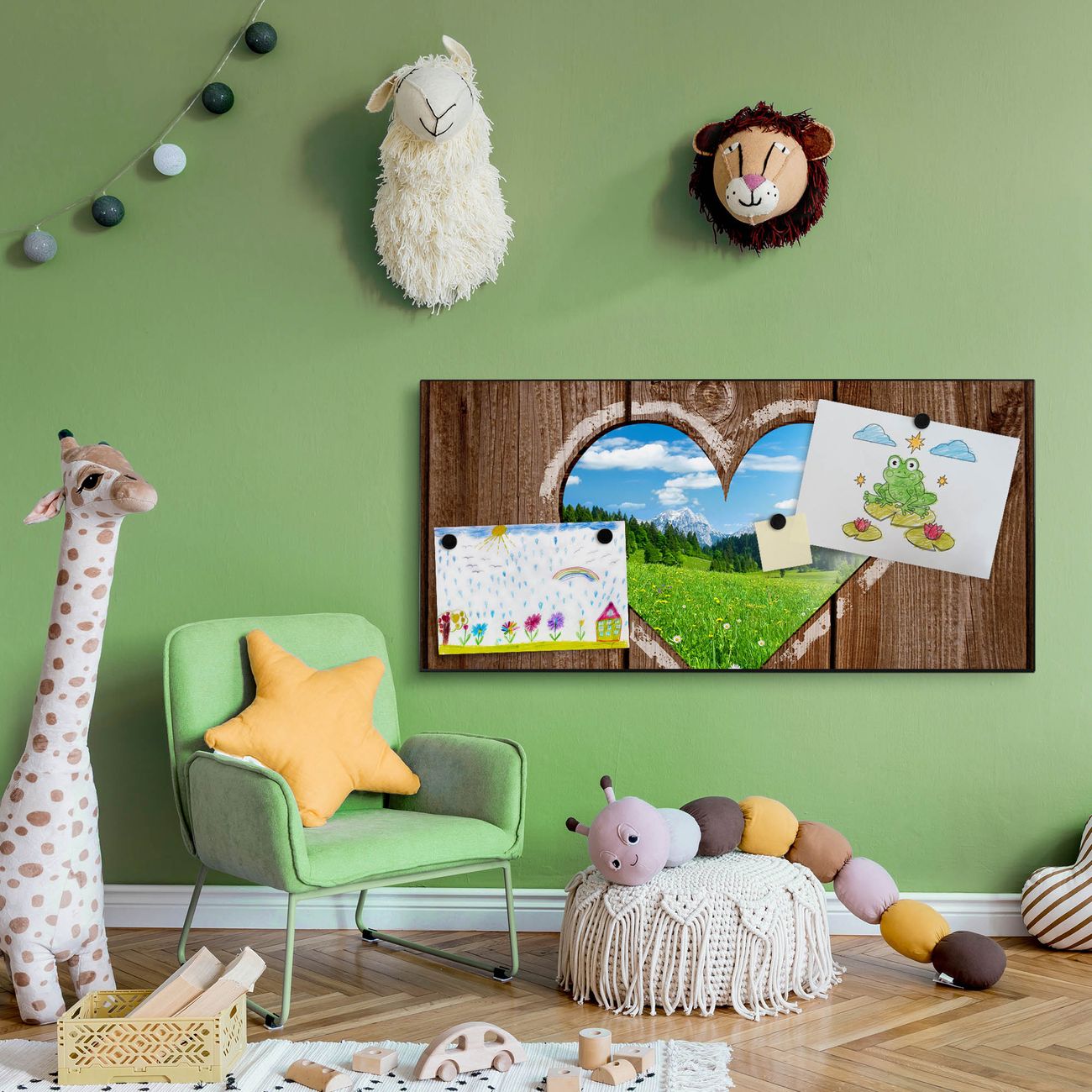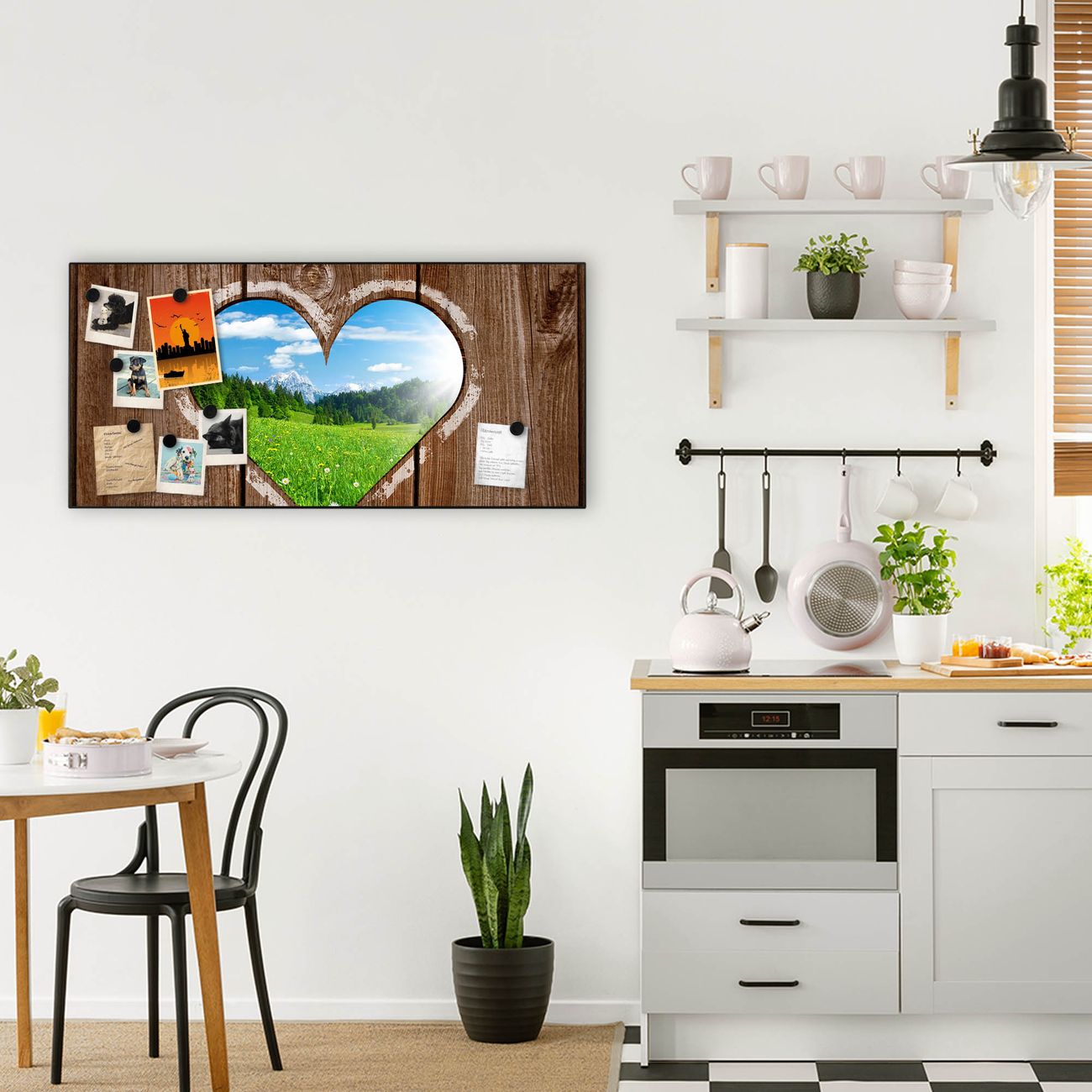 FUNKTION:  Die banjado Magnettafel mit Motiv Ausblick mit Herz Motiv bringt Ordnung in Ihr Zettelchaos. Fotos, Termine, Notizen oder Rezepte lassen Sich hier stilvoll mit Magneten ordnen, Sie behalten alles im Blick. An der Design Magnetwand halten alle handesüblichen Magnete. DESIGN:  Die Metall Pinnwand mit dem Motiv Motiv Ausblick mit Herz ist ein eleganter Begleiter im Alltag. Mit dieser Magnettafel haben Sie auch ohne Notizen und Magnete ein schönes Dekoelement. Das Format bietet Ihnen ausreichend Platz um alle wichtigen Informationen im Blick zu behalten. DETAILS: Die magnetische Pinnwand besteht aus silber-grau, weiß oder schwarz lackiertem Stahl. Sie hat eine Größe von 78cm x 37cm. Es befinden sich auf der Rückseite vorgefertigte Löcher die eine schnelle und unkomplizierte Anbringung ermöglichen. Das Motiv ist mit einem seidenmatten Laminat versehen und schützt so zusätzlich vor Kratzern. NUTZEN:  Sie können diese Magnettafel wunderbar als Wandbild nutzen, es halten alle handelsüblichen Magneten daran. Das Memoboard ist mit einem feuchten Lappen oder Schwamm abwischbar. Sie finden bei uns eine große Auswahl an passenden Magneten. BANJADO:  Wir sind ein kleines Team aus dem Herzen von Sachsen. Wir fertigen alle Artikel von Hand für Sie an, Sie erhalten keine preiswerte Importware. Auf Wunsch können Sie auch Ihr eigenes Foto auf die Magnettafel aufbringen, schreiben Sie uns an. Herzlichst, Ihr banjado-Team