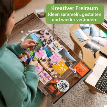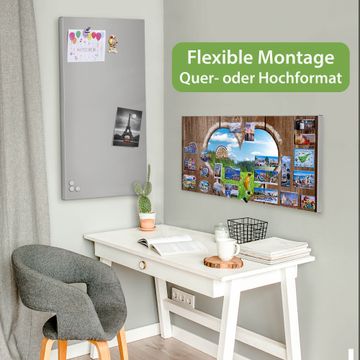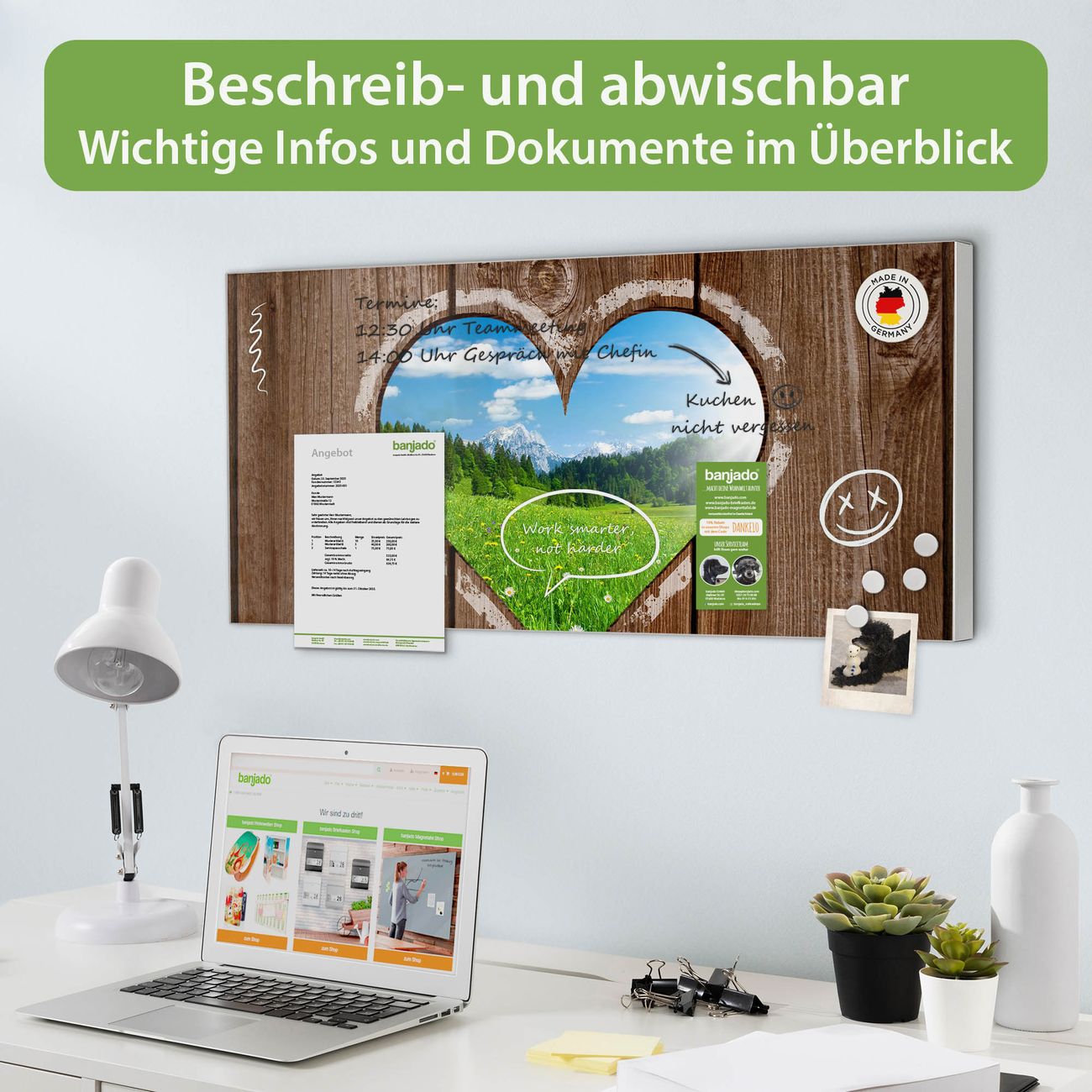 FUNKTION: Die banjado Magnettafel 78x37 cm im Design Motiv Ausblick mit Herz vereint Funktionalität und modernes Wohndesign auf stilvolle Weise. Diese hochwertige Magnetwand aus Metall hilft Ihnen dabei, Notizen, Fotos, Termine, Einkaufslisten oder Rezepte übersichtlich zu organisieren. Als praktisches Memoboard sorgt sie für Struktur im Alltag und setzt gleichzeitig einen dekorativen Akzent an Ihrer Wand. DESIGN: Die Metalltafel besteht aus robustem, lackiertem Stahl und ist mit allen handelsüblichen Magneten nutzbar. Besonders praktisch ist die beschreibbare Oberfläche. Sie können die Magnettafel ganz einfach mit Kreidestiften beschriften und die Inhalte bei Bedarf mit einem feuchten Tuch wieder entfernen. So eignet sich das Memoboard ideal für Wochenpläne, Menüpläne, To Do Listen oder kreative Botschaften. DETAILS: Mit ihrem großzügigen Querformat von 78x37 cm bietet die Magnettafel ausreichend Platz für Ihre Organisation. Das Motiv Motiv Ausblick mit Herz bringt eine warme, natürliche Optik in Küche, Flur, Büro oder Homeoffice und wirkt auch ohne Magnete oder Beschriftung wie ein modernes Wandbild. NUTZEN: Auf der Rückseite befinden sich vorgefertigte Löcher für eine schnelle und unkomplizierte Wandmontage. Jede banjado Magnettafel wird in Deutschland gefertigt und steht für Qualität, Langlebigkeit und liebevolle Verarbeitung. Dieses beschreibbare Memoboard ist die perfekte Kombination aus Metalltafel, Designobjekt und praktischer Magnetwand für Ihren Alltag. BANJADO: Wir sind ein kleines Team aus dem Herzen von Sachsen. Wir fertigen alle Artikel von Hand für Sie an, Sie erhalten keine preiswerte Importware. Auf Wunsch können Sie auch Ihr eigenes Foto auf die Magnettafel aufbringen, schreiben Sie uns an. Herzlichst, Ihr banjado-Team