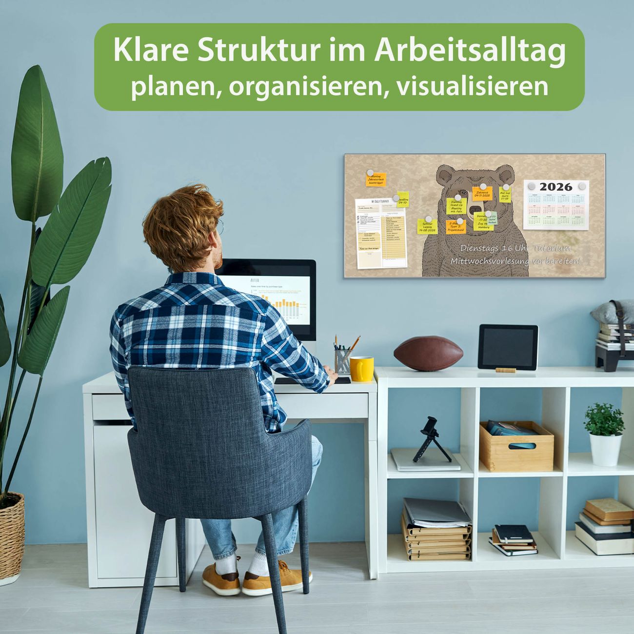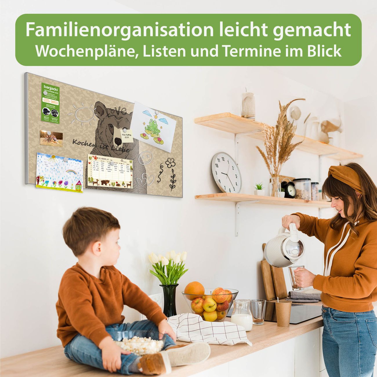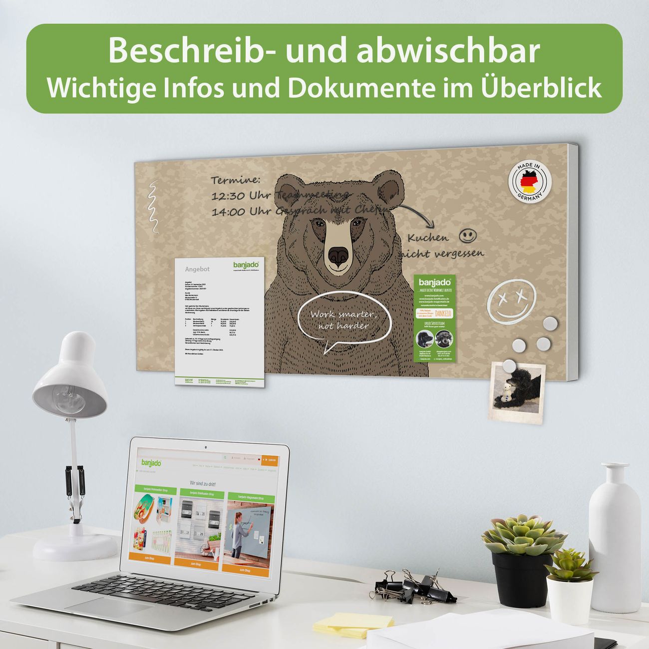 FUNKTION: Die banjado Magnettafel 78x37 cm im Design Motiv Bär Ohne Brille vereint Funktionalität und modernes Wohndesign auf stilvolle Weise. Diese hochwertige Magnetwand aus Metall hilft Ihnen dabei, Notizen, Fotos, Termine, Einkaufslisten oder Rezepte übersichtlich zu organisieren. Als praktisches Memoboard sorgt sie für Struktur im Alltag und setzt gleichzeitig einen dekorativen Akzent an Ihrer Wand. DESIGN: Die Metalltafel besteht aus robustem, lackiertem Stahl und ist mit allen handelsüblichen Magneten nutzbar. Besonders praktisch ist die beschreibbare Oberfläche. Sie können die Magnettafel ganz einfach mit Kreidestiften beschriften und die Inhalte bei Bedarf mit einem feuchten Tuch wieder entfernen. So eignet sich das Memoboard ideal für Wochenpläne, Menüpläne, To Do Listen oder kreative Botschaften. DETAILS: Mit ihrem großzügigen Querformat von 78x37 cm bietet die Magnettafel ausreichend Platz für Ihre Organisation. Das Motiv Motiv Bär Ohne Brille bringt eine warme, natürliche Optik in Küche, Flur, Büro oder Homeoffice und wirkt auch ohne Magnete oder Beschriftung wie ein modernes Wandbild. NUTZEN: Auf der Rückseite befinden sich vorgefertigte Löcher für eine schnelle und unkomplizierte Wandmontage. Jede banjado Magnettafel wird in Deutschland gefertigt und steht für Qualität, Langlebigkeit und liebevolle Verarbeitung. Dieses beschreibbare Memoboard ist die perfekte Kombination aus Metalltafel, Designobjekt und praktischer Magnetwand für Ihren Alltag. BANJADO: Wir sind ein kleines Team aus dem Herzen von Sachsen. Wir fertigen alle Artikel von Hand für Sie an, Sie erhalten keine preiswerte Importware. Auf Wunsch können Sie auch Ihr eigenes Foto auf die Magnettafel aufbringen, schreiben Sie uns an. Herzlichst, Ihr banjado-Team