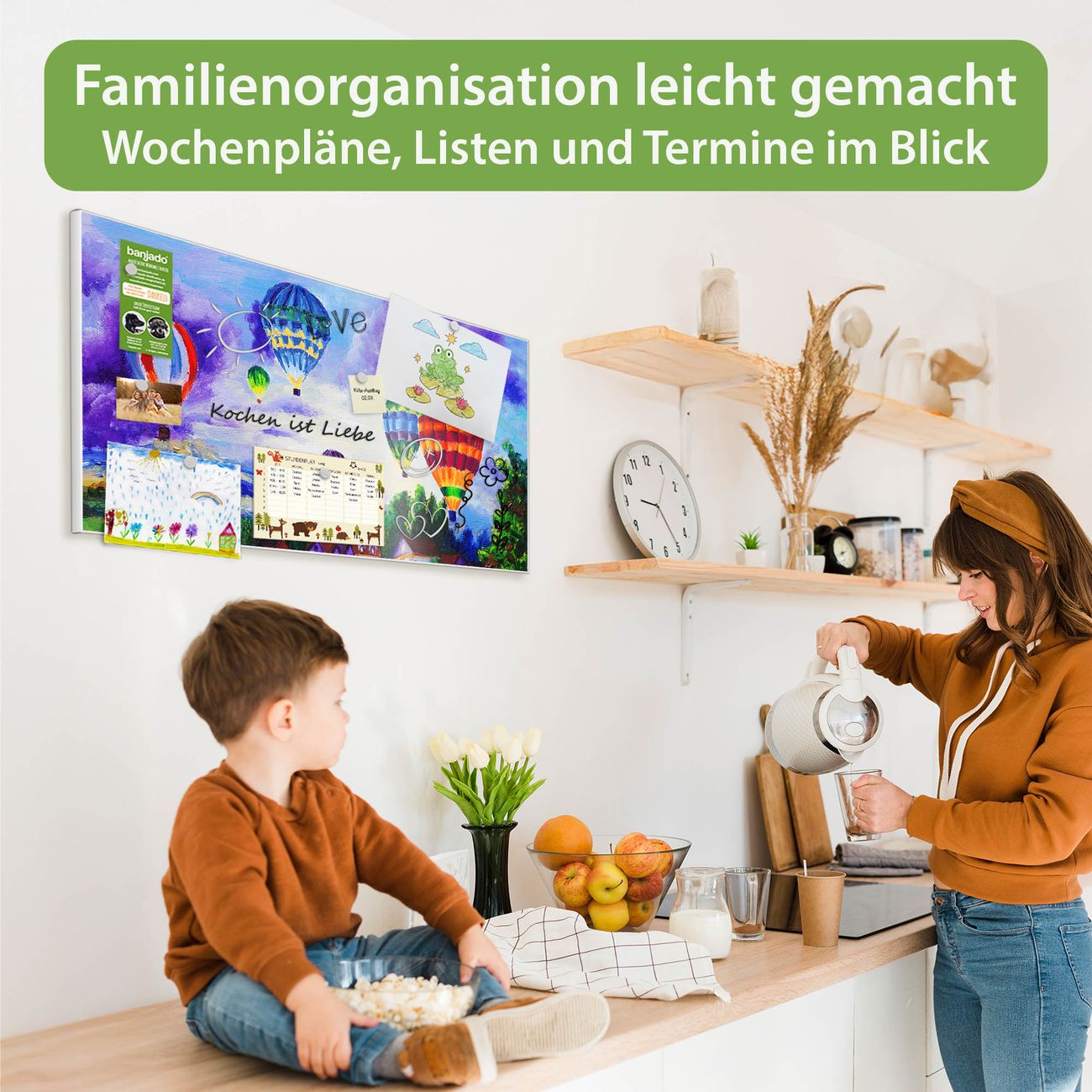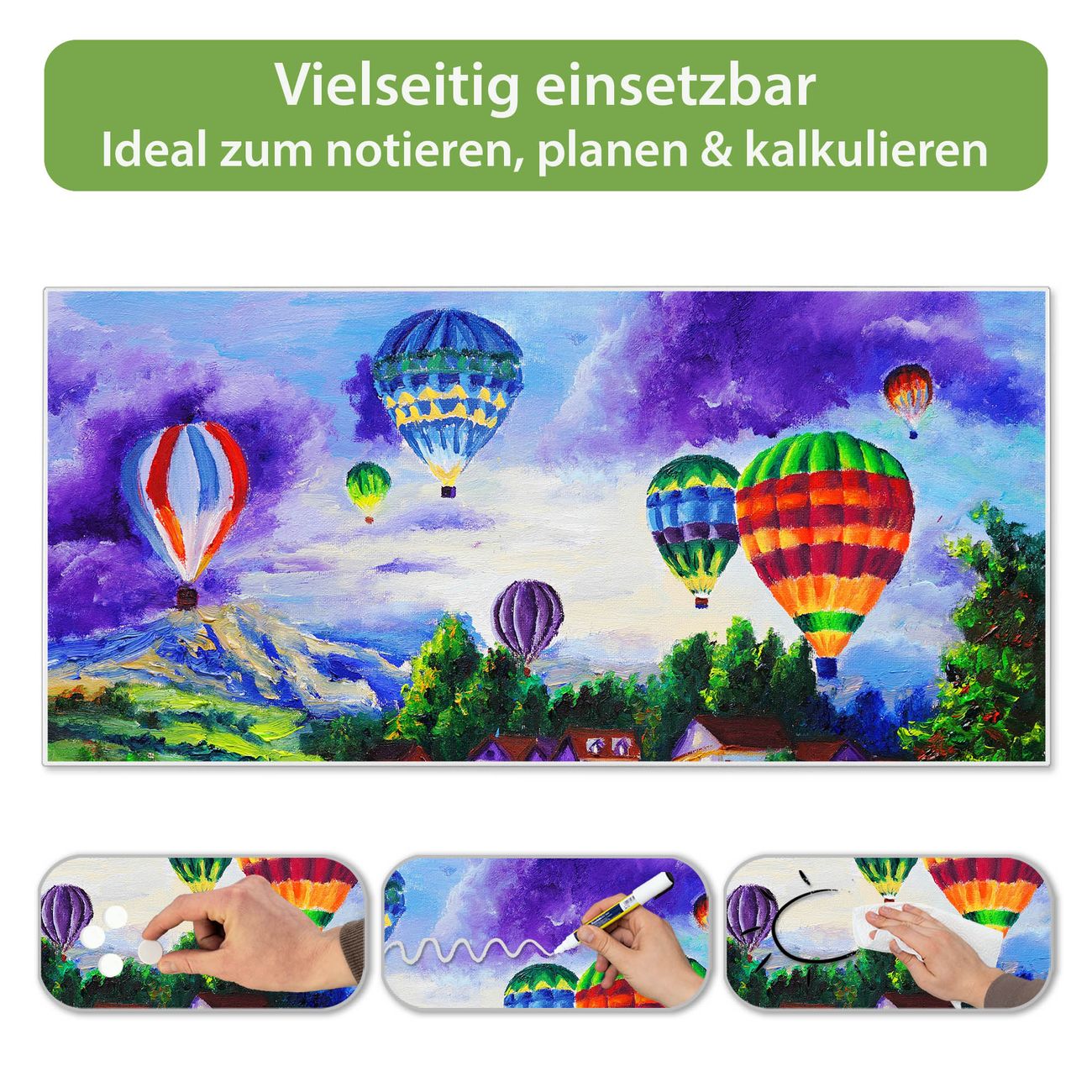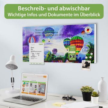 FUNKTION: Die banjado Magnettafel 78x37 cm im Design Motiv Ballons In Lila Wolken vereint Funktionalität und modernes Wohndesign auf stilvolle Weise. Diese hochwertige Magnetwand aus Metall hilft Ihnen dabei, Notizen, Fotos, Termine, Einkaufslisten oder Rezepte übersichtlich zu organisieren. Als praktisches Memoboard sorgt sie für Struktur im Alltag und setzt gleichzeitig einen dekorativen Akzent an Ihrer Wand. DESIGN: Die Metalltafel besteht aus robustem, lackiertem Stahl und ist mit allen handelsüblichen Magneten nutzbar. Besonders praktisch ist die beschreibbare Oberfläche. Sie können die Magnettafel ganz einfach mit Kreidestiften beschriften und die Inhalte bei Bedarf mit einem feuchten Tuch wieder entfernen. So eignet sich das Memoboard ideal für Wochenpläne, Menüpläne, To Do Listen oder kreative Botschaften. DETAILS: Mit ihrem großzügigen Querformat von 78x37 cm bietet die Magnettafel ausreichend Platz für Ihre Organisation. Das Motiv Motiv Ballons In Lila Wolken bringt eine warme, natürliche Optik in Küche, Flur, Büro oder Homeoffice und wirkt auch ohne Magnete oder Beschriftung wie ein modernes Wandbild. NUTZEN: Auf der Rückseite befinden sich vorgefertigte Löcher für eine schnelle und unkomplizierte Wandmontage. Jede banjado Magnettafel wird in Deutschland gefertigt und steht für Qualität, Langlebigkeit und liebevolle Verarbeitung. Dieses beschreibbare Memoboard ist die perfekte Kombination aus Metalltafel, Designobjekt und praktischer Magnetwand für Ihren Alltag. BANJADO: Wir sind ein kleines Team aus dem Herzen von Sachsen. Wir fertigen alle Artikel von Hand für Sie an, Sie erhalten keine preiswerte Importware. Auf Wunsch können Sie auch Ihr eigenes Foto auf die Magnettafel aufbringen, schreiben Sie uns an. Herzlichst, Ihr banjado-Team
