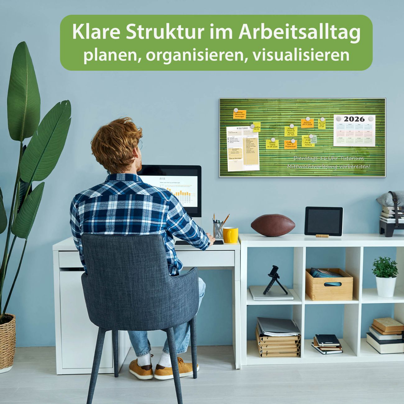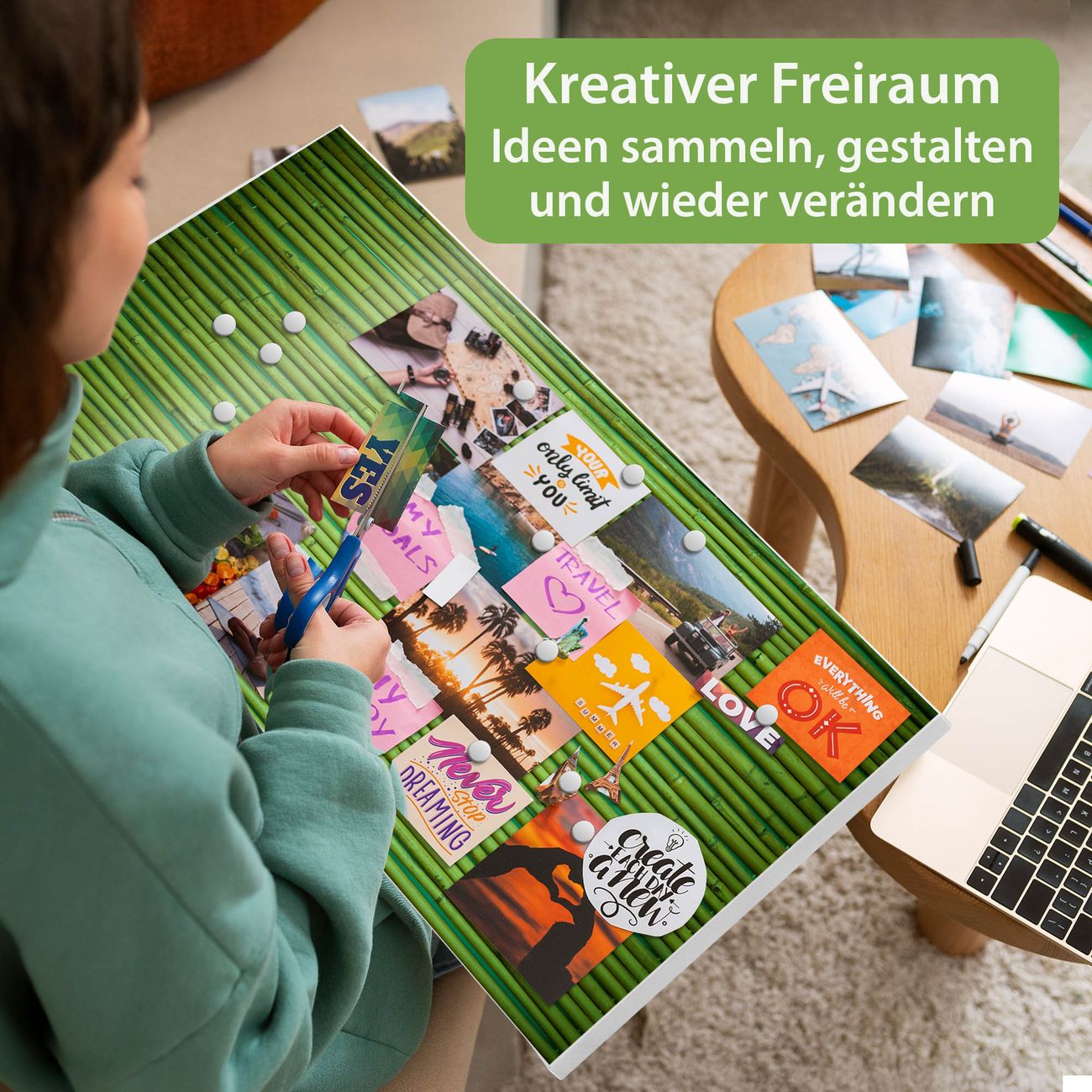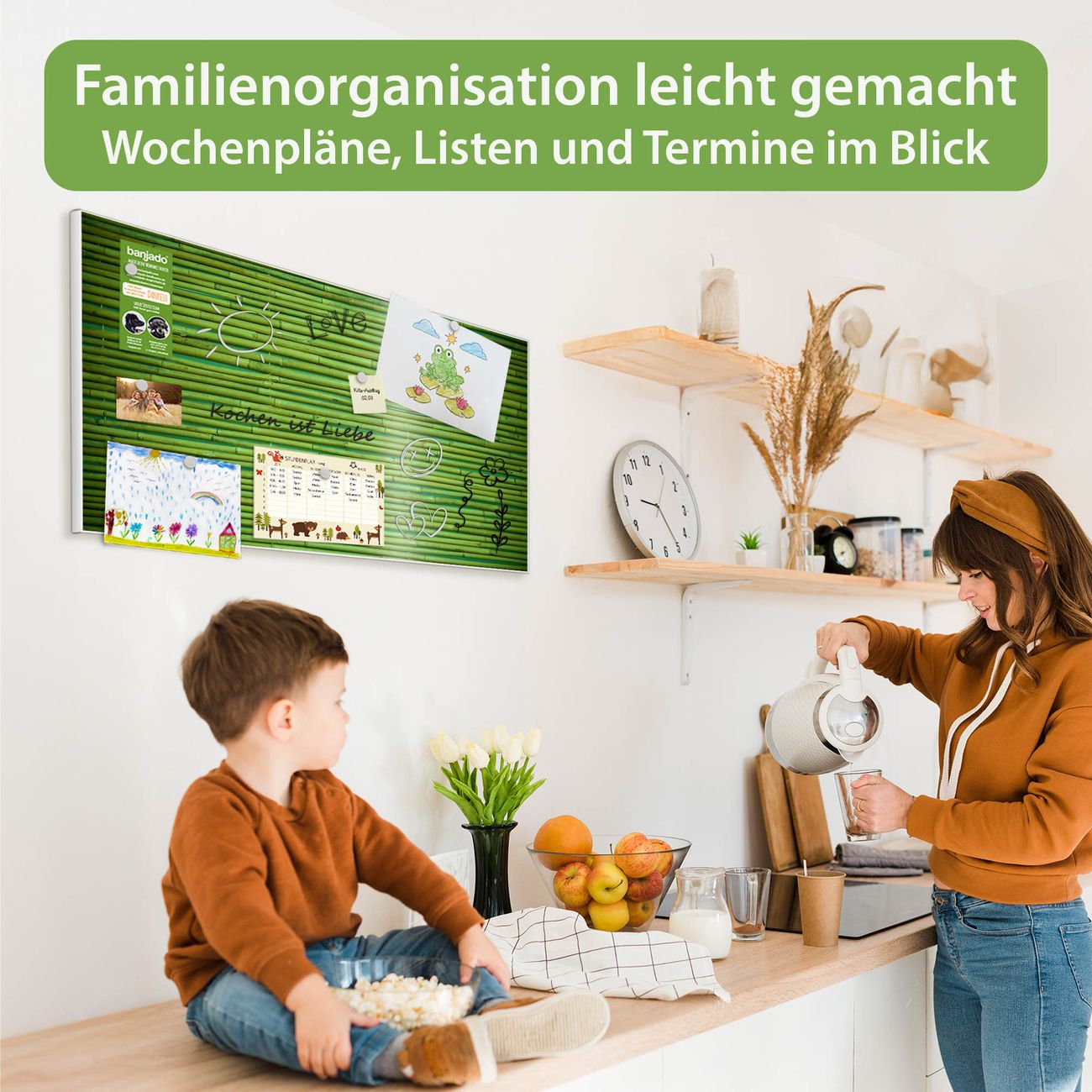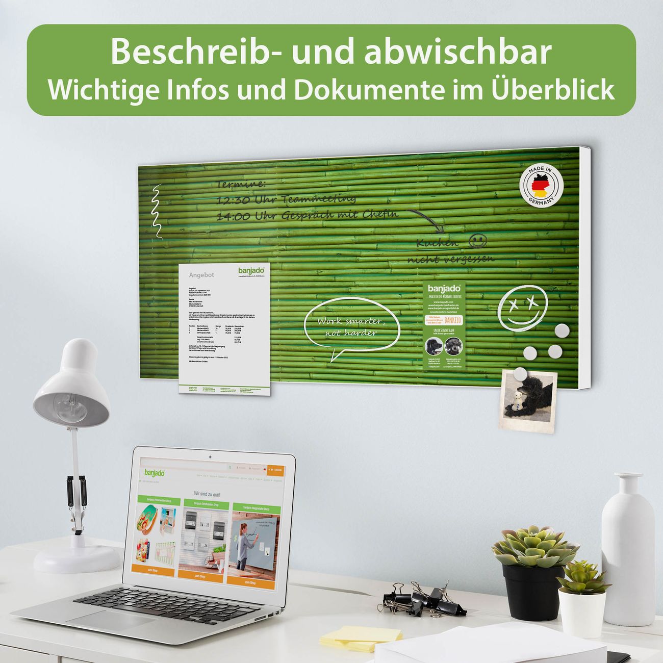 FUNKTION: Die banjado Magnettafel 78x37 cm im Design Motiv Bambus Grün vereint Funktionalität und modernes Wohndesign auf stilvolle Weise. Diese hochwertige Magnetwand aus Metall hilft Ihnen dabei, Notizen, Fotos, Termine, Einkaufslisten oder Rezepte übersichtlich zu organisieren. Als praktisches Memoboard sorgt sie für Struktur im Alltag und setzt gleichzeitig einen dekorativen Akzent an Ihrer Wand. DESIGN: Die Metalltafel besteht aus robustem, lackiertem Stahl und ist mit allen handelsüblichen Magneten nutzbar. Besonders praktisch ist die beschreibbare Oberfläche. Sie können die Magnettafel ganz einfach mit Kreidestiften beschriften und die Inhalte bei Bedarf mit einem feuchten Tuch wieder entfernen. So eignet sich das Memoboard ideal für Wochenpläne, Menüpläne, To Do Listen oder kreative Botschaften. DETAILS: Mit ihrem großzügigen Querformat von 78x37 cm bietet die Magnettafel ausreichend Platz für Ihre Organisation. Das Motiv Motiv Bambus Grün bringt eine warme, natürliche Optik in Küche, Flur, Büro oder Homeoffice und wirkt auch ohne Magnete oder Beschriftung wie ein modernes Wandbild. NUTZEN: Auf der Rückseite befinden sich vorgefertigte Löcher für eine schnelle und unkomplizierte Wandmontage. Jede banjado Magnettafel wird in Deutschland gefertigt und steht für Qualität, Langlebigkeit und liebevolle Verarbeitung. Dieses beschreibbare Memoboard ist die perfekte Kombination aus Metalltafel, Designobjekt und praktischer Magnetwand für Ihren Alltag. BANJADO: Wir sind ein kleines Team aus dem Herzen von Sachsen. Wir fertigen alle Artikel von Hand für Sie an, Sie erhalten keine preiswerte Importware. Auf Wunsch können Sie auch Ihr eigenes Foto auf die Magnettafel aufbringen, schreiben Sie uns an. Herzlichst, Ihr banjado-Team