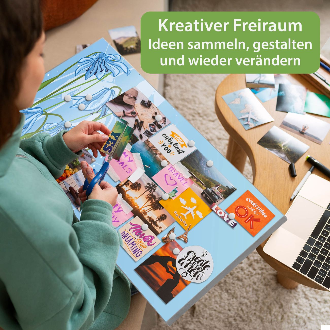 FUNKTION: Die banjado Magnettafel 78x37 cm im Design Motiv Bergblaulilie vereint Funktionalität und modernes Wohndesign auf stilvolle Weise. Diese hochwertige Magnetwand aus Metall hilft Ihnen dabei, Notizen, Fotos, Termine, Einkaufslisten oder Rezepte übersichtlich zu organisieren. Als praktisches Memoboard sorgt sie für Struktur im Alltag und setzt gleichzeitig einen dekorativen Akzent an Ihrer Wand. DESIGN: Die Metalltafel besteht aus robustem, lackiertem Stahl und ist mit allen handelsüblichen Magneten nutzbar. Besonders praktisch ist die beschreibbare Oberfläche. Sie können die Magnettafel ganz einfach mit Kreidestiften beschriften und die Inhalte bei Bedarf mit einem feuchten Tuch wieder entfernen. So eignet sich das Memoboard ideal für Wochenpläne, Menüpläne, To Do Listen oder kreative Botschaften. DETAILS: Mit ihrem großzügigen Querformat von 78x37 cm bietet die Magnettafel ausreichend Platz für Ihre Organisation. Das Motiv Motiv Bergblaulilie bringt eine warme, natürliche Optik in Küche, Flur, Büro oder Homeoffice und wirkt auch ohne Magnete oder Beschriftung wie ein modernes Wandbild. NUTZEN: Auf der Rückseite befinden sich vorgefertigte Löcher für eine schnelle und unkomplizierte Wandmontage. Jede banjado Magnettafel wird in Deutschland gefertigt und steht für Qualität, Langlebigkeit und liebevolle Verarbeitung. Dieses beschreibbare Memoboard ist die perfekte Kombination aus Metalltafel, Designobjekt und praktischer Magnetwand für Ihren Alltag. BANJADO: Wir sind ein kleines Team aus dem Herzen von Sachsen. Wir fertigen alle Artikel von Hand für Sie an, Sie erhalten keine preiswerte Importware. Auf Wunsch können Sie auch Ihr eigenes Foto auf die Magnettafel aufbringen, schreiben Sie uns an. Herzlichst, Ihr banjado-Team