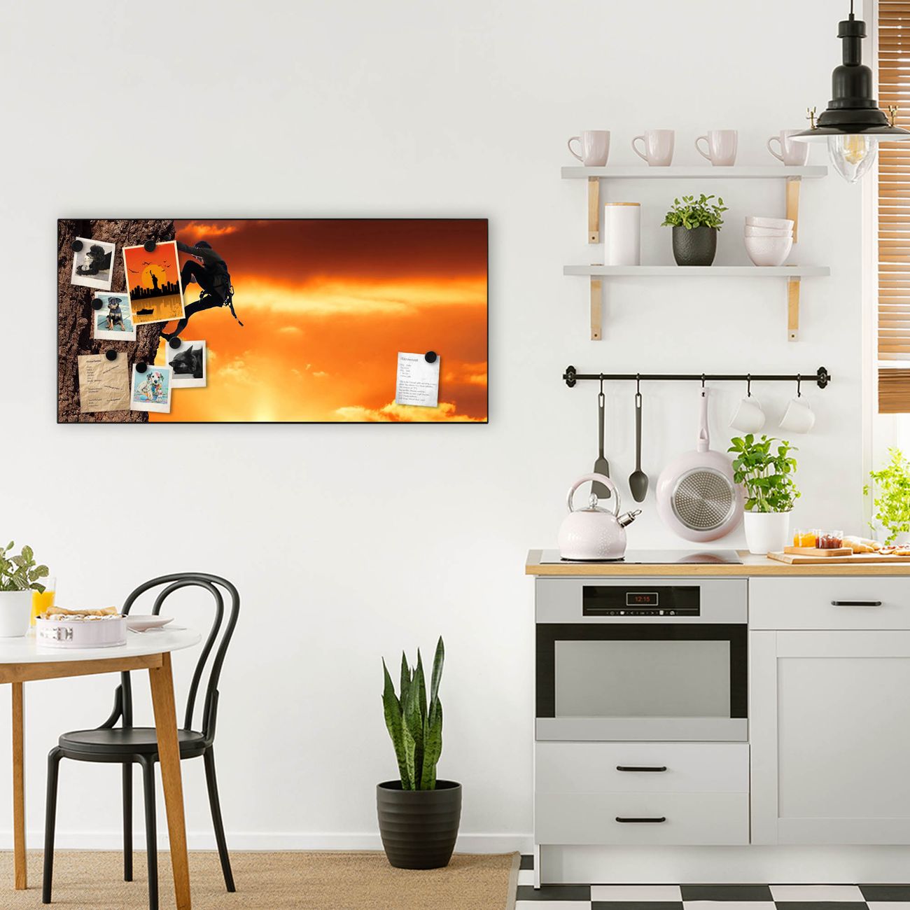 FUNKTION:  Die banjado Magnettafel mit Motiv Bergsteiger Motiv bringt Ordnung in Ihr Zettelchaos. Fotos, Termine, Notizen oder Rezepte lassen Sich hier stilvoll mit Magneten ordnen, Sie behalten alles im Blick. An der Design Magnetwand halten alle handesüblichen Magnete. DESIGN:  Die Metall Pinnwand mit dem Motiv Motiv Bergsteiger ist ein eleganter Begleiter im Alltag. Mit dieser Magnettafel haben Sie auch ohne Notizen und Magnete ein schönes Dekoelement. Das Format bietet Ihnen ausreichend Platz um alle wichtigen Informationen im Blick zu behalten. DETAILS: Die magnetische Pinnwand besteht aus silber-grau, weiß oder schwarz lackiertem Stahl. Sie hat eine Größe von 78cm x 37cm. Es befinden sich auf der Rückseite vorgefertigte Löcher die eine schnelle und unkomplizierte Anbringung ermöglichen. Das Motiv ist mit einem seidenmatten Laminat versehen und schützt so zusätzlich vor Kratzern. NUTZEN:  Sie können diese Magnettafel wunderbar als Wandbild nutzen, es halten alle handelsüblichen Magneten daran. Das Memoboard ist mit einem feuchten Lappen oder Schwamm abwischbar. Sie finden bei uns eine große Auswahl an passenden Magneten. BANJADO:  Wir sind ein kleines Team aus dem Herzen von Sachsen. Wir fertigen alle Artikel von Hand für Sie an, Sie erhalten keine preiswerte Importware. Auf Wunsch können Sie auch Ihr eigenes Foto auf die Magnettafel aufbringen, schreiben Sie uns an. Herzlichst, Ihr banjado-Team