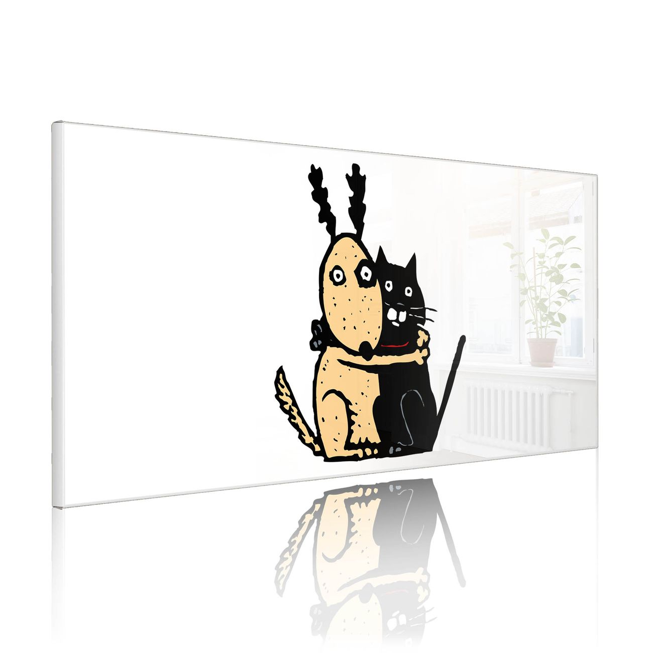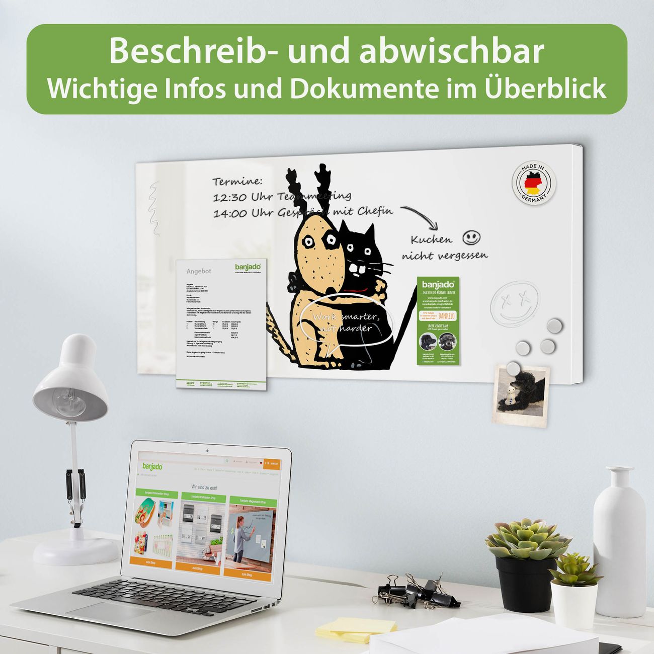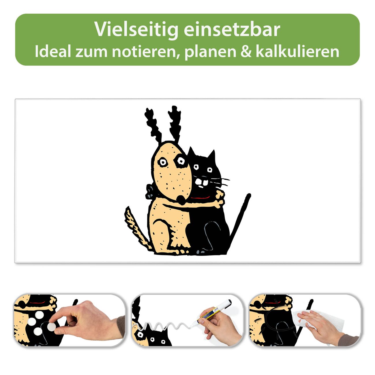 FUNKTION: Die banjado Magnettafel 78x37 cm im Design Motiv Beste Freunde Immer vereint Funktionalität und modernes Wohndesign auf stilvolle Weise. Diese hochwertige Magnetwand aus Metall hilft Ihnen dabei, Notizen, Fotos, Termine, Einkaufslisten oder Rezepte übersichtlich zu organisieren. Als praktisches Memoboard sorgt sie für Struktur im Alltag und setzt gleichzeitig einen dekorativen Akzent an Ihrer Wand. DESIGN: Die Metalltafel besteht aus robustem, lackiertem Stahl und ist mit allen handelsüblichen Magneten nutzbar. Besonders praktisch ist die beschreibbare Oberfläche. Sie können die Magnettafel ganz einfach mit Kreidestiften beschriften und die Inhalte bei Bedarf mit einem feuchten Tuch wieder entfernen. So eignet sich das Memoboard ideal für Wochenpläne, Menüpläne, To Do Listen oder kreative Botschaften. DETAILS: Mit ihrem großzügigen Querformat von 78x37 cm bietet die Magnettafel ausreichend Platz für Ihre Organisation. Das Motiv Motiv Beste Freunde Immer bringt eine warme, natürliche Optik in Küche, Flur, Büro oder Homeoffice und wirkt auch ohne Magnete oder Beschriftung wie ein modernes Wandbild. NUTZEN: Auf der Rückseite befinden sich vorgefertigte Löcher für eine schnelle und unkomplizierte Wandmontage. Jede banjado Magnettafel wird in Deutschland gefertigt und steht für Qualität, Langlebigkeit und liebevolle Verarbeitung. Dieses beschreibbare Memoboard ist die perfekte Kombination aus Metalltafel, Designobjekt und praktischer Magnetwand für Ihren Alltag. BANJADO: Wir sind ein kleines Team aus dem Herzen von Sachsen. Wir fertigen alle Artikel von Hand für Sie an, Sie erhalten keine preiswerte Importware. Auf Wunsch können Sie auch Ihr eigenes Foto auf die Magnettafel aufbringen, schreiben Sie uns an. Herzlichst, Ihr banjado-Team