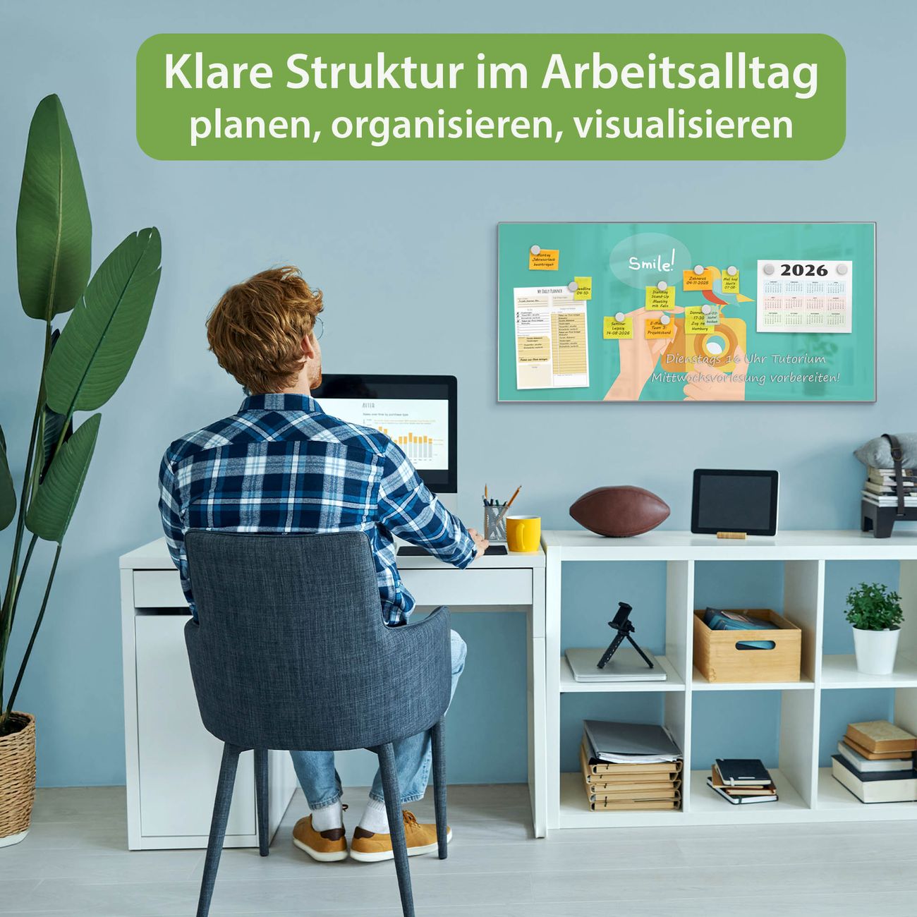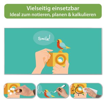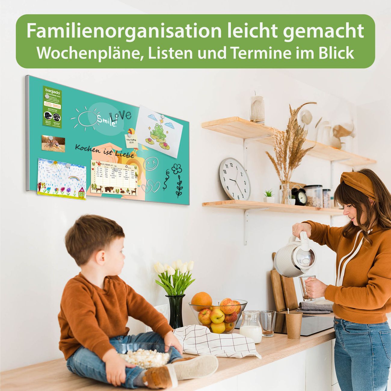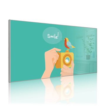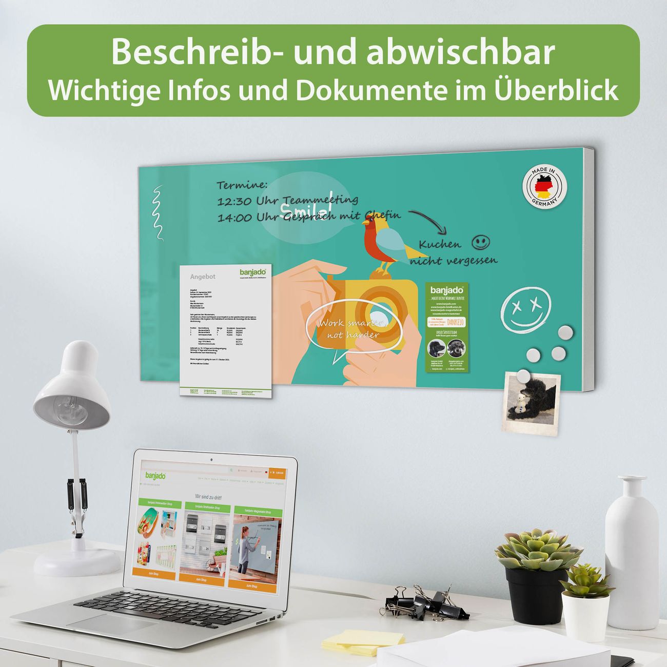 FUNKTION: Die banjado Magnettafel 78x37 cm im Design Motiv Bitte Lächeln 2 vereint Funktionalität und modernes Wohndesign auf stilvolle Weise. Diese hochwertige Magnetwand aus Metall hilft Ihnen dabei, Notizen, Fotos, Termine, Einkaufslisten oder Rezepte übersichtlich zu organisieren. Als praktisches Memoboard sorgt sie für Struktur im Alltag und setzt gleichzeitig einen dekorativen Akzent an Ihrer Wand. DESIGN: Die Metalltafel besteht aus robustem, lackiertem Stahl und ist mit allen handelsüblichen Magneten nutzbar. Besonders praktisch ist die beschreibbare Oberfläche. Sie können die Magnettafel ganz einfach mit Kreidestiften beschriften und die Inhalte bei Bedarf mit einem feuchten Tuch wieder entfernen. So eignet sich das Memoboard ideal für Wochenpläne, Menüpläne, To Do Listen oder kreative Botschaften. DETAILS: Mit ihrem großzügigen Querformat von 78x37 cm bietet die Magnettafel ausreichend Platz für Ihre Organisation. Das Motiv Motiv Bitte Lächeln 2 bringt eine warme, natürliche Optik in Küche, Flur, Büro oder Homeoffice und wirkt auch ohne Magnete oder Beschriftung wie ein modernes Wandbild. NUTZEN: Auf der Rückseite befinden sich vorgefertigte Löcher für eine schnelle und unkomplizierte Wandmontage. Jede banjado Magnettafel wird in Deutschland gefertigt und steht für Qualität, Langlebigkeit und liebevolle Verarbeitung. Dieses beschreibbare Memoboard ist die perfekte Kombination aus Metalltafel, Designobjekt und praktischer Magnetwand für Ihren Alltag. BANJADO: Wir sind ein kleines Team aus dem Herzen von Sachsen. Wir fertigen alle Artikel von Hand für Sie an, Sie erhalten keine preiswerte Importware. Auf Wunsch können Sie auch Ihr eigenes Foto auf die Magnettafel aufbringen, schreiben Sie uns an. Herzlichst, Ihr banjado-Team