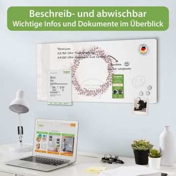 FUNKTION: Die banjado Magnettafel 78x37 cm im Design Motiv Blätterkranz vereint Funktionalität und modernes Wohndesign auf stilvolle Weise. Diese hochwertige Magnetwand aus Metall hilft Ihnen dabei, Notizen, Fotos, Termine, Einkaufslisten oder Rezepte übersichtlich zu organisieren. Als praktisches Memoboard sorgt sie für Struktur im Alltag und setzt gleichzeitig einen dekorativen Akzent an Ihrer Wand. DESIGN: Die Metalltafel besteht aus robustem, lackiertem Stahl und ist mit allen handelsüblichen Magneten nutzbar. Besonders praktisch ist die beschreibbare Oberfläche. Sie können die Magnettafel ganz einfach mit Kreidestiften beschriften und die Inhalte bei Bedarf mit einem feuchten Tuch wieder entfernen. So eignet sich das Memoboard ideal für Wochenpläne, Menüpläne, To Do Listen oder kreative Botschaften. DETAILS: Mit ihrem großzügigen Querformat von 78x37 cm bietet die Magnettafel ausreichend Platz für Ihre Organisation. Das Motiv Motiv Blätterkranz bringt eine warme, natürliche Optik in Küche, Flur, Büro oder Homeoffice und wirkt auch ohne Magnete oder Beschriftung wie ein modernes Wandbild. NUTZEN: Auf der Rückseite befinden sich vorgefertigte Löcher für eine schnelle und unkomplizierte Wandmontage. Jede banjado Magnettafel wird in Deutschland gefertigt und steht für Qualität, Langlebigkeit und liebevolle Verarbeitung. Dieses beschreibbare Memoboard ist die perfekte Kombination aus Metalltafel, Designobjekt und praktischer Magnetwand für Ihren Alltag. BANJADO: Wir sind ein kleines Team aus dem Herzen von Sachsen. Wir fertigen alle Artikel von Hand für Sie an, Sie erhalten keine preiswerte Importware. Auf Wunsch können Sie auch Ihr eigenes Foto auf die Magnettafel aufbringen, schreiben Sie uns an. Herzlichst, Ihr banjado-Team
