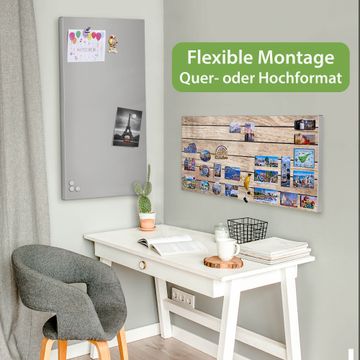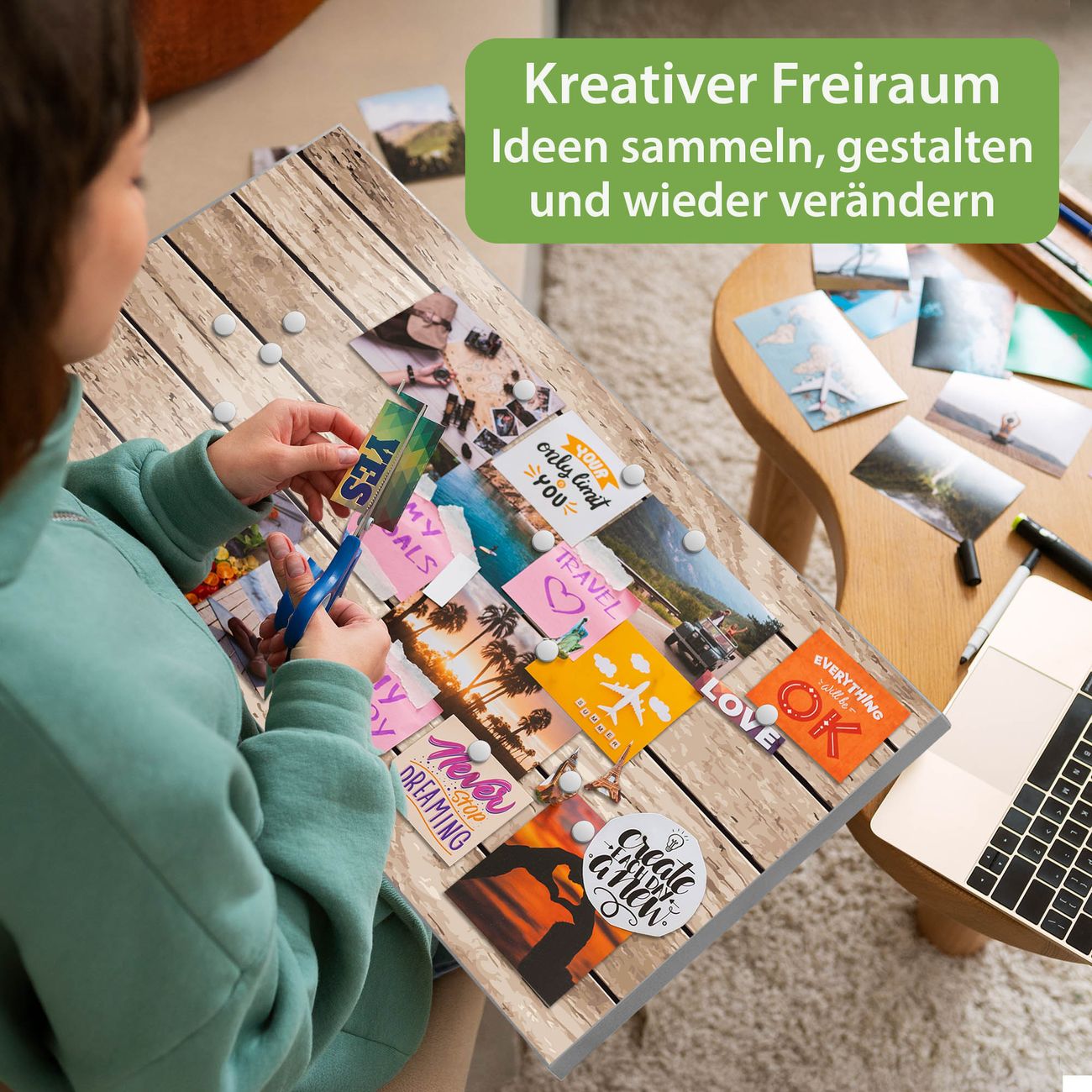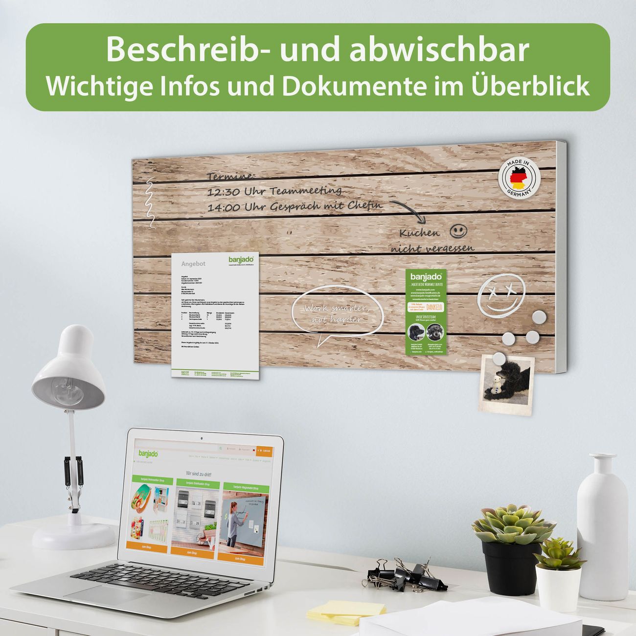 FUNKTION: Die banjado Magnettafel 78x37 cm im Design Motiv Blasse Holzlatten vereint Funktionalität und modernes Wohndesign auf stilvolle Weise. Diese hochwertige Magnetwand aus Metall hilft Ihnen dabei, Notizen, Fotos, Termine, Einkaufslisten oder Rezepte übersichtlich zu organisieren. Als praktisches Memoboard sorgt sie für Struktur im Alltag und setzt gleichzeitig einen dekorativen Akzent an Ihrer Wand. DESIGN: Die Metalltafel besteht aus robustem, lackiertem Stahl und ist mit allen handelsüblichen Magneten nutzbar. Besonders praktisch ist die beschreibbare Oberfläche. Sie können die Magnettafel ganz einfach mit Kreidestiften beschriften und die Inhalte bei Bedarf mit einem feuchten Tuch wieder entfernen. So eignet sich das Memoboard ideal für Wochenpläne, Menüpläne, To Do Listen oder kreative Botschaften. DETAILS: Mit ihrem großzügigen Querformat von 78x37 cm bietet die Magnettafel ausreichend Platz für Ihre Organisation. Das Motiv Motiv Blasse Holzlatten bringt eine warme, natürliche Optik in Küche, Flur, Büro oder Homeoffice und wirkt auch ohne Magnete oder Beschriftung wie ein modernes Wandbild. NUTZEN: Auf der Rückseite befinden sich vorgefertigte Löcher für eine schnelle und unkomplizierte Wandmontage. Jede banjado Magnettafel wird in Deutschland gefertigt und steht für Qualität, Langlebigkeit und liebevolle Verarbeitung. Dieses beschreibbare Memoboard ist die perfekte Kombination aus Metalltafel, Designobjekt und praktischer Magnetwand für Ihren Alltag. BANJADO: Wir sind ein kleines Team aus dem Herzen von Sachsen. Wir fertigen alle Artikel von Hand für Sie an, Sie erhalten keine preiswerte Importware. Auf Wunsch können Sie auch Ihr eigenes Foto auf die Magnettafel aufbringen, schreiben Sie uns an. Herzlichst, Ihr banjado-Team