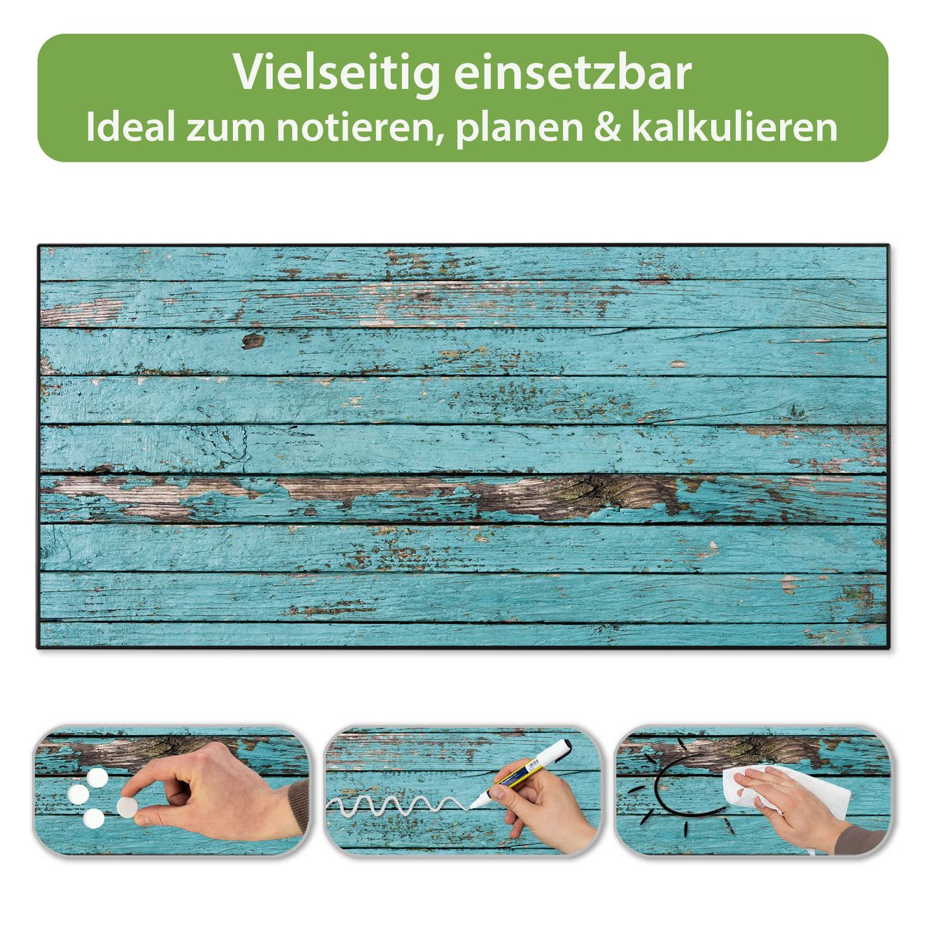 FUNKTION: Die banjado Magnettafel 78x37 cm im Design Motiv Blaue Holzlatten vereint Funktionalität und modernes Wohndesign auf stilvolle Weise. Diese hochwertige Magnetwand aus Metall hilft Ihnen dabei, Notizen, Fotos, Termine, Einkaufslisten oder Rezepte übersichtlich zu organisieren. Als praktisches Memoboard sorgt sie für Struktur im Alltag und setzt gleichzeitig einen dekorativen Akzent an Ihrer Wand. DESIGN: Die Metalltafel besteht aus robustem, lackiertem Stahl und ist mit allen handelsüblichen Magneten nutzbar. Besonders praktisch ist die beschreibbare Oberfläche. Sie können die Magnettafel ganz einfach mit Kreidestiften beschriften und die Inhalte bei Bedarf mit einem feuchten Tuch wieder entfernen. So eignet sich das Memoboard ideal für Wochenpläne, Menüpläne, To Do Listen oder kreative Botschaften. DETAILS: Mit ihrem großzügigen Querformat von 78x37 cm bietet die Magnettafel ausreichend Platz für Ihre Organisation. Das Motiv Motiv Blaue Holzlatten bringt eine warme, natürliche Optik in Küche, Flur, Büro oder Homeoffice und wirkt auch ohne Magnete oder Beschriftung wie ein modernes Wandbild. NUTZEN: Auf der Rückseite befinden sich vorgefertigte Löcher für eine schnelle und unkomplizierte Wandmontage. Jede banjado Magnettafel wird in Deutschland gefertigt und steht für Qualität, Langlebigkeit und liebevolle Verarbeitung. Dieses beschreibbare Memoboard ist die perfekte Kombination aus Metalltafel, Designobjekt und praktischer Magnetwand für Ihren Alltag. BANJADO: Wir sind ein kleines Team aus dem Herzen von Sachsen. Wir fertigen alle Artikel von Hand für Sie an, Sie erhalten keine preiswerte Importware. Auf Wunsch können Sie auch Ihr eigenes Foto auf die Magnettafel aufbringen, schreiben Sie uns an. Herzlichst, Ihr banjado-Team