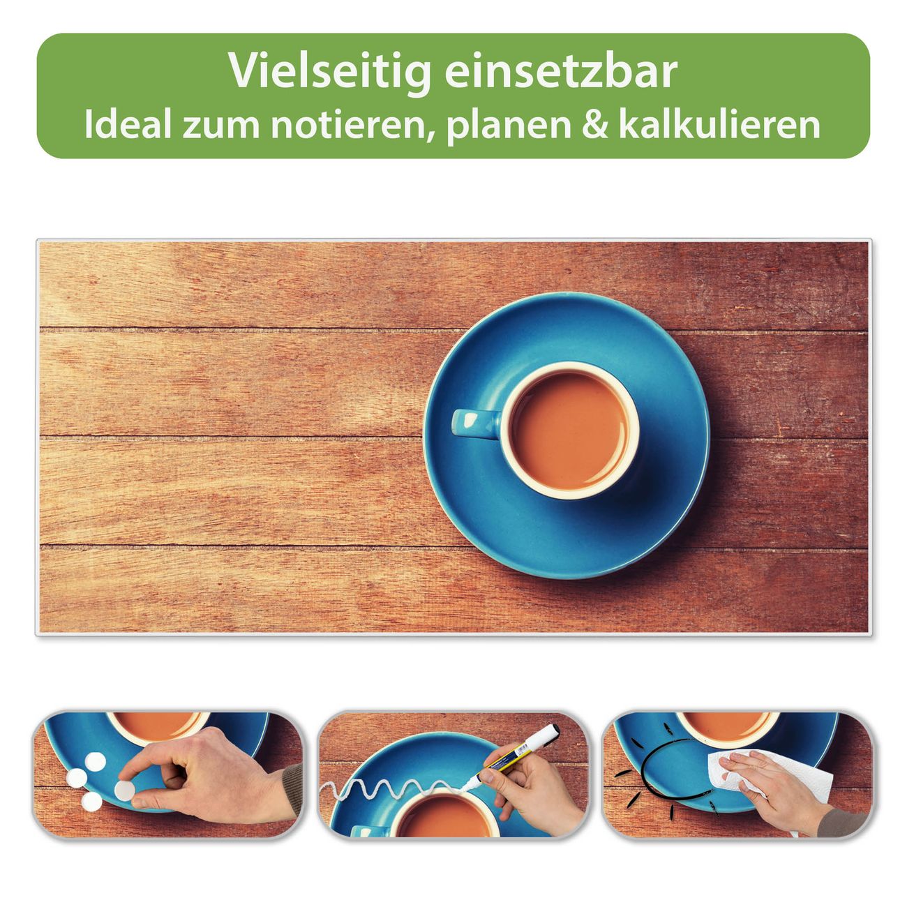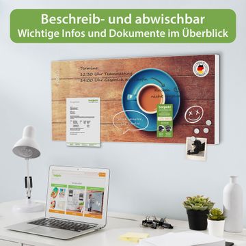 FUNKTION: Die banjado Magnettafel 78x37 cm im Design Motiv Blaue Tasse vereint Funktionalität und modernes Wohndesign auf stilvolle Weise. Diese hochwertige Magnetwand aus Metall hilft Ihnen dabei, Notizen, Fotos, Termine, Einkaufslisten oder Rezepte übersichtlich zu organisieren. Als praktisches Memoboard sorgt sie für Struktur im Alltag und setzt gleichzeitig einen dekorativen Akzent an Ihrer Wand. DESIGN: Die Metalltafel besteht aus robustem, lackiertem Stahl und ist mit allen handelsüblichen Magneten nutzbar. Besonders praktisch ist die beschreibbare Oberfläche. Sie können die Magnettafel ganz einfach mit Kreidestiften beschriften und die Inhalte bei Bedarf mit einem feuchten Tuch wieder entfernen. So eignet sich das Memoboard ideal für Wochenpläne, Menüpläne, To Do Listen oder kreative Botschaften. DETAILS: Mit ihrem großzügigen Querformat von 78x37 cm bietet die Magnettafel ausreichend Platz für Ihre Organisation. Das Motiv Motiv Blaue Tasse bringt eine warme, natürliche Optik in Küche, Flur, Büro oder Homeoffice und wirkt auch ohne Magnete oder Beschriftung wie ein modernes Wandbild. NUTZEN: Auf der Rückseite befinden sich vorgefertigte Löcher für eine schnelle und unkomplizierte Wandmontage. Jede banjado Magnettafel wird in Deutschland gefertigt und steht für Qualität, Langlebigkeit und liebevolle Verarbeitung. Dieses beschreibbare Memoboard ist die perfekte Kombination aus Metalltafel, Designobjekt und praktischer Magnetwand für Ihren Alltag. BANJADO: Wir sind ein kleines Team aus dem Herzen von Sachsen. Wir fertigen alle Artikel von Hand für Sie an, Sie erhalten keine preiswerte Importware. Auf Wunsch können Sie auch Ihr eigenes Foto auf die Magnettafel aufbringen, schreiben Sie uns an. Herzlichst, Ihr banjado-Team