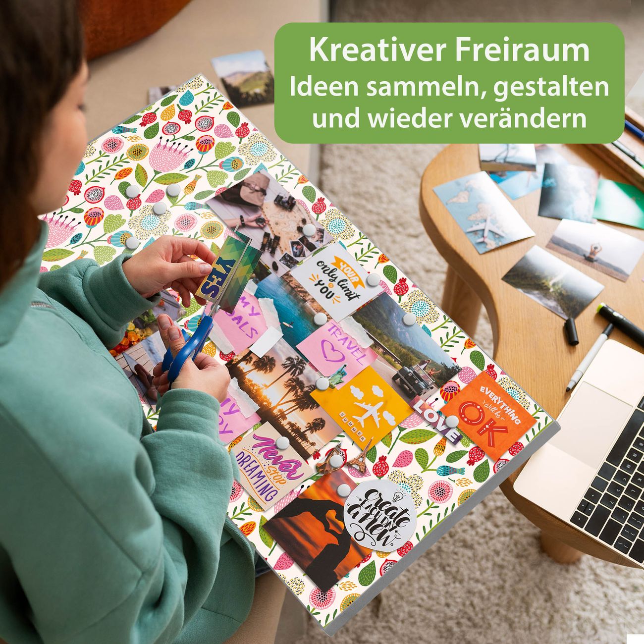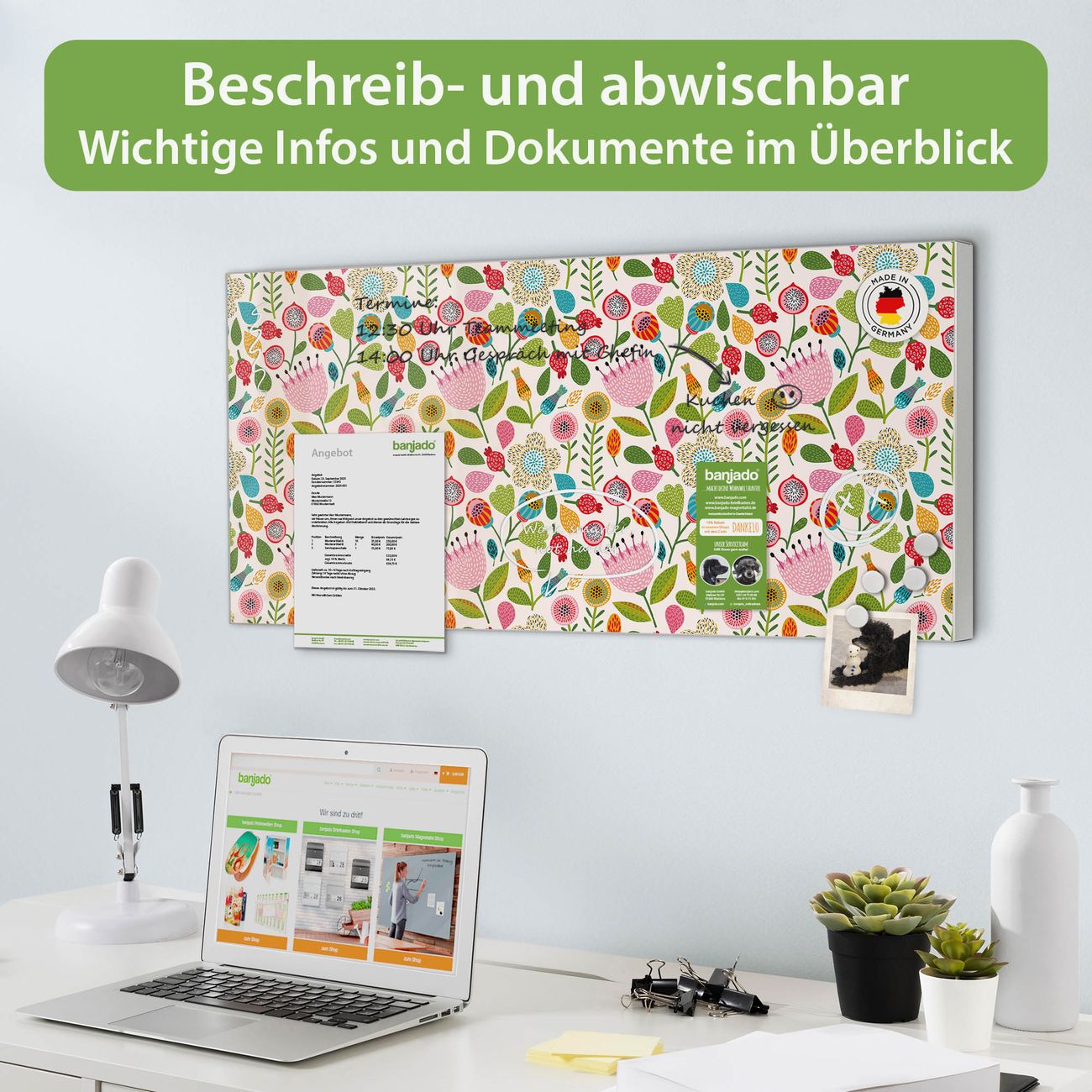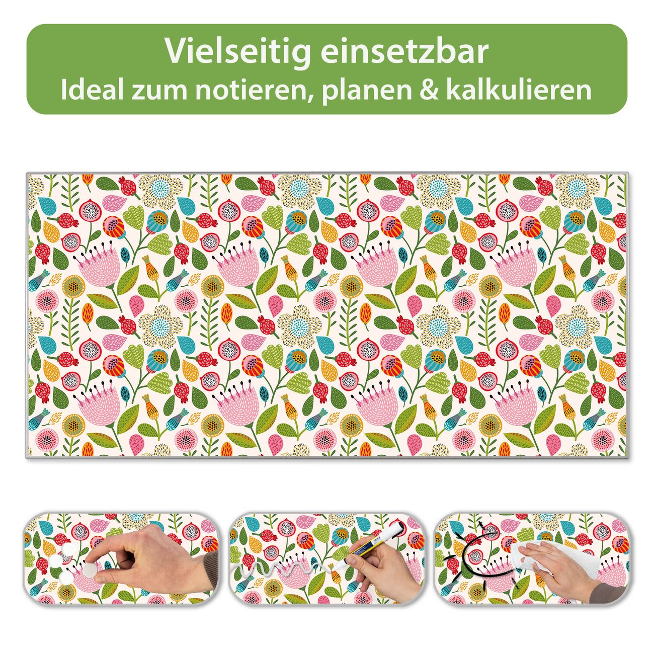 FUNKTION: Die banjado Magnettafel 78x37 cm im Design Motiv Blumen Naiv vereint Funktionalität und modernes Wohndesign auf stilvolle Weise. Diese hochwertige Magnetwand aus Metall hilft Ihnen dabei, Notizen, Fotos, Termine, Einkaufslisten oder Rezepte übersichtlich zu organisieren. Als praktisches Memoboard sorgt sie für Struktur im Alltag und setzt gleichzeitig einen dekorativen Akzent an Ihrer Wand. DESIGN: Die Metalltafel besteht aus robustem, lackiertem Stahl und ist mit allen handelsüblichen Magneten nutzbar. Besonders praktisch ist die beschreibbare Oberfläche. Sie können die Magnettafel ganz einfach mit Kreidestiften beschriften und die Inhalte bei Bedarf mit einem feuchten Tuch wieder entfernen. So eignet sich das Memoboard ideal für Wochenpläne, Menüpläne, To Do Listen oder kreative Botschaften. DETAILS: Mit ihrem großzügigen Querformat von 78x37 cm bietet die Magnettafel ausreichend Platz für Ihre Organisation. Das Motiv Motiv Blumen Naiv bringt eine warme, natürliche Optik in Küche, Flur, Büro oder Homeoffice und wirkt auch ohne Magnete oder Beschriftung wie ein modernes Wandbild. NUTZEN: Auf der Rückseite befinden sich vorgefertigte Löcher für eine schnelle und unkomplizierte Wandmontage. Jede banjado Magnettafel wird in Deutschland gefertigt und steht für Qualität, Langlebigkeit und liebevolle Verarbeitung. Dieses beschreibbare Memoboard ist die perfekte Kombination aus Metalltafel, Designobjekt und praktischer Magnetwand für Ihren Alltag. BANJADO: Wir sind ein kleines Team aus dem Herzen von Sachsen. Wir fertigen alle Artikel von Hand für Sie an, Sie erhalten keine preiswerte Importware. Auf Wunsch können Sie auch Ihr eigenes Foto auf die Magnettafel aufbringen, schreiben Sie uns an. Herzlichst, Ihr banjado-Team
