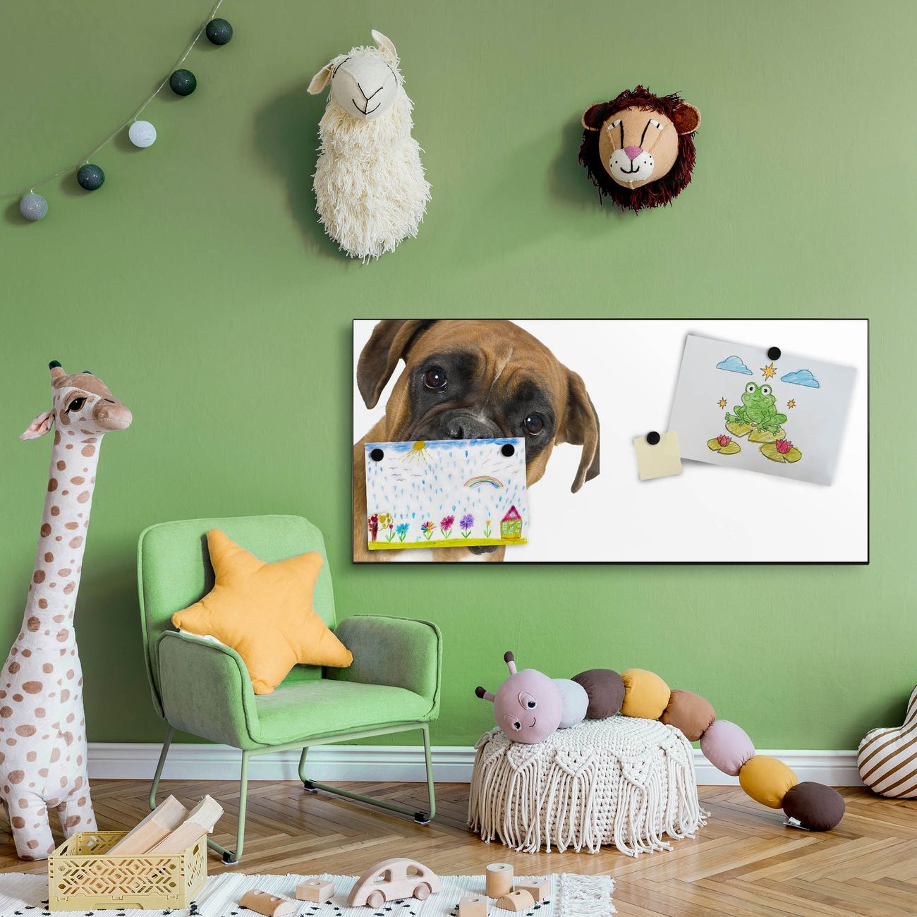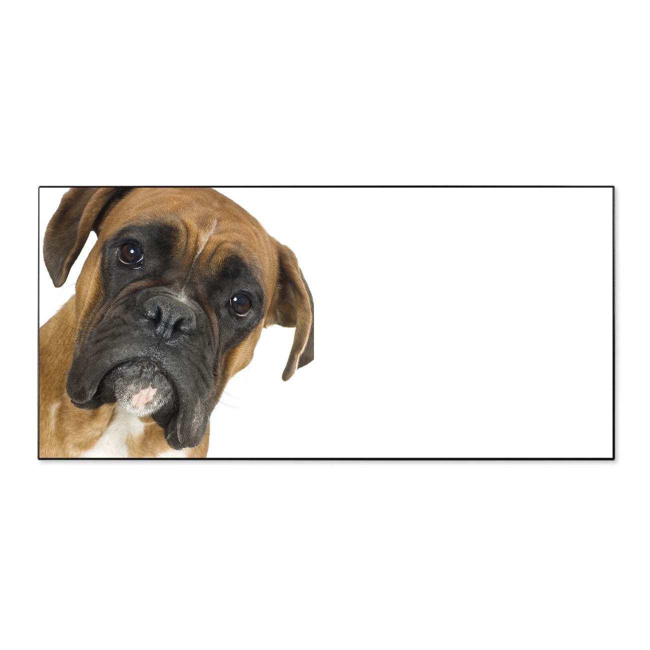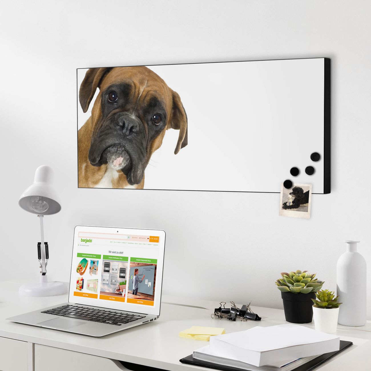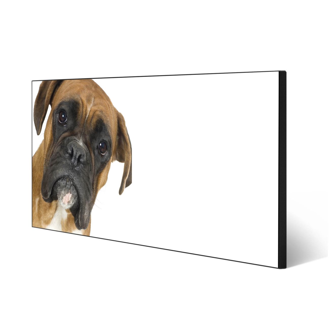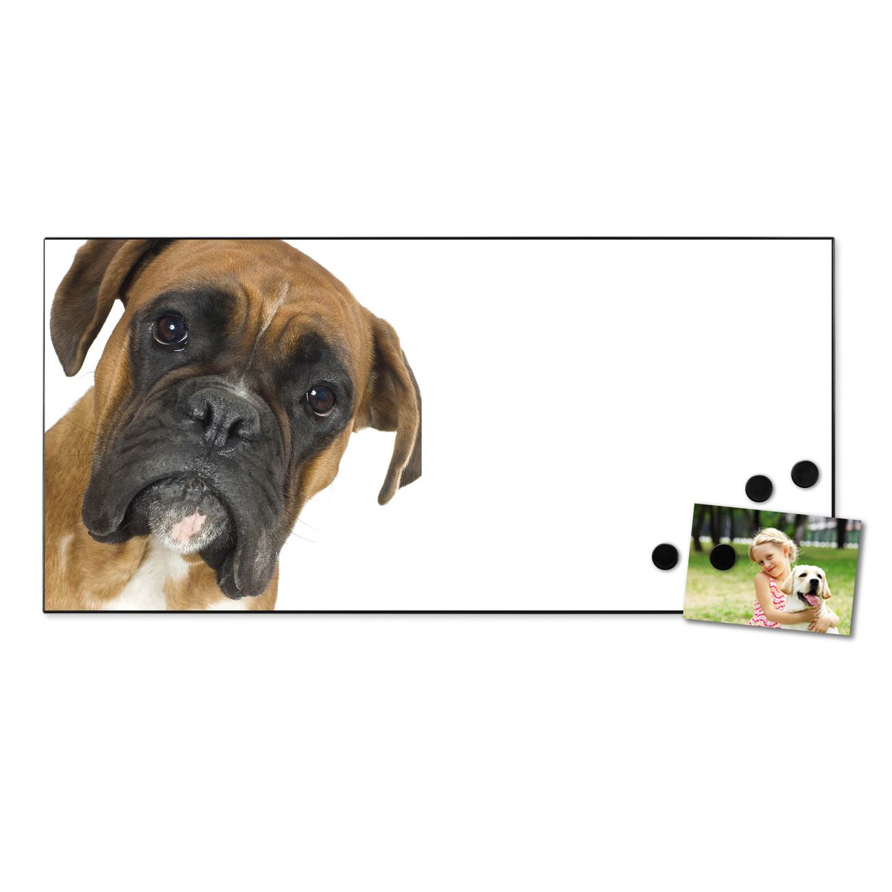 FUNKTION:  Die banjado Magnettafel mit Motiv Boxer Motiv bringt Ordnung in Ihr Zettelchaos. Fotos, Termine, Notizen oder Rezepte lassen Sich hier stilvoll mit Magneten ordnen, Sie behalten alles im Blick. An der Design Magnetwand halten alle handesüblichen Magnete. DESIGN:  Die Metall Pinnwand mit dem Motiv Motiv Boxer ist ein eleganter Begleiter im Alltag. Mit dieser Magnettafel haben Sie auch ohne Notizen und Magnete ein schönes Dekoelement. Das Format bietet Ihnen ausreichend Platz um alle wichtigen Informationen im Blick zu behalten. DETAILS: Die magnetische Pinnwand besteht aus silber-grau, weiß oder schwarz lackiertem Stahl. Sie hat eine Größe von 78cm x 37cm. Es befinden sich auf der Rückseite vorgefertigte Löcher die eine schnelle und unkomplizierte Anbringung ermöglichen. Das Motiv ist mit einem seidenmatten Laminat versehen und schützt so zusätzlich vor Kratzern. NUTZEN:  Sie können diese Magnettafel wunderbar als Wandbild nutzen, es halten alle handelsüblichen Magneten daran. Das Memoboard ist mit einem feuchten Lappen oder Schwamm abwischbar. Sie finden bei uns eine große Auswahl an passenden Magneten. BANJADO:  Wir sind ein kleines Team aus dem Herzen von Sachsen. Wir fertigen alle Artikel von Hand für Sie an, Sie erhalten keine preiswerte Importware. Auf Wunsch können Sie auch Ihr eigenes Foto auf die Magnettafel aufbringen, schreiben Sie uns an. Herzlichst, Ihr banjado-Team