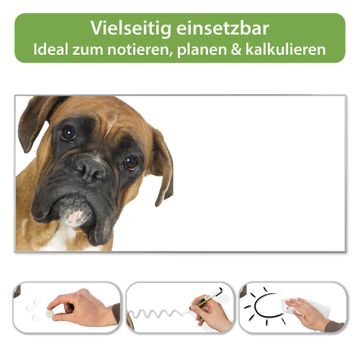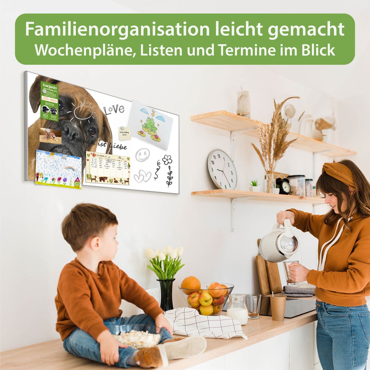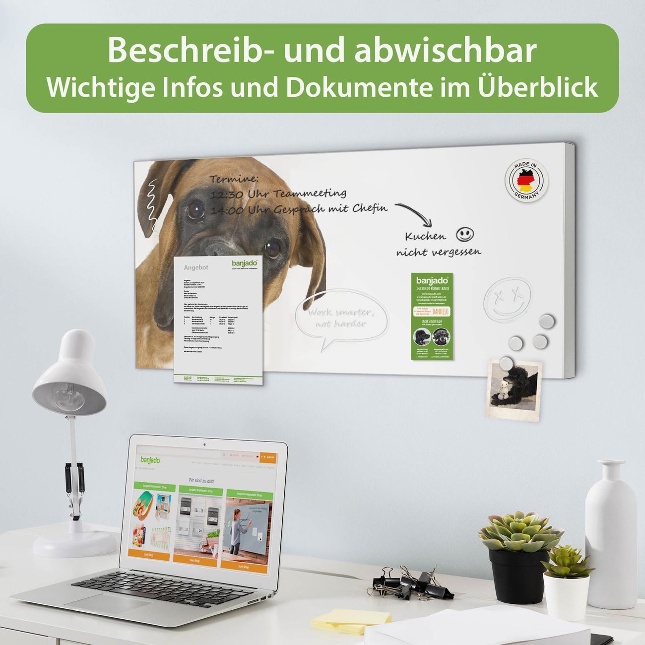 FUNKTION: Die banjado Magnettafel 78x37 cm im Design Motiv Boxer vereint Funktionalität und modernes Wohndesign auf stilvolle Weise. Diese hochwertige Magnetwand aus Metall hilft Ihnen dabei, Notizen, Fotos, Termine, Einkaufslisten oder Rezepte übersichtlich zu organisieren. Als praktisches Memoboard sorgt sie für Struktur im Alltag und setzt gleichzeitig einen dekorativen Akzent an Ihrer Wand. DESIGN: Die Metalltafel besteht aus robustem, lackiertem Stahl und ist mit allen handelsüblichen Magneten nutzbar. Besonders praktisch ist die beschreibbare Oberfläche. Sie können die Magnettafel ganz einfach mit Kreidestiften beschriften und die Inhalte bei Bedarf mit einem feuchten Tuch wieder entfernen. So eignet sich das Memoboard ideal für Wochenpläne, Menüpläne, To Do Listen oder kreative Botschaften. DETAILS: Mit ihrem großzügigen Querformat von 78x37 cm bietet die Magnettafel ausreichend Platz für Ihre Organisation. Das Motiv Motiv Boxer bringt eine warme, natürliche Optik in Küche, Flur, Büro oder Homeoffice und wirkt auch ohne Magnete oder Beschriftung wie ein modernes Wandbild. NUTZEN: Auf der Rückseite befinden sich vorgefertigte Löcher für eine schnelle und unkomplizierte Wandmontage. Jede banjado Magnettafel wird in Deutschland gefertigt und steht für Qualität, Langlebigkeit und liebevolle Verarbeitung. Dieses beschreibbare Memoboard ist die perfekte Kombination aus Metalltafel, Designobjekt und praktischer Magnetwand für Ihren Alltag. BANJADO: Wir sind ein kleines Team aus dem Herzen von Sachsen. Wir fertigen alle Artikel von Hand für Sie an, Sie erhalten keine preiswerte Importware. Auf Wunsch können Sie auch Ihr eigenes Foto auf die Magnettafel aufbringen, schreiben Sie uns an. Herzlichst, Ihr banjado-Team