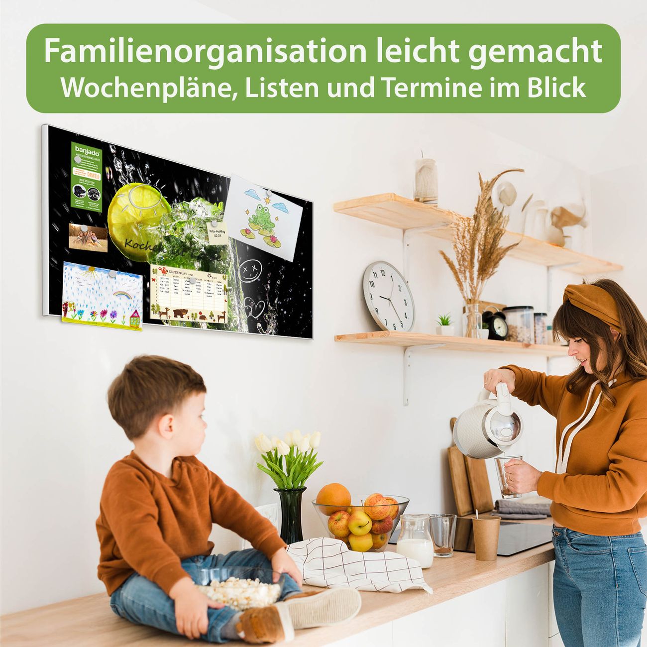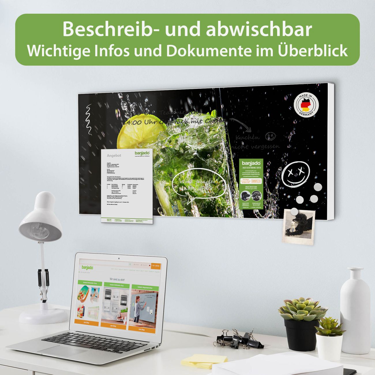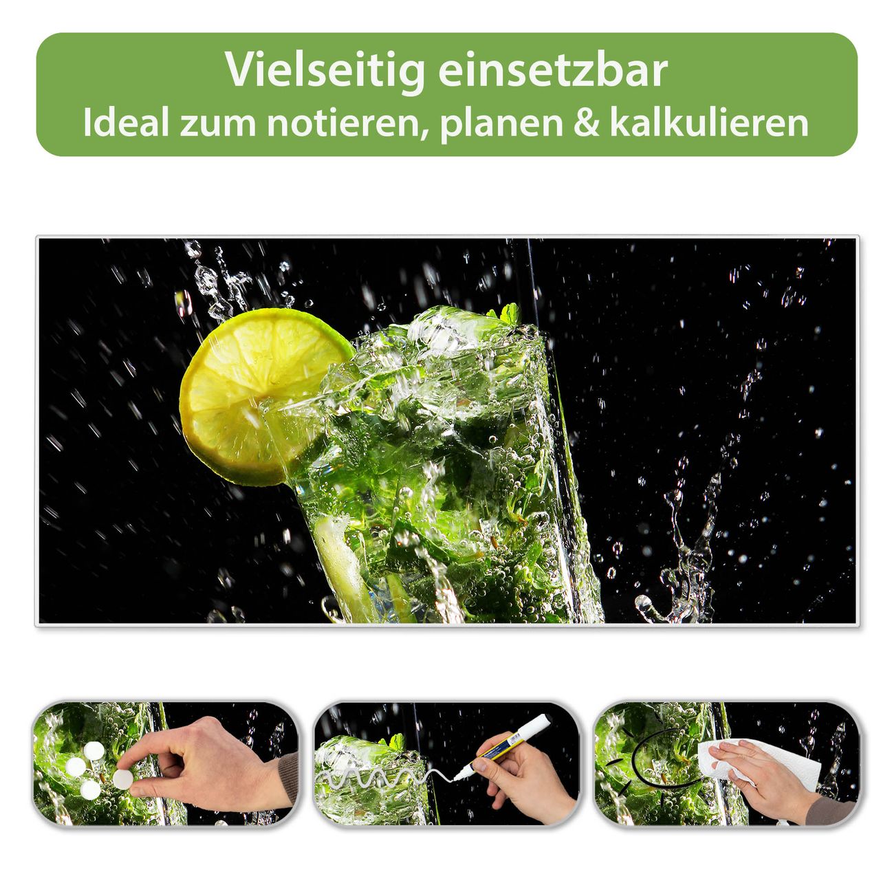 FUNKTION: Die banjado Magnettafel 78x37 cm im Design Motiv Brasilianischer Cocktail vereint Funktionalität und modernes Wohndesign auf stilvolle Weise. Diese hochwertige Magnetwand aus Metall hilft Ihnen dabei, Notizen, Fotos, Termine, Einkaufslisten oder Rezepte übersichtlich zu organisieren. Als praktisches Memoboard sorgt sie für Struktur im Alltag und setzt gleichzeitig einen dekorativen Akzent an Ihrer Wand. DESIGN: Die Metalltafel besteht aus robustem, lackiertem Stahl und ist mit allen handelsüblichen Magneten nutzbar. Besonders praktisch ist die beschreibbare Oberfläche. Sie können die Magnettafel ganz einfach mit Kreidestiften beschriften und die Inhalte bei Bedarf mit einem feuchten Tuch wieder entfernen. So eignet sich das Memoboard ideal für Wochenpläne, Menüpläne, To Do Listen oder kreative Botschaften. DETAILS: Mit ihrem großzügigen Querformat von 78x37 cm bietet die Magnettafel ausreichend Platz für Ihre Organisation. Das Motiv Motiv Brasilianischer Cocktail bringt eine warme, natürliche Optik in Küche, Flur, Büro oder Homeoffice und wirkt auch ohne Magnete oder Beschriftung wie ein modernes Wandbild. NUTZEN: Auf der Rückseite befinden sich vorgefertigte Löcher für eine schnelle und unkomplizierte Wandmontage. Jede banjado Magnettafel wird in Deutschland gefertigt und steht für Qualität, Langlebigkeit und liebevolle Verarbeitung. Dieses beschreibbare Memoboard ist die perfekte Kombination aus Metalltafel, Designobjekt und praktischer Magnetwand für Ihren Alltag. BANJADO: Wir sind ein kleines Team aus dem Herzen von Sachsen. Wir fertigen alle Artikel von Hand für Sie an, Sie erhalten keine preiswerte Importware. Auf Wunsch können Sie auch Ihr eigenes Foto auf die Magnettafel aufbringen, schreiben Sie uns an. Herzlichst, Ihr banjado-Team
