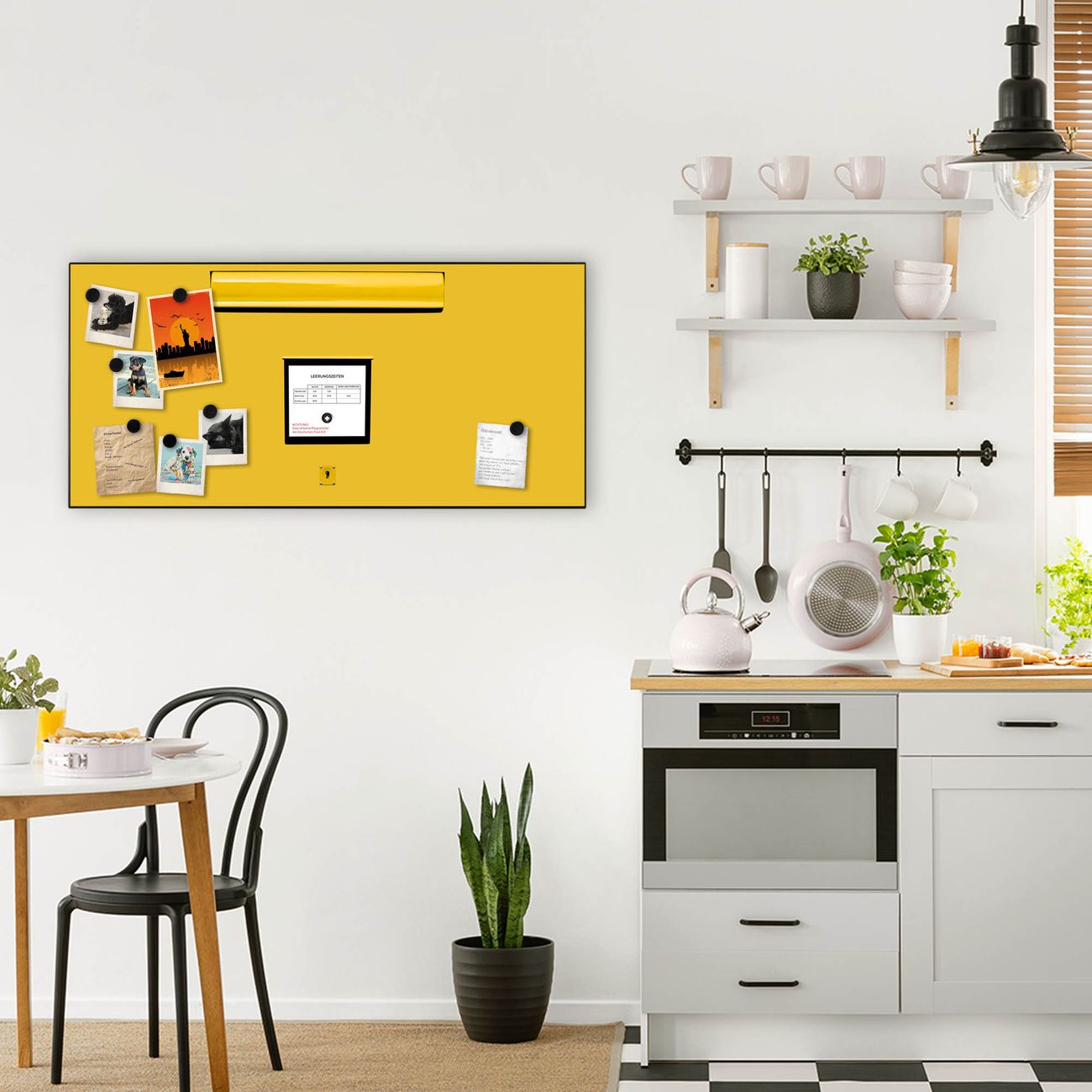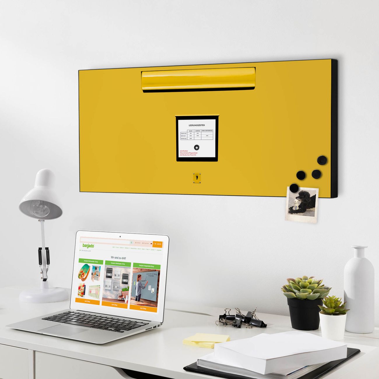 FUNKTION:  Die banjado Magnettafel mit Motiv Briefkasten Gelb Motiv bringt Ordnung in Ihr Zettelchaos. Fotos, Termine, Notizen oder Rezepte lassen Sich hier stilvoll mit Magneten ordnen, Sie behalten alles im Blick. An der Design Magnetwand halten alle handesüblichen Magnete. DESIGN:  Die Metall Pinnwand mit dem Motiv Motiv Briefkasten Gelb ist ein eleganter Begleiter im Alltag. Mit dieser Magnettafel haben Sie auch ohne Notizen und Magnete ein schönes Dekoelement. Das Format bietet Ihnen ausreichend Platz um alle wichtigen Informationen im Blick zu behalten. DETAILS: Die magnetische Pinnwand besteht aus silber-grau, weiß oder schwarz lackiertem Stahl. Sie hat eine Größe von 78cm x 37cm. Es befinden sich auf der Rückseite vorgefertigte Löcher die eine schnelle und unkomplizierte Anbringung ermöglichen. Das Motiv ist mit einem seidenmatten Laminat versehen und schützt so zusätzlich vor Kratzern. NUTZEN:  Sie können diese Magnettafel wunderbar als Wandbild nutzen, es halten alle handelsüblichen Magneten daran. Das Memoboard ist mit einem feuchten Lappen oder Schwamm abwischbar. Sie finden bei uns eine große Auswahl an passenden Magneten. BANJADO:  Wir sind ein kleines Team aus dem Herzen von Sachsen. Wir fertigen alle Artikel von Hand für Sie an, Sie erhalten keine preiswerte Importware. Auf Wunsch können Sie auch Ihr eigenes Foto auf die Magnettafel aufbringen, schreiben Sie uns an. Herzlichst, Ihr banjado-Team
