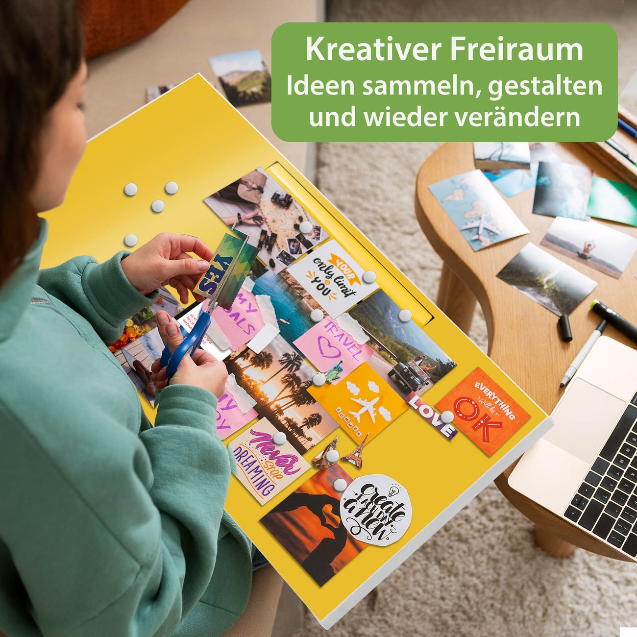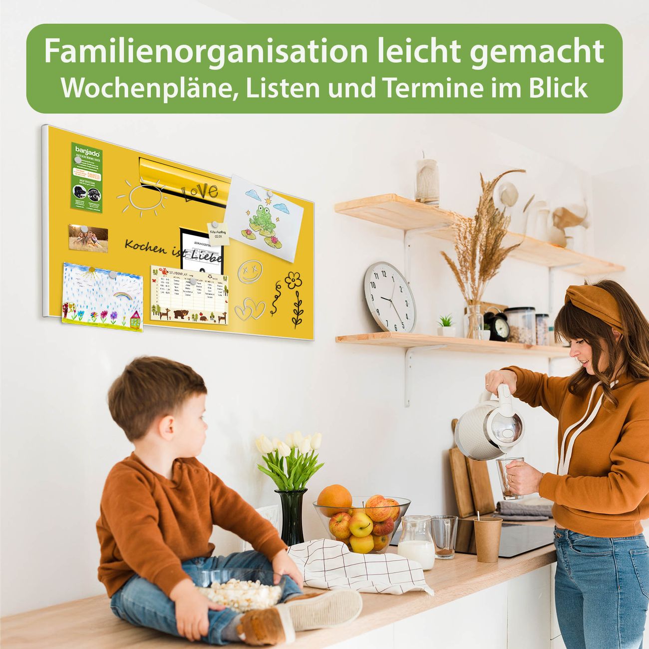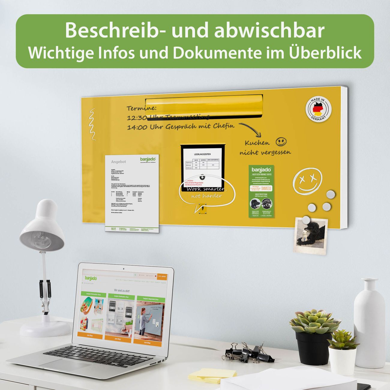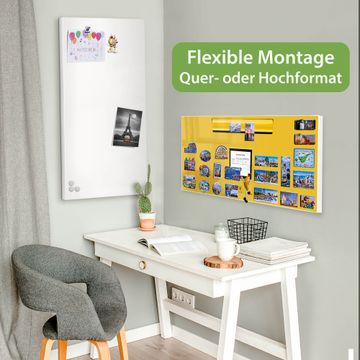 FUNKTION: Die banjado Magnettafel 78x37 cm im Design Motiv Briefkasten Gelb vereint Funktionalität und modernes Wohndesign auf stilvolle Weise. Diese hochwertige Magnetwand aus Metall hilft Ihnen dabei, Notizen, Fotos, Termine, Einkaufslisten oder Rezepte übersichtlich zu organisieren. Als praktisches Memoboard sorgt sie für Struktur im Alltag und setzt gleichzeitig einen dekorativen Akzent an Ihrer Wand. DESIGN: Die Metalltafel besteht aus robustem, lackiertem Stahl und ist mit allen handelsüblichen Magneten nutzbar. Besonders praktisch ist die beschreibbare Oberfläche. Sie können die Magnettafel ganz einfach mit Kreidestiften beschriften und die Inhalte bei Bedarf mit einem feuchten Tuch wieder entfernen. So eignet sich das Memoboard ideal für Wochenpläne, Menüpläne, To Do Listen oder kreative Botschaften. DETAILS: Mit ihrem großzügigen Querformat von 78x37 cm bietet die Magnettafel ausreichend Platz für Ihre Organisation. Das Motiv Motiv Briefkasten Gelb bringt eine warme, natürliche Optik in Küche, Flur, Büro oder Homeoffice und wirkt auch ohne Magnete oder Beschriftung wie ein modernes Wandbild. NUTZEN: Auf der Rückseite befinden sich vorgefertigte Löcher für eine schnelle und unkomplizierte Wandmontage. Jede banjado Magnettafel wird in Deutschland gefertigt und steht für Qualität, Langlebigkeit und liebevolle Verarbeitung. Dieses beschreibbare Memoboard ist die perfekte Kombination aus Metalltafel, Designobjekt und praktischer Magnetwand für Ihren Alltag. BANJADO: Wir sind ein kleines Team aus dem Herzen von Sachsen. Wir fertigen alle Artikel von Hand für Sie an, Sie erhalten keine preiswerte Importware. Auf Wunsch können Sie auch Ihr eigenes Foto auf die Magnettafel aufbringen, schreiben Sie uns an. Herzlichst, Ihr banjado-Team