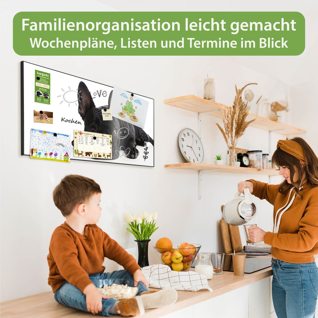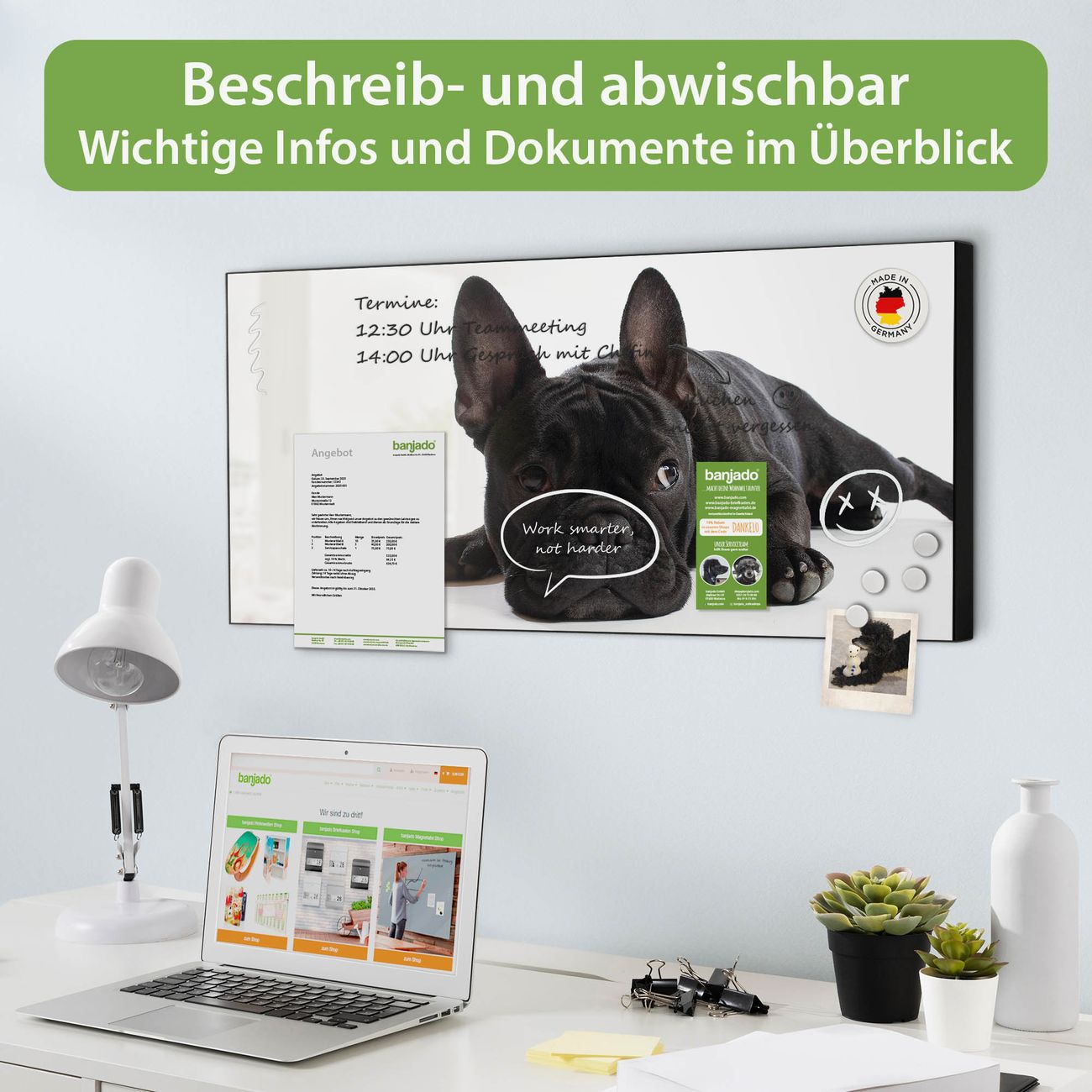 FUNKTION: Die banjado Magnettafel 78x37 cm im Design Motiv Bulldogge vereint Funktionalität und modernes Wohndesign auf stilvolle Weise. Diese hochwertige Magnetwand aus Metall hilft Ihnen dabei, Notizen, Fotos, Termine, Einkaufslisten oder Rezepte übersichtlich zu organisieren. Als praktisches Memoboard sorgt sie für Struktur im Alltag und setzt gleichzeitig einen dekorativen Akzent an Ihrer Wand. DESIGN: Die Metalltafel besteht aus robustem, lackiertem Stahl und ist mit allen handelsüblichen Magneten nutzbar. Besonders praktisch ist die beschreibbare Oberfläche. Sie können die Magnettafel ganz einfach mit Kreidestiften beschriften und die Inhalte bei Bedarf mit einem feuchten Tuch wieder entfernen. So eignet sich das Memoboard ideal für Wochenpläne, Menüpläne, To Do Listen oder kreative Botschaften. DETAILS: Mit ihrem großzügigen Querformat von 78x37 cm bietet die Magnettafel ausreichend Platz für Ihre Organisation. Das Motiv Motiv Bulldogge bringt eine warme, natürliche Optik in Küche, Flur, Büro oder Homeoffice und wirkt auch ohne Magnete oder Beschriftung wie ein modernes Wandbild. NUTZEN: Auf der Rückseite befinden sich vorgefertigte Löcher für eine schnelle und unkomplizierte Wandmontage. Jede banjado Magnettafel wird in Deutschland gefertigt und steht für Qualität, Langlebigkeit und liebevolle Verarbeitung. Dieses beschreibbare Memoboard ist die perfekte Kombination aus Metalltafel, Designobjekt und praktischer Magnetwand für Ihren Alltag. BANJADO: Wir sind ein kleines Team aus dem Herzen von Sachsen. Wir fertigen alle Artikel von Hand für Sie an, Sie erhalten keine preiswerte Importware. Auf Wunsch können Sie auch Ihr eigenes Foto auf die Magnettafel aufbringen, schreiben Sie uns an. Herzlichst, Ihr banjado-Team