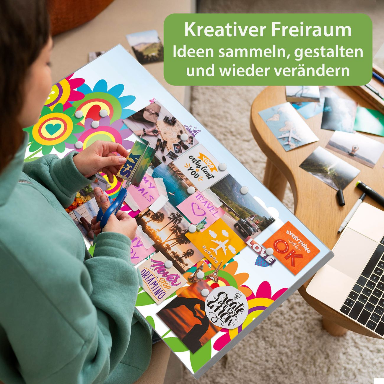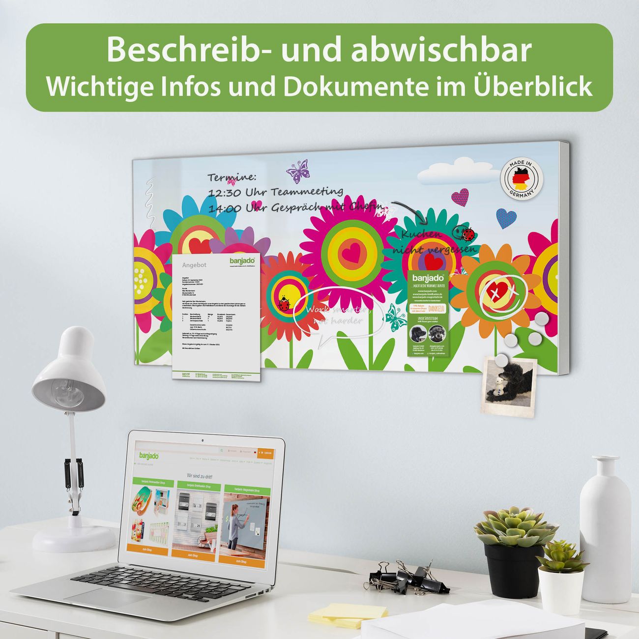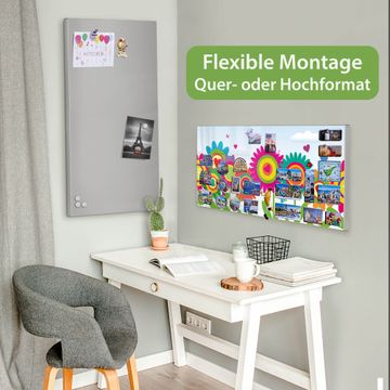 FUNKTION: Die banjado Magnettafel 78x37 cm im Design Motiv Bunte Blumen vereint Funktionalität und modernes Wohndesign auf stilvolle Weise. Diese hochwertige Magnetwand aus Metall hilft Ihnen dabei, Notizen, Fotos, Termine, Einkaufslisten oder Rezepte übersichtlich zu organisieren. Als praktisches Memoboard sorgt sie für Struktur im Alltag und setzt gleichzeitig einen dekorativen Akzent an Ihrer Wand. DESIGN: Die Metalltafel besteht aus robustem, lackiertem Stahl und ist mit allen handelsüblichen Magneten nutzbar. Besonders praktisch ist die beschreibbare Oberfläche. Sie können die Magnettafel ganz einfach mit Kreidestiften beschriften und die Inhalte bei Bedarf mit einem feuchten Tuch wieder entfernen. So eignet sich das Memoboard ideal für Wochenpläne, Menüpläne, To Do Listen oder kreative Botschaften. DETAILS: Mit ihrem großzügigen Querformat von 78x37 cm bietet die Magnettafel ausreichend Platz für Ihre Organisation. Das Motiv Motiv Bunte Blumen bringt eine warme, natürliche Optik in Küche, Flur, Büro oder Homeoffice und wirkt auch ohne Magnete oder Beschriftung wie ein modernes Wandbild. NUTZEN: Auf der Rückseite befinden sich vorgefertigte Löcher für eine schnelle und unkomplizierte Wandmontage. Jede banjado Magnettafel wird in Deutschland gefertigt und steht für Qualität, Langlebigkeit und liebevolle Verarbeitung. Dieses beschreibbare Memoboard ist die perfekte Kombination aus Metalltafel, Designobjekt und praktischer Magnetwand für Ihren Alltag. BANJADO: Wir sind ein kleines Team aus dem Herzen von Sachsen. Wir fertigen alle Artikel von Hand für Sie an, Sie erhalten keine preiswerte Importware. Auf Wunsch können Sie auch Ihr eigenes Foto auf die Magnettafel aufbringen, schreiben Sie uns an. Herzlichst, Ihr banjado-Team