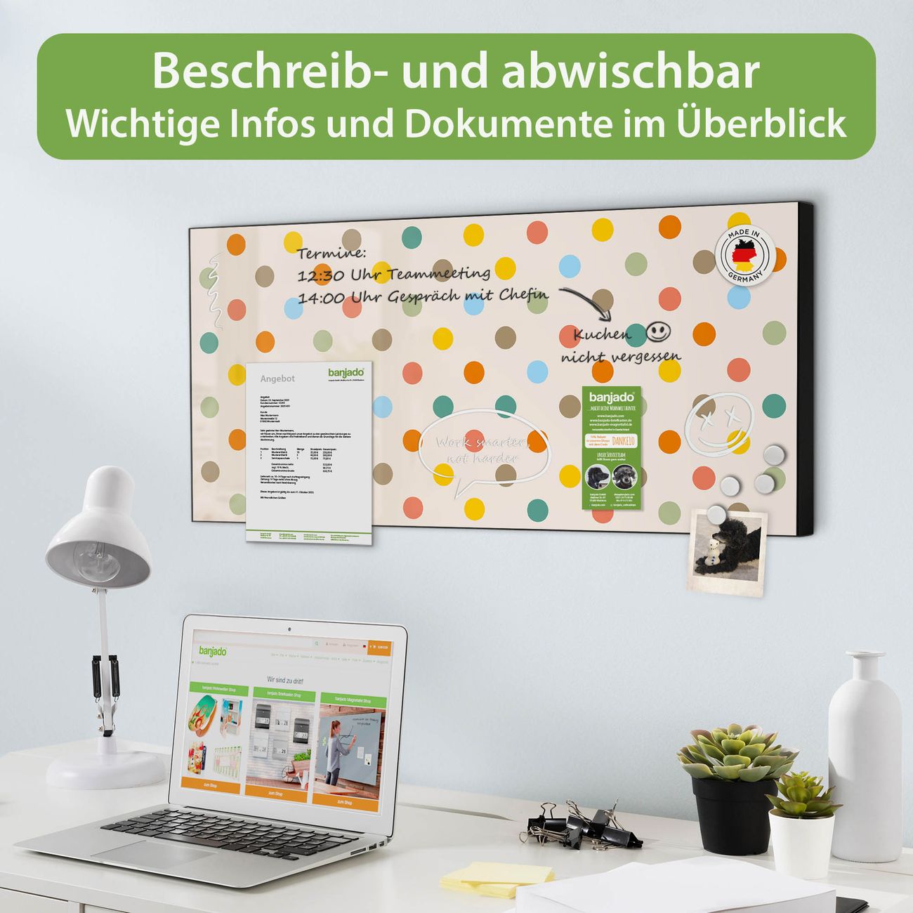 FUNKTION: Die banjado Magnettafel 78x37 cm im Design Motiv Bunte Punkte vereint Funktionalität und modernes Wohndesign auf stilvolle Weise. Diese hochwertige Magnetwand aus Metall hilft Ihnen dabei, Notizen, Fotos, Termine, Einkaufslisten oder Rezepte übersichtlich zu organisieren. Als praktisches Memoboard sorgt sie für Struktur im Alltag und setzt gleichzeitig einen dekorativen Akzent an Ihrer Wand. DESIGN: Die Metalltafel besteht aus robustem, lackiertem Stahl und ist mit allen handelsüblichen Magneten nutzbar. Besonders praktisch ist die beschreibbare Oberfläche. Sie können die Magnettafel ganz einfach mit Kreidestiften beschriften und die Inhalte bei Bedarf mit einem feuchten Tuch wieder entfernen. So eignet sich das Memoboard ideal für Wochenpläne, Menüpläne, To Do Listen oder kreative Botschaften. DETAILS: Mit ihrem großzügigen Querformat von 78x37 cm bietet die Magnettafel ausreichend Platz für Ihre Organisation. Das Motiv Motiv Bunte Punkte bringt eine warme, natürliche Optik in Küche, Flur, Büro oder Homeoffice und wirkt auch ohne Magnete oder Beschriftung wie ein modernes Wandbild. NUTZEN: Auf der Rückseite befinden sich vorgefertigte Löcher für eine schnelle und unkomplizierte Wandmontage. Jede banjado Magnettafel wird in Deutschland gefertigt und steht für Qualität, Langlebigkeit und liebevolle Verarbeitung. Dieses beschreibbare Memoboard ist die perfekte Kombination aus Metalltafel, Designobjekt und praktischer Magnetwand für Ihren Alltag. BANJADO: Wir sind ein kleines Team aus dem Herzen von Sachsen. Wir fertigen alle Artikel von Hand für Sie an, Sie erhalten keine preiswerte Importware. Auf Wunsch können Sie auch Ihr eigenes Foto auf die Magnettafel aufbringen, schreiben Sie uns an. Herzlichst, Ihr banjado-Team