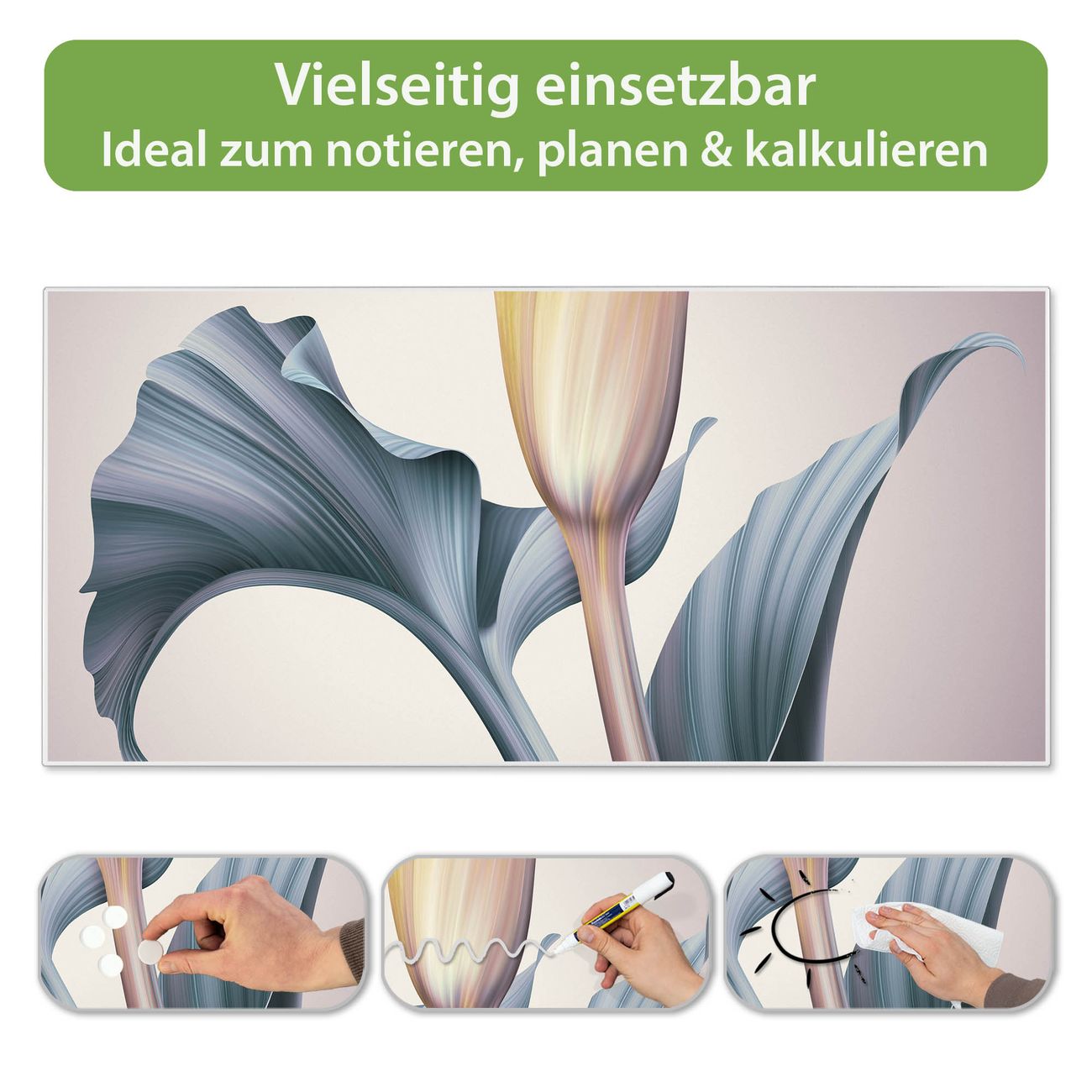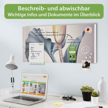FUNKTION: Die banjado Magnettafel 78x37 cm im Design Motiv Calla vereint Funktionalität und modernes Wohndesign auf stilvolle Weise. Diese hochwertige Magnetwand aus Metall hilft Ihnen dabei, Notizen, Fotos, Termine, Einkaufslisten oder Rezepte übersichtlich zu organisieren. Als praktisches Memoboard sorgt sie für Struktur im Alltag und setzt gleichzeitig einen dekorativen Akzent an Ihrer Wand. DESIGN: Die Metalltafel besteht aus robustem, lackiertem Stahl und ist mit allen handelsüblichen Magneten nutzbar. Besonders praktisch ist die beschreibbare Oberfläche. Sie können die Magnettafel ganz einfach mit Kreidestiften beschriften und die Inhalte bei Bedarf mit einem feuchten Tuch wieder entfernen. So eignet sich das Memoboard ideal für Wochenpläne, Menüpläne, To Do Listen oder kreative Botschaften. DETAILS: Mit ihrem großzügigen Querformat von 78x37 cm bietet die Magnettafel ausreichend Platz für Ihre Organisation. Das Motiv Motiv Calla bringt eine warme, natürliche Optik in Küche, Flur, Büro oder Homeoffice und wirkt auch ohne Magnete oder Beschriftung wie ein modernes Wandbild. NUTZEN: Auf der Rückseite befinden sich vorgefertigte Löcher für eine schnelle und unkomplizierte Wandmontage. Jede banjado Magnettafel wird in Deutschland gefertigt und steht für Qualität, Langlebigkeit und liebevolle Verarbeitung. Dieses beschreibbare Memoboard ist die perfekte Kombination aus Metalltafel, Designobjekt und praktischer Magnetwand für Ihren Alltag. BANJADO: Wir sind ein kleines Team aus dem Herzen von Sachsen. Wir fertigen alle Artikel von Hand für Sie an, Sie erhalten keine preiswerte Importware. Auf Wunsch können Sie auch Ihr eigenes Foto auf die Magnettafel aufbringen, schreiben Sie uns an. Herzlichst, Ihr banjado-Team