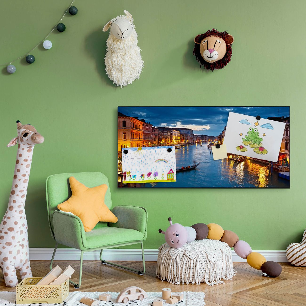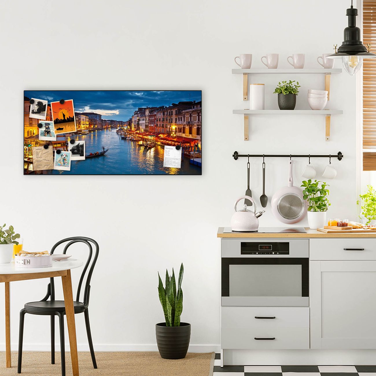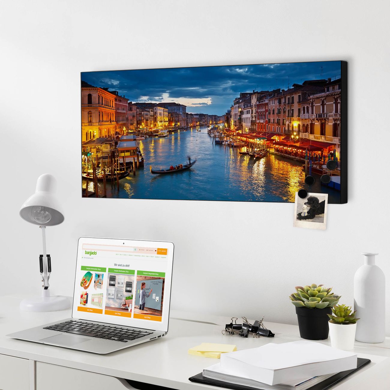 FUNKTION:  Die banjado Magnettafel mit Motiv Canale Grande Bei Nacht Motiv bringt Ordnung in Ihr Zettelchaos. Fotos, Termine, Notizen oder Rezepte lassen Sich hier stilvoll mit Magneten ordnen, Sie behalten alles im Blick. An der Design Magnetwand halten alle handesüblichen Magnete. DESIGN:  Die Metall Pinnwand mit dem Motiv Motiv Canale Grande Bei Nacht ist ein eleganter Begleiter im Alltag. Mit dieser Magnettafel haben Sie auch ohne Notizen und Magnete ein schönes Dekoelement. Das Format bietet Ihnen ausreichend Platz um alle wichtigen Informationen im Blick zu behalten. DETAILS: Die magnetische Pinnwand besteht aus silber-grau, weiß oder schwarz lackiertem Stahl. Sie hat eine Größe von 78cm x 37cm. Es befinden sich auf der Rückseite vorgefertigte Löcher die eine schnelle und unkomplizierte Anbringung ermöglichen. Das Motiv ist mit einem seidenmatten Laminat versehen und schützt so zusätzlich vor Kratzern. NUTZEN:  Sie können diese Magnettafel wunderbar als Wandbild nutzen, es halten alle handelsüblichen Magneten daran. Das Memoboard ist mit einem feuchten Lappen oder Schwamm abwischbar. Sie finden bei uns eine große Auswahl an passenden Magneten. BANJADO:  Wir sind ein kleines Team aus dem Herzen von Sachsen. Wir fertigen alle Artikel von Hand für Sie an, Sie erhalten keine preiswerte Importware. Auf Wunsch können Sie auch Ihr eigenes Foto auf die Magnettafel aufbringen, schreiben Sie uns an. Herzlichst, Ihr banjado-Team