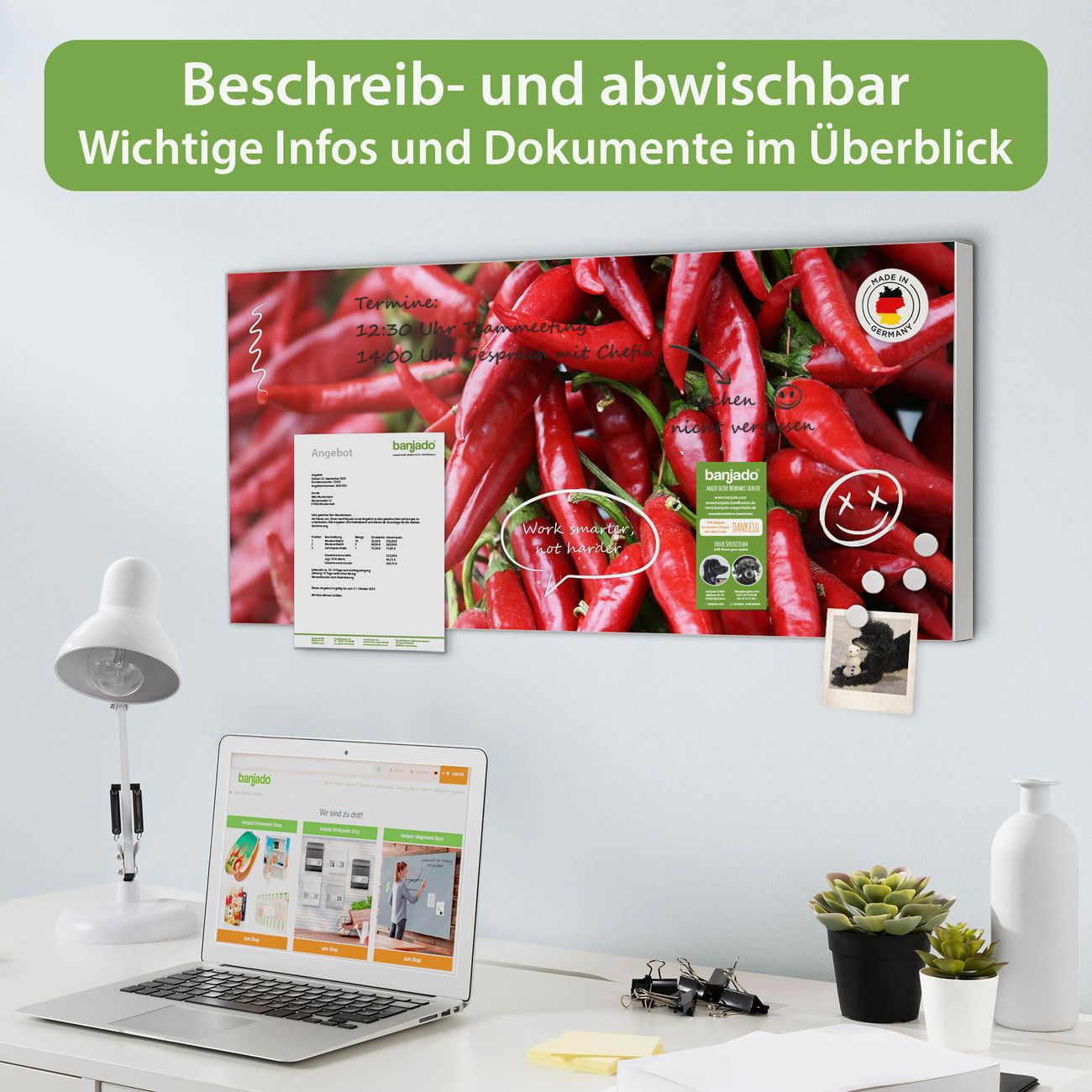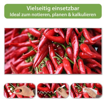 FUNKTION: Die banjado Magnettafel 78x37 cm im Design Motiv Chilli vereint Funktionalität und modernes Wohndesign auf stilvolle Weise. Diese hochwertige Magnetwand aus Metall hilft Ihnen dabei, Notizen, Fotos, Termine, Einkaufslisten oder Rezepte übersichtlich zu organisieren. Als praktisches Memoboard sorgt sie für Struktur im Alltag und setzt gleichzeitig einen dekorativen Akzent an Ihrer Wand. DESIGN: Die Metalltafel besteht aus robustem, lackiertem Stahl und ist mit allen handelsüblichen Magneten nutzbar. Besonders praktisch ist die beschreibbare Oberfläche. Sie können die Magnettafel ganz einfach mit Kreidestiften beschriften und die Inhalte bei Bedarf mit einem feuchten Tuch wieder entfernen. So eignet sich das Memoboard ideal für Wochenpläne, Menüpläne, To Do Listen oder kreative Botschaften. DETAILS: Mit ihrem großzügigen Querformat von 78x37 cm bietet die Magnettafel ausreichend Platz für Ihre Organisation. Das Motiv Motiv Chilli bringt eine warme, natürliche Optik in Küche, Flur, Büro oder Homeoffice und wirkt auch ohne Magnete oder Beschriftung wie ein modernes Wandbild. NUTZEN: Auf der Rückseite befinden sich vorgefertigte Löcher für eine schnelle und unkomplizierte Wandmontage. Jede banjado Magnettafel wird in Deutschland gefertigt und steht für Qualität, Langlebigkeit und liebevolle Verarbeitung. Dieses beschreibbare Memoboard ist die perfekte Kombination aus Metalltafel, Designobjekt und praktischer Magnetwand für Ihren Alltag. BANJADO: Wir sind ein kleines Team aus dem Herzen von Sachsen. Wir fertigen alle Artikel von Hand für Sie an, Sie erhalten keine preiswerte Importware. Auf Wunsch können Sie auch Ihr eigenes Foto auf die Magnettafel aufbringen, schreiben Sie uns an. Herzlichst, Ihr banjado-Team