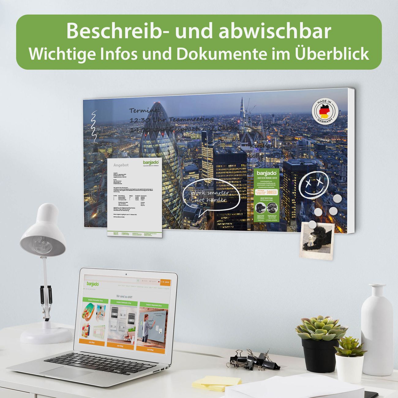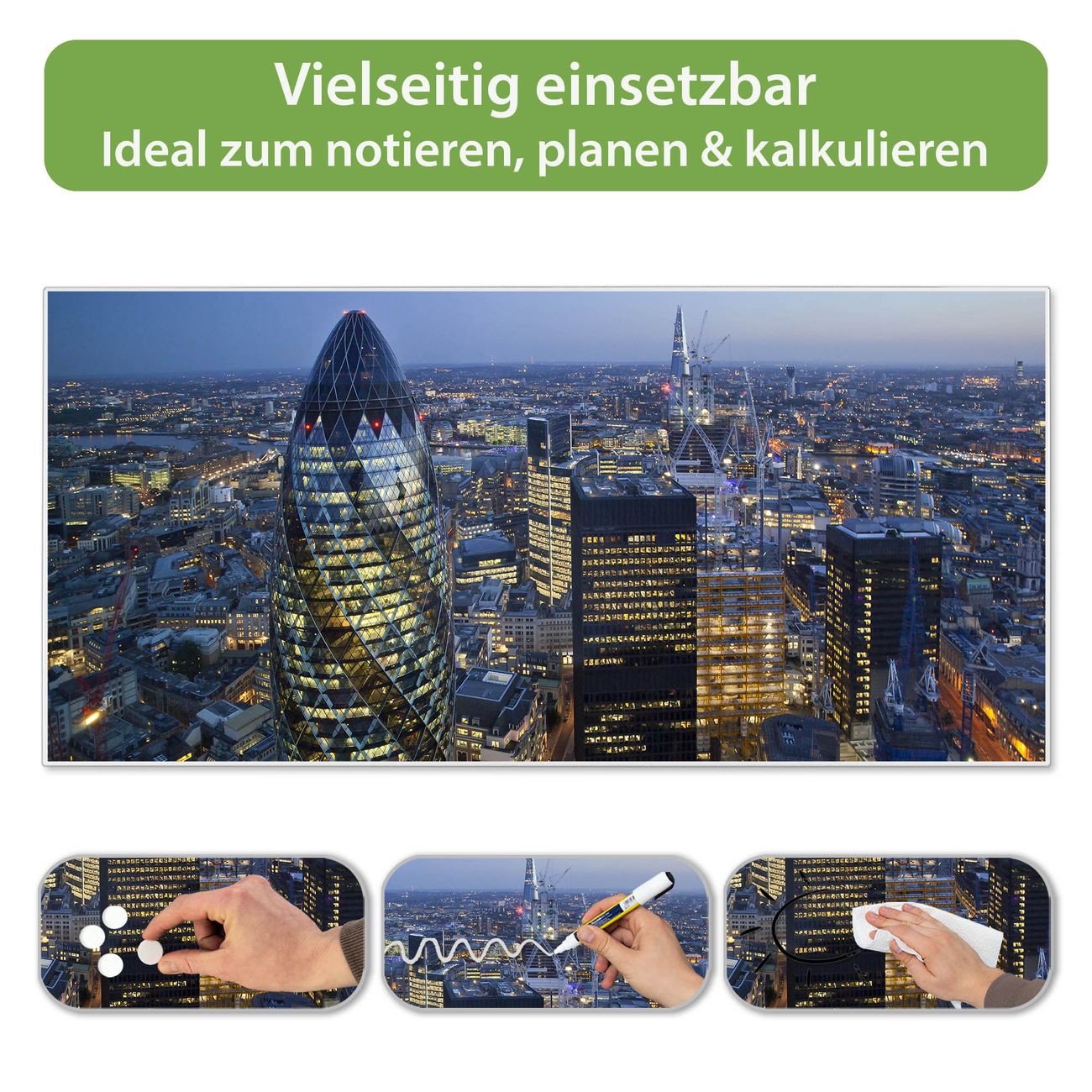 FUNKTION: Die banjado Magnettafel 78x37 cm im Design Motiv City Of London vereint Funktionalität und modernes Wohndesign auf stilvolle Weise. Diese hochwertige Magnetwand aus Metall hilft Ihnen dabei, Notizen, Fotos, Termine, Einkaufslisten oder Rezepte übersichtlich zu organisieren. Als praktisches Memoboard sorgt sie für Struktur im Alltag und setzt gleichzeitig einen dekorativen Akzent an Ihrer Wand. DESIGN: Die Metalltafel besteht aus robustem, lackiertem Stahl und ist mit allen handelsüblichen Magneten nutzbar. Besonders praktisch ist die beschreibbare Oberfläche. Sie können die Magnettafel ganz einfach mit Kreidestiften beschriften und die Inhalte bei Bedarf mit einem feuchten Tuch wieder entfernen. So eignet sich das Memoboard ideal für Wochenpläne, Menüpläne, To Do Listen oder kreative Botschaften. DETAILS: Mit ihrem großzügigen Querformat von 78x37 cm bietet die Magnettafel ausreichend Platz für Ihre Organisation. Das Motiv Motiv City Of London bringt eine warme, natürliche Optik in Küche, Flur, Büro oder Homeoffice und wirkt auch ohne Magnete oder Beschriftung wie ein modernes Wandbild. NUTZEN: Auf der Rückseite befinden sich vorgefertigte Löcher für eine schnelle und unkomplizierte Wandmontage. Jede banjado Magnettafel wird in Deutschland gefertigt und steht für Qualität, Langlebigkeit und liebevolle Verarbeitung. Dieses beschreibbare Memoboard ist die perfekte Kombination aus Metalltafel, Designobjekt und praktischer Magnetwand für Ihren Alltag. BANJADO: Wir sind ein kleines Team aus dem Herzen von Sachsen. Wir fertigen alle Artikel von Hand für Sie an, Sie erhalten keine preiswerte Importware. Auf Wunsch können Sie auch Ihr eigenes Foto auf die Magnettafel aufbringen, schreiben Sie uns an. Herzlichst, Ihr banjado-Team