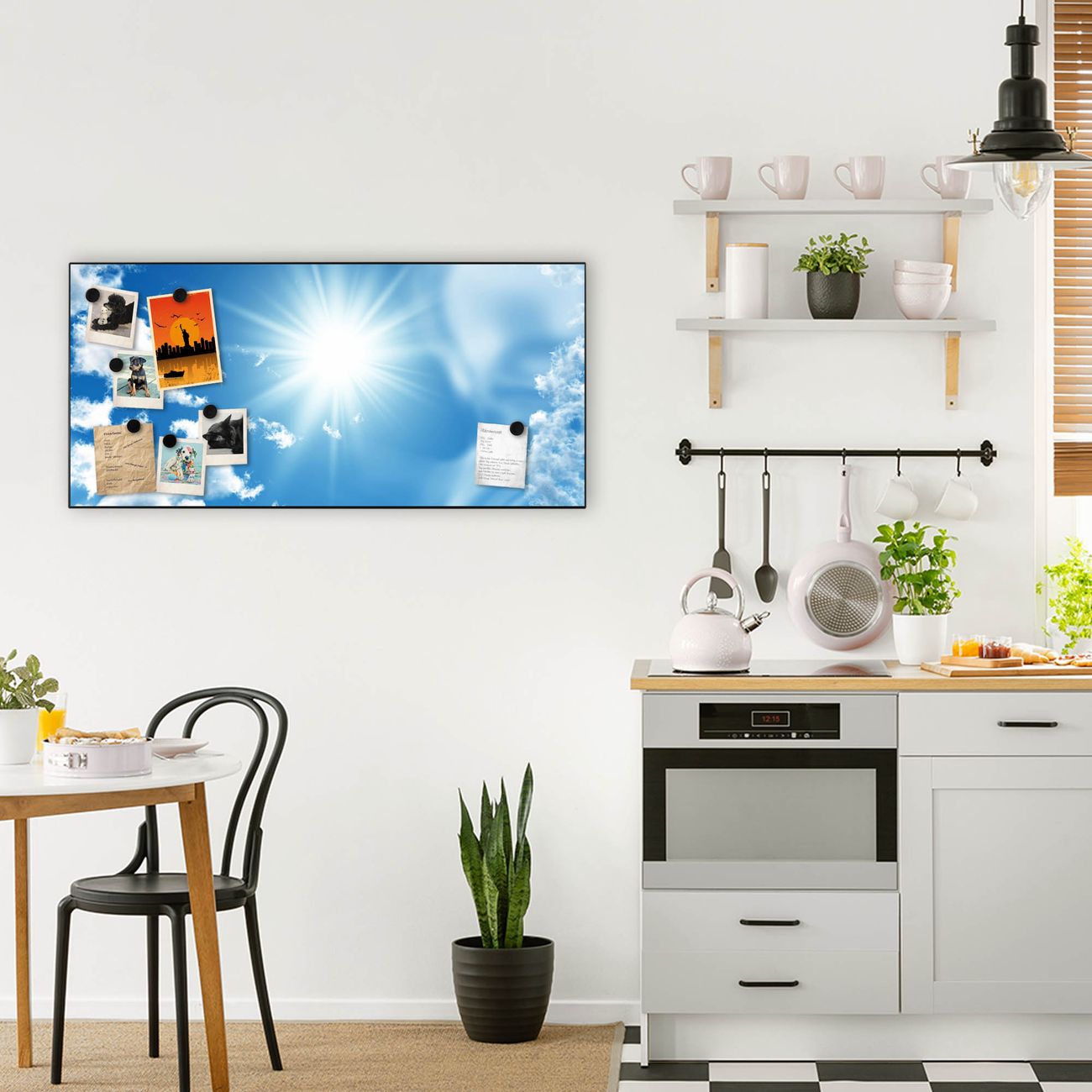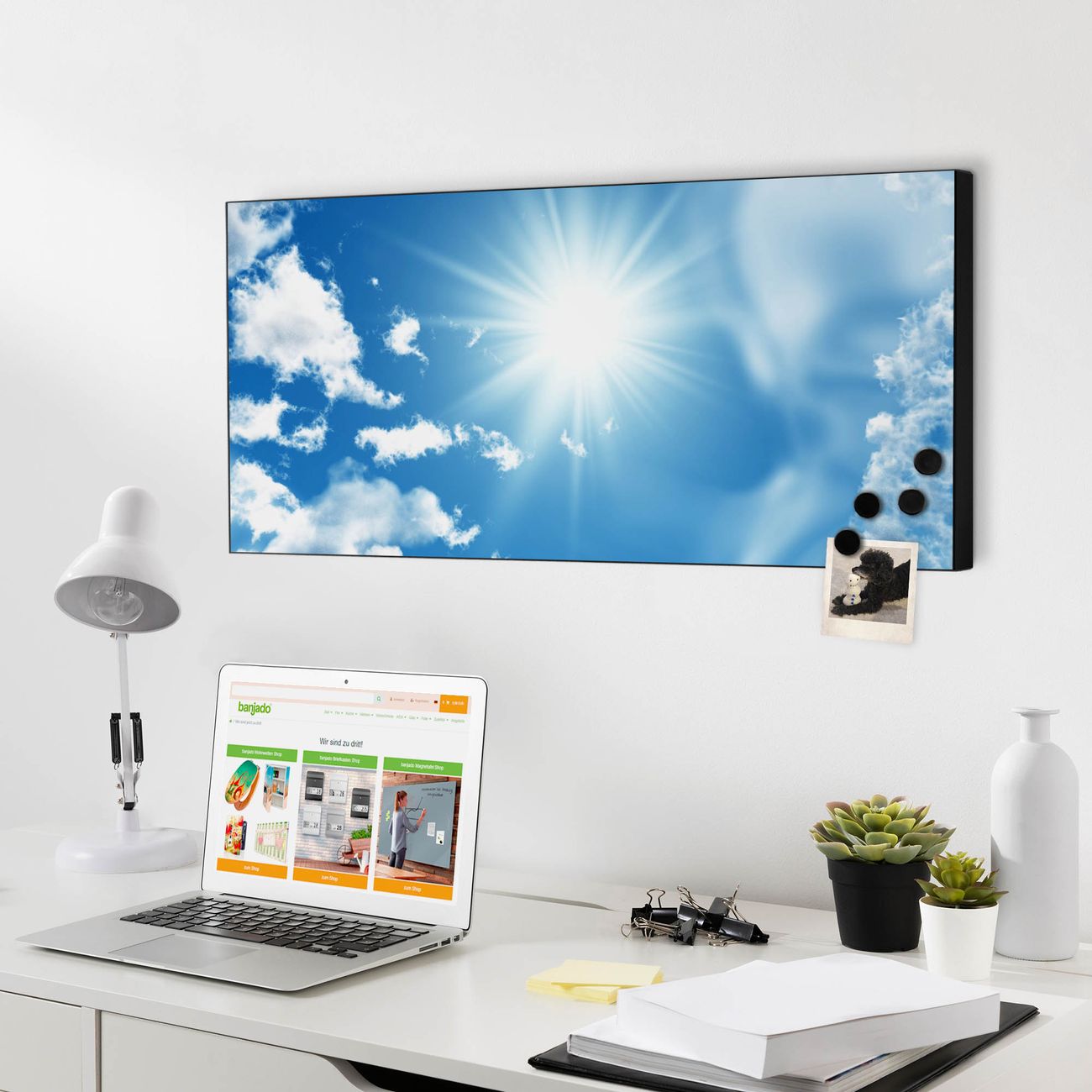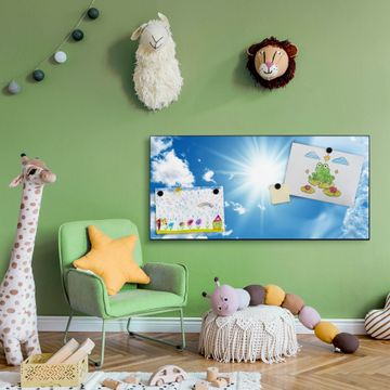 FUNKTION:  Die banjado Magnettafel mit Motiv Clouds Motiv bringt Ordnung in Ihr Zettelchaos. Fotos, Termine, Notizen oder Rezepte lassen Sich hier stilvoll mit Magneten ordnen, Sie behalten alles im Blick. An der Design Magnetwand halten alle handesüblichen Magnete. DESIGN:  Die Metall Pinnwand mit dem Motiv Motiv Clouds ist ein eleganter Begleiter im Alltag. Mit dieser Magnettafel haben Sie auch ohne Notizen und Magnete ein schönes Dekoelement. Das Format bietet Ihnen ausreichend Platz um alle wichtigen Informationen im Blick zu behalten. DETAILS: Die magnetische Pinnwand besteht aus silber-grau, weiß oder schwarz lackiertem Stahl. Sie hat eine Größe von 78cm x 37cm. Es befinden sich auf der Rückseite vorgefertigte Löcher die eine schnelle und unkomplizierte Anbringung ermöglichen. Das Motiv ist mit einem seidenmatten Laminat versehen und schützt so zusätzlich vor Kratzern. NUTZEN:  Sie können diese Magnettafel wunderbar als Wandbild nutzen, es halten alle handelsüblichen Magneten daran. Das Memoboard ist mit einem feuchten Lappen oder Schwamm abwischbar. Sie finden bei uns eine große Auswahl an passenden Magneten. BANJADO:  Wir sind ein kleines Team aus dem Herzen von Sachsen. Wir fertigen alle Artikel von Hand für Sie an, Sie erhalten keine preiswerte Importware. Auf Wunsch können Sie auch Ihr eigenes Foto auf die Magnettafel aufbringen, schreiben Sie uns an. Herzlichst, Ihr banjado-Team