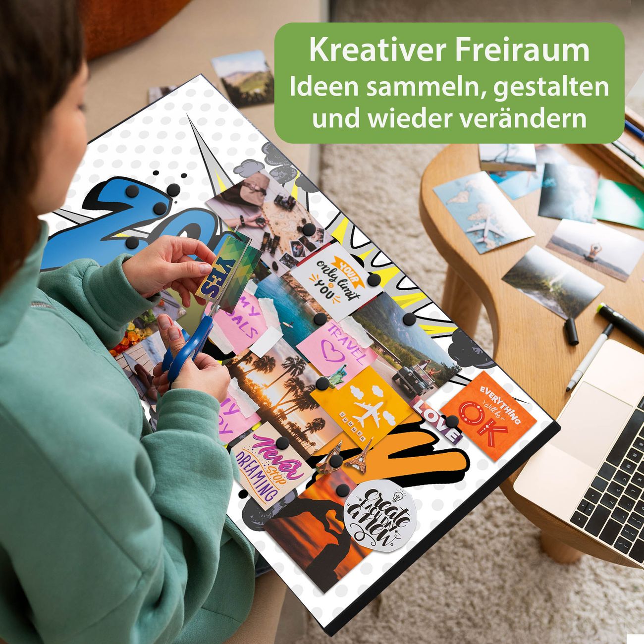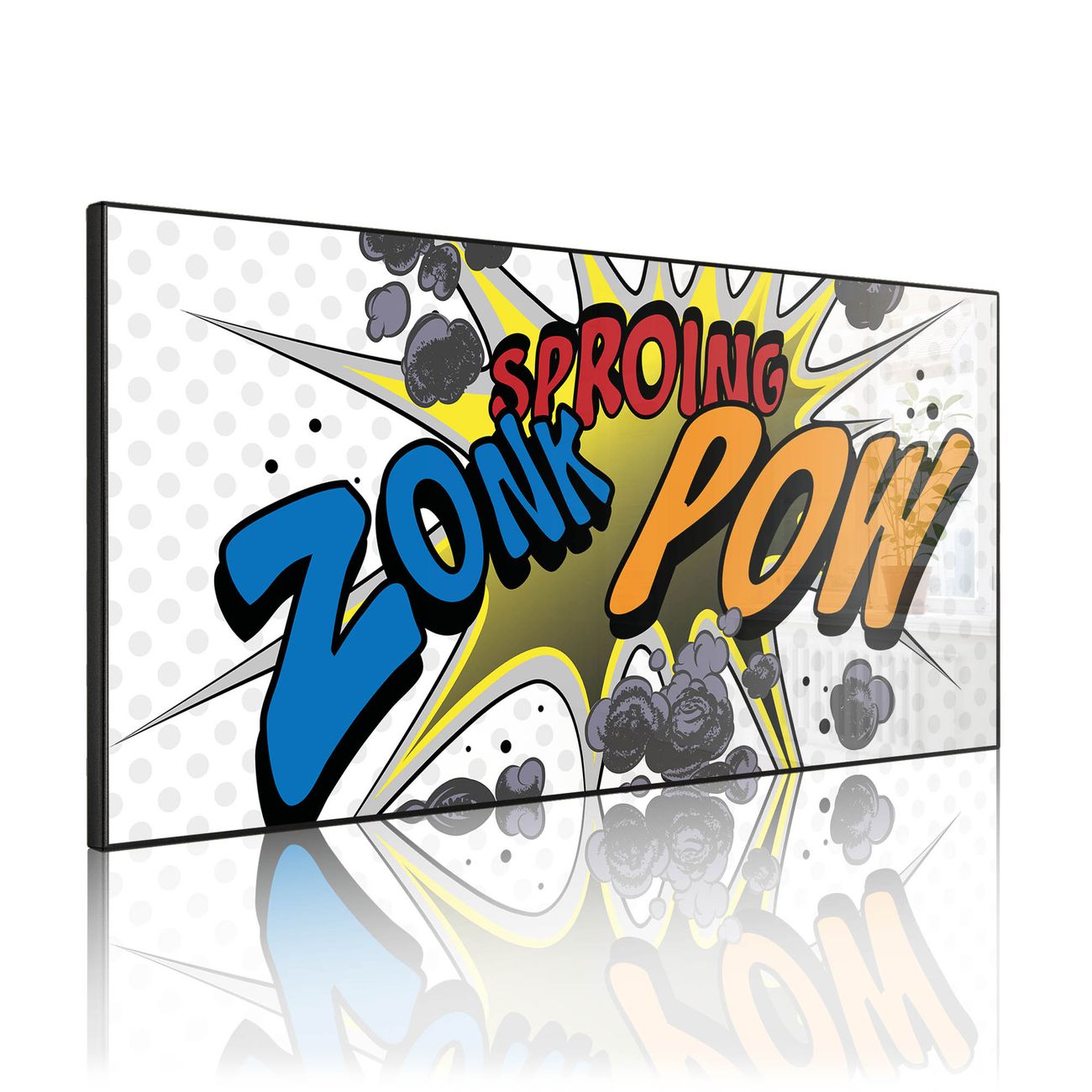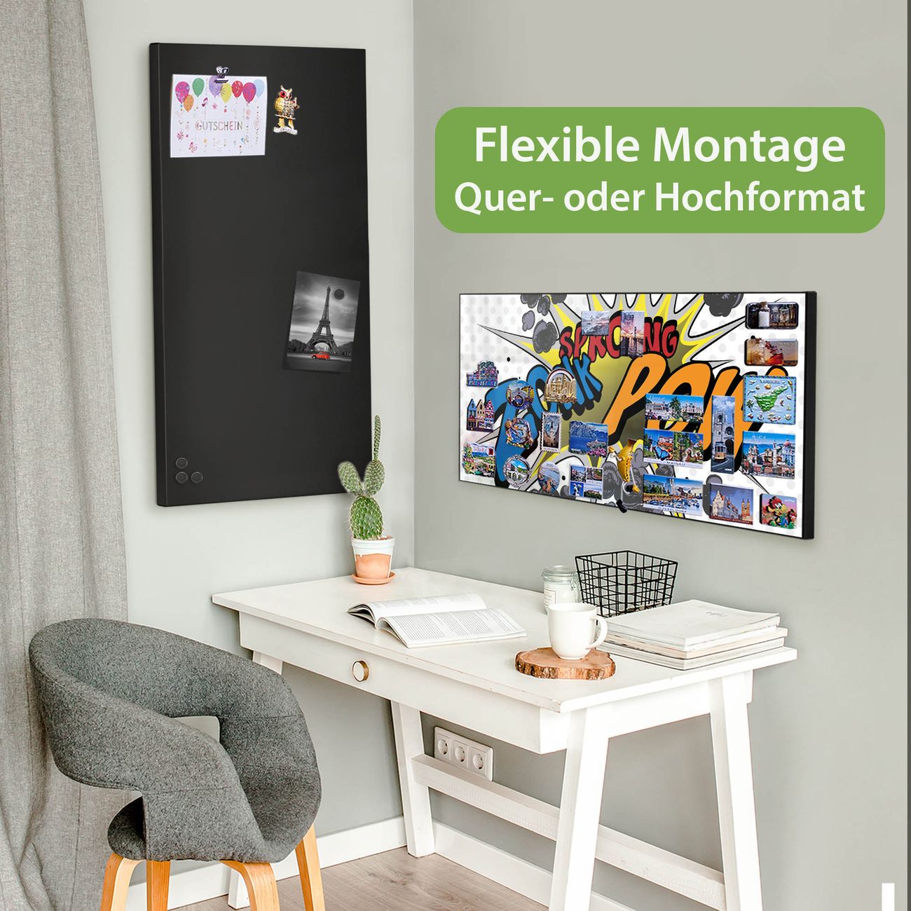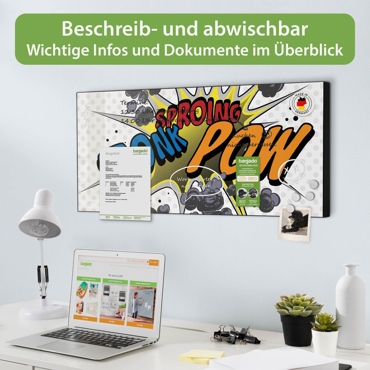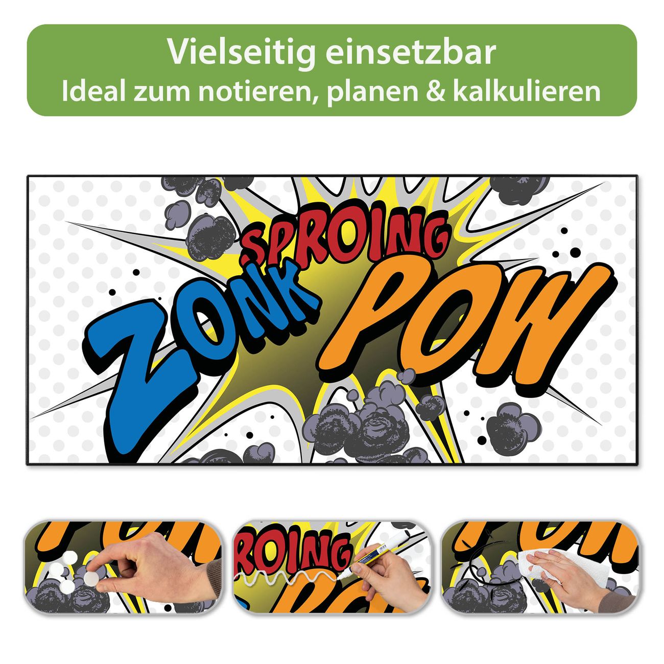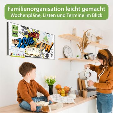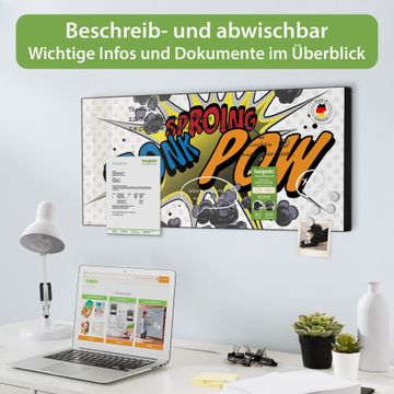 FUNKTION: Die banjado Magnettafel 78x37 cm im Design Motiv Comic vereint Funktionalität und modernes Wohndesign auf stilvolle Weise. Diese hochwertige Magnetwand aus Metall hilft Ihnen dabei, Notizen, Fotos, Termine, Einkaufslisten oder Rezepte übersichtlich zu organisieren. Als praktisches Memoboard sorgt sie für Struktur im Alltag und setzt gleichzeitig einen dekorativen Akzent an Ihrer Wand. DESIGN: Die Metalltafel besteht aus robustem, lackiertem Stahl und ist mit allen handelsüblichen Magneten nutzbar. Besonders praktisch ist die beschreibbare Oberfläche. Sie können die Magnettafel ganz einfach mit Kreidestiften beschriften und die Inhalte bei Bedarf mit einem feuchten Tuch wieder entfernen. So eignet sich das Memoboard ideal für Wochenpläne, Menüpläne, To Do Listen oder kreative Botschaften. DETAILS: Mit ihrem großzügigen Querformat von 78x37 cm bietet die Magnettafel ausreichend Platz für Ihre Organisation. Das Motiv Motiv Comic bringt eine warme, natürliche Optik in Küche, Flur, Büro oder Homeoffice und wirkt auch ohne Magnete oder Beschriftung wie ein modernes Wandbild. NUTZEN: Auf der Rückseite befinden sich vorgefertigte Löcher für eine schnelle und unkomplizierte Wandmontage. Jede banjado Magnettafel wird in Deutschland gefertigt und steht für Qualität, Langlebigkeit und liebevolle Verarbeitung. Dieses beschreibbare Memoboard ist die perfekte Kombination aus Metalltafel, Designobjekt und praktischer Magnetwand für Ihren Alltag. BANJADO: Wir sind ein kleines Team aus dem Herzen von Sachsen. Wir fertigen alle Artikel von Hand für Sie an, Sie erhalten keine preiswerte Importware. Auf Wunsch können Sie auch Ihr eigenes Foto auf die Magnettafel aufbringen, schreiben Sie uns an. Herzlichst, Ihr banjado-Team