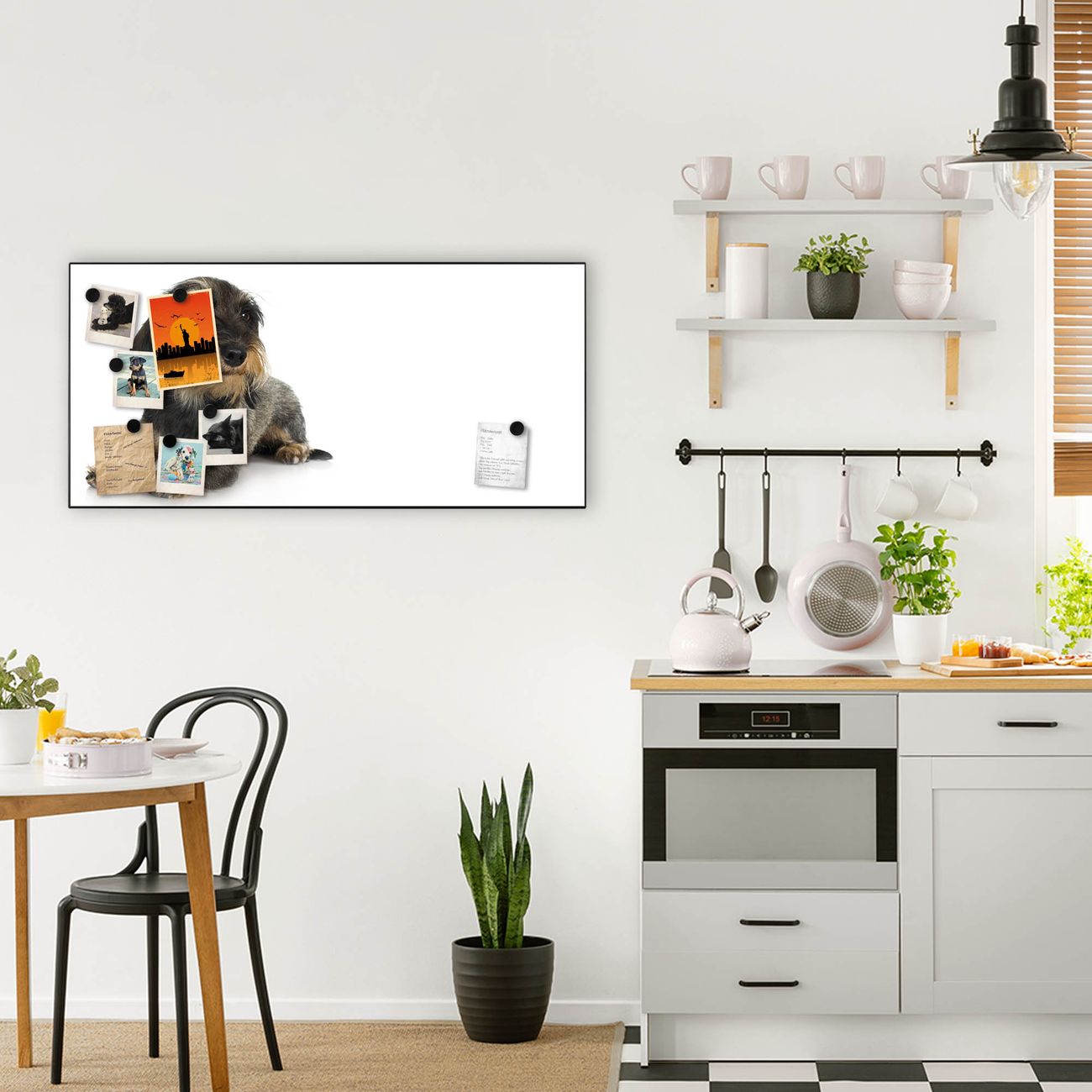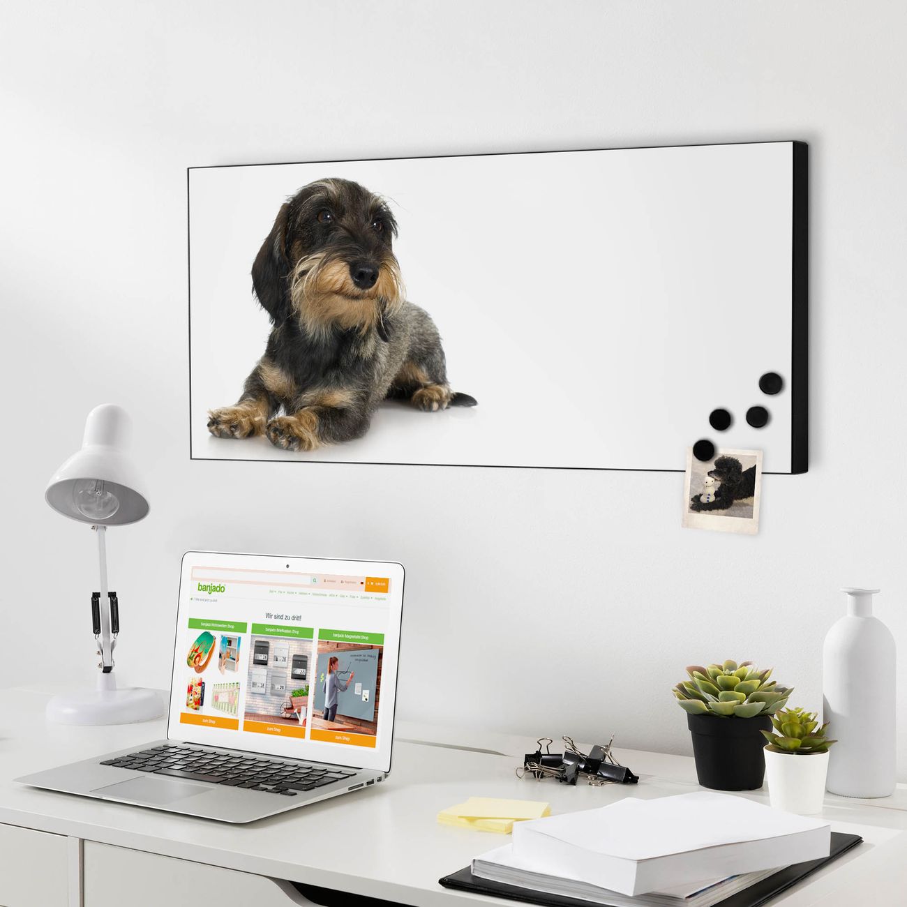 FUNKTION:  Die banjado Magnettafel mit Motiv Dackel Motiv bringt Ordnung in Ihr Zettelchaos. Fotos, Termine, Notizen oder Rezepte lassen Sich hier stilvoll mit Magneten ordnen, Sie behalten alles im Blick. An der Design Magnetwand halten alle handesüblichen Magnete. DESIGN:  Die Metall Pinnwand mit dem Motiv Motiv Dackel ist ein eleganter Begleiter im Alltag. Mit dieser Magnettafel haben Sie auch ohne Notizen und Magnete ein schönes Dekoelement. Das Format bietet Ihnen ausreichend Platz um alle wichtigen Informationen im Blick zu behalten. DETAILS: Die magnetische Pinnwand besteht aus silber-grau, weiß oder schwarz lackiertem Stahl. Sie hat eine Größe von 78cm x 37cm. Es befinden sich auf der Rückseite vorgefertigte Löcher die eine schnelle und unkomplizierte Anbringung ermöglichen. Das Motiv ist mit einem seidenmatten Laminat versehen und schützt so zusätzlich vor Kratzern. NUTZEN:  Sie können diese Magnettafel wunderbar als Wandbild nutzen, es halten alle handelsüblichen Magneten daran. Das Memoboard ist mit einem feuchten Lappen oder Schwamm abwischbar. Sie finden bei uns eine große Auswahl an passenden Magneten. BANJADO:  Wir sind ein kleines Team aus dem Herzen von Sachsen. Wir fertigen alle Artikel von Hand für Sie an, Sie erhalten keine preiswerte Importware. Auf Wunsch können Sie auch Ihr eigenes Foto auf die Magnettafel aufbringen, schreiben Sie uns an. Herzlichst, Ihr banjado-Team