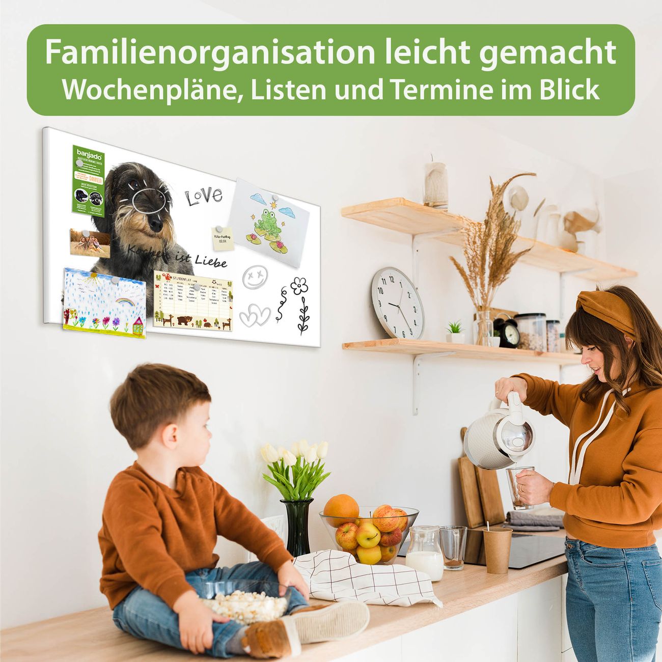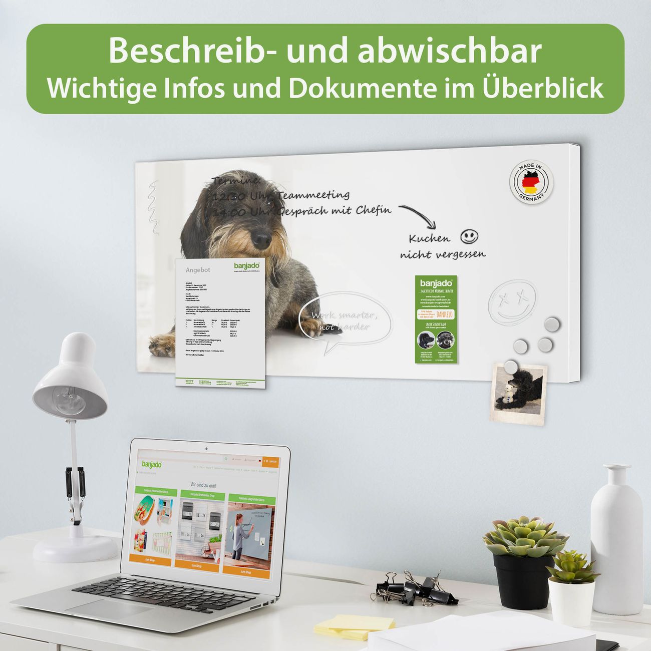 FUNKTION: Die banjado Magnettafel 78x37 cm im Design Motiv Dackel vereint Funktionalität und modernes Wohndesign auf stilvolle Weise. Diese hochwertige Magnetwand aus Metall hilft Ihnen dabei, Notizen, Fotos, Termine, Einkaufslisten oder Rezepte übersichtlich zu organisieren. Als praktisches Memoboard sorgt sie für Struktur im Alltag und setzt gleichzeitig einen dekorativen Akzent an Ihrer Wand. DESIGN: Die Metalltafel besteht aus robustem, lackiertem Stahl und ist mit allen handelsüblichen Magneten nutzbar. Besonders praktisch ist die beschreibbare Oberfläche. Sie können die Magnettafel ganz einfach mit Kreidestiften beschriften und die Inhalte bei Bedarf mit einem feuchten Tuch wieder entfernen. So eignet sich das Memoboard ideal für Wochenpläne, Menüpläne, To Do Listen oder kreative Botschaften. DETAILS: Mit ihrem großzügigen Querformat von 78x37 cm bietet die Magnettafel ausreichend Platz für Ihre Organisation. Das Motiv Motiv Dackel bringt eine warme, natürliche Optik in Küche, Flur, Büro oder Homeoffice und wirkt auch ohne Magnete oder Beschriftung wie ein modernes Wandbild. NUTZEN: Auf der Rückseite befinden sich vorgefertigte Löcher für eine schnelle und unkomplizierte Wandmontage. Jede banjado Magnettafel wird in Deutschland gefertigt und steht für Qualität, Langlebigkeit und liebevolle Verarbeitung. Dieses beschreibbare Memoboard ist die perfekte Kombination aus Metalltafel, Designobjekt und praktischer Magnetwand für Ihren Alltag. BANJADO: Wir sind ein kleines Team aus dem Herzen von Sachsen. Wir fertigen alle Artikel von Hand für Sie an, Sie erhalten keine preiswerte Importware. Auf Wunsch können Sie auch Ihr eigenes Foto auf die Magnettafel aufbringen, schreiben Sie uns an. Herzlichst, Ihr banjado-Team