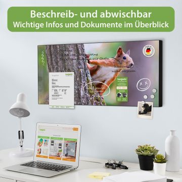 FUNKTION: Die banjado Magnettafel 78x37 cm im Design Motiv Eichhörnchen vereint Funktionalität und modernes Wohndesign auf stilvolle Weise. Diese hochwertige Magnetwand aus Metall hilft Ihnen dabei, Notizen, Fotos, Termine, Einkaufslisten oder Rezepte übersichtlich zu organisieren. Als praktisches Memoboard sorgt sie für Struktur im Alltag und setzt gleichzeitig einen dekorativen Akzent an Ihrer Wand. DESIGN: Die Metalltafel besteht aus robustem, lackiertem Stahl und ist mit allen handelsüblichen Magneten nutzbar. Besonders praktisch ist die beschreibbare Oberfläche. Sie können die Magnettafel ganz einfach mit Kreidestiften beschriften und die Inhalte bei Bedarf mit einem feuchten Tuch wieder entfernen. So eignet sich das Memoboard ideal für Wochenpläne, Menüpläne, To Do Listen oder kreative Botschaften. DETAILS: Mit ihrem großzügigen Querformat von 78x37 cm bietet die Magnettafel ausreichend Platz für Ihre Organisation. Das Motiv Motiv Eichhörnchen bringt eine warme, natürliche Optik in Küche, Flur, Büro oder Homeoffice und wirkt auch ohne Magnete oder Beschriftung wie ein modernes Wandbild. NUTZEN: Auf der Rückseite befinden sich vorgefertigte Löcher für eine schnelle und unkomplizierte Wandmontage. Jede banjado Magnettafel wird in Deutschland gefertigt und steht für Qualität, Langlebigkeit und liebevolle Verarbeitung. Dieses beschreibbare Memoboard ist die perfekte Kombination aus Metalltafel, Designobjekt und praktischer Magnetwand für Ihren Alltag. BANJADO: Wir sind ein kleines Team aus dem Herzen von Sachsen. Wir fertigen alle Artikel von Hand für Sie an, Sie erhalten keine preiswerte Importware. Auf Wunsch können Sie auch Ihr eigenes Foto auf die Magnettafel aufbringen, schreiben Sie uns an. Herzlichst, Ihr banjado-Team