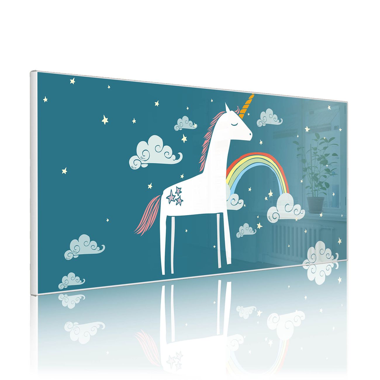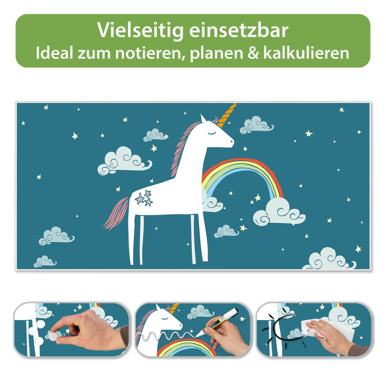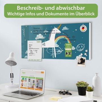 FUNKTION:  Die banjado Magnettafel mit Motiv Einhorn Motiv bringt Ordnung in Ihr Zettelchaos. Fotos, Termine, Notizen oder Rezepte lassen Sich hier stilvoll mit Magneten ordnen, Sie behalten alles im Blick. An der Design Magnetwand halten alle handesüblichen Magnete. DESIGN:  Die Metall Pinnwand mit dem Motiv Motiv Einhorn ist ein eleganter Begleiter im Alltag. Mit dieser Magnettafel haben Sie auch ohne Notizen und Magnete ein schönes Dekoelement. Das Format bietet Ihnen ausreichend Platz um alle wichtigen Informationen im Blick zu behalten. DETAILS: Die magnetische Pinnwand besteht aus silber-grau, weiß oder schwarz lackiertem Stahl. Sie hat eine Größe von 78cm x 37cm. Es befinden sich auf der Rückseite vorgefertigte Löcher die eine schnelle und unkomplizierte Anbringung ermöglichen. Das Motiv ist mit einem seidenmatten Laminat versehen und schützt so zusätzlich vor Kratzern. NUTZEN:  Sie können diese Magnettafel wunderbar als Wandbild nutzen, es halten alle handelsüblichen Magneten daran. Das Memoboard ist mit einem feuchten Lappen oder Schwamm abwischbar. Sie finden bei uns eine große Auswahl an passenden Magneten. BANJADO:  Wir sind ein kleines Team aus dem Herzen von Sachsen. Wir fertigen alle Artikel von Hand für Sie an, Sie erhalten keine preiswerte Importware. Auf Wunsch können Sie auch Ihr eigenes Foto auf die Magnettafel aufbringen, schreiben Sie uns an. Herzlichst, Ihr banjado-Team